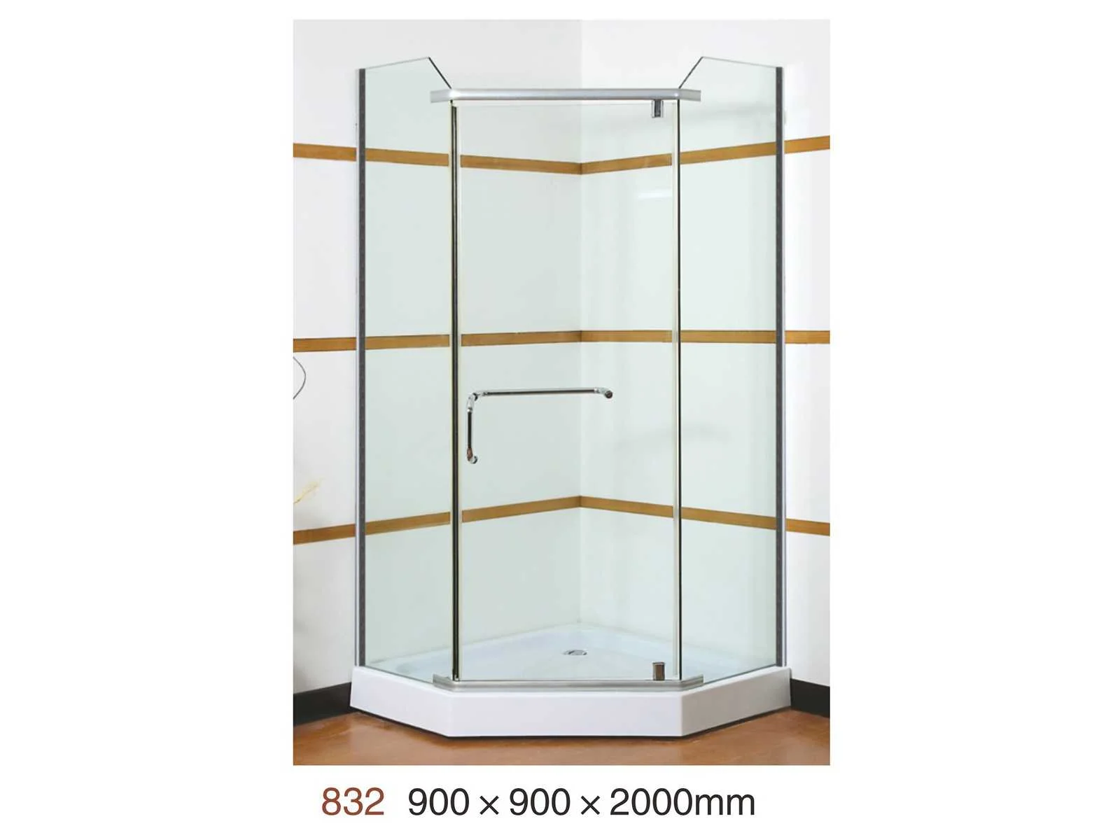 Type: 832. Model: Douchecabine vijfhoekig. Afmeting: 90x90x200cm. Voorzien van: 8mm veiligheidsglas – deurhendels – zilverkleurige details Merk: Vonato Model: Purevia Product type: Vijfhoekig Kleur: Zilverkleurig frame Lengte: 90cm Hoogte: 200cm Materiaal: RVS frame