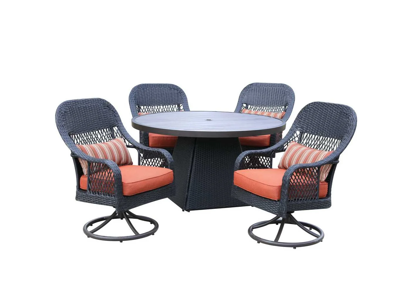 Type: REDONDA. Afmetingen: 5-delige set: 4 * Losse draaistoelen: 66x71x98 cm , 1 * Ronde eettafel: Ø138 cm, hoogte: 71 cm. Zithoogte: 47 cm. Voorzien van: Waterafstotende kussens - Weerbestendig vlechtwerk - Gat voor parasol - Draaibare stoelen Merk: VONATO Model: Solaro Product type: 5-delig Kussens: Oranje Stapelbaar: Nee Verstelbaar: 0 Vorm: rond Kleur: Antraciet Lengte: 0cm Hoogte: 71cm Materiaal: Gepoedercoat aluminium frame Zithoogte: 47