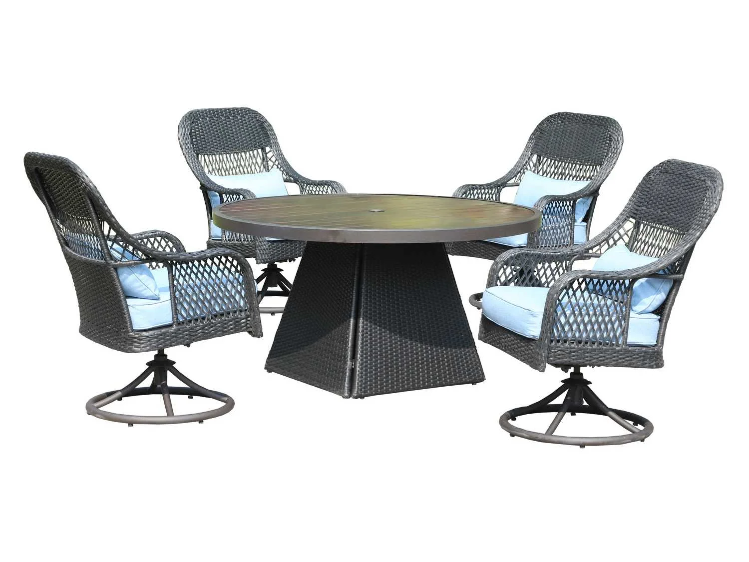 Type: REDONDA-BLUE. Afmetingen: 5-delige set: 4 * Losse draaistoelen: 66x71x98 cm , 1 * Ronde eettafel: Ø138 cm, hoogte: 71 cm. Zithoogte: 47 cm. Voorzien van: Waterafstotende kussens - Weerbestendig vlechtwerk - Gat voor parasol - Draaibare stoelen Merk: VONATO Model: Solaro Blue Product type: 5-delig Kussens: Blauw Stapelbaar: Nee Verstelbaar: 0 Vorm: rond Kleur: Antraciet Lengte: 0cm Hoogte: 71cm Materiaal: Gepoedercoat aluminium frame Zithoogte: 47