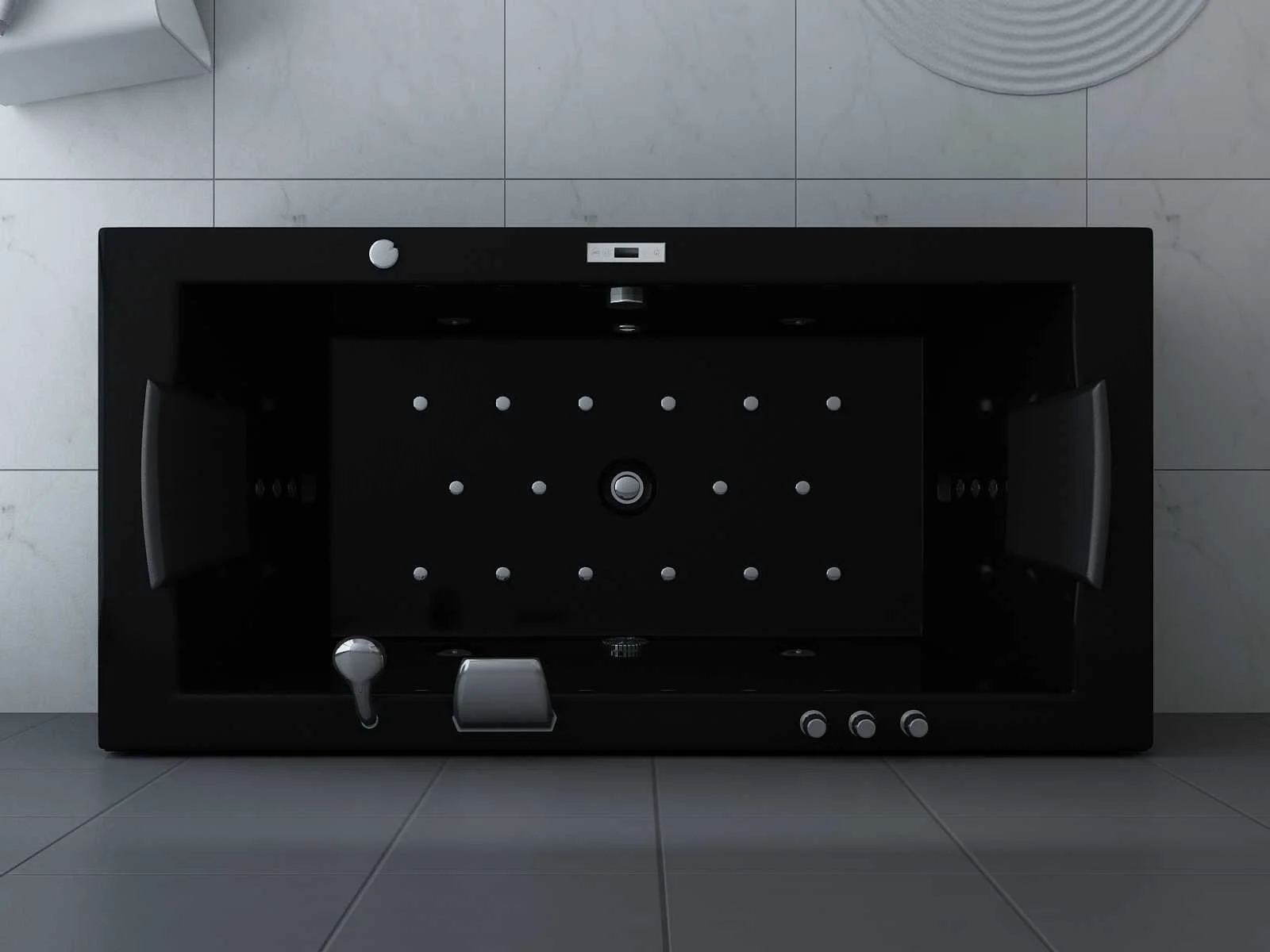 Type: RT1802B.1BM.OC Waterjets: 6 Grote waterjets en 16 airbubble jets. Voorzien van: Gegalvaniseerd stalen frame - Computer panel - Handdouche - 2 Hoofdkussens - LED-verlichting (7 stuks) - Luchtpomp - -Heater-Verchroomd RVS Kraan/ ozone- waterval. Merk: Gegalvaniseerd stalen frame Model: Vonato Product type: Vioran Kleur: 72 Lengte: Zwartcm Hoogte: 0cm Materiaal: 90