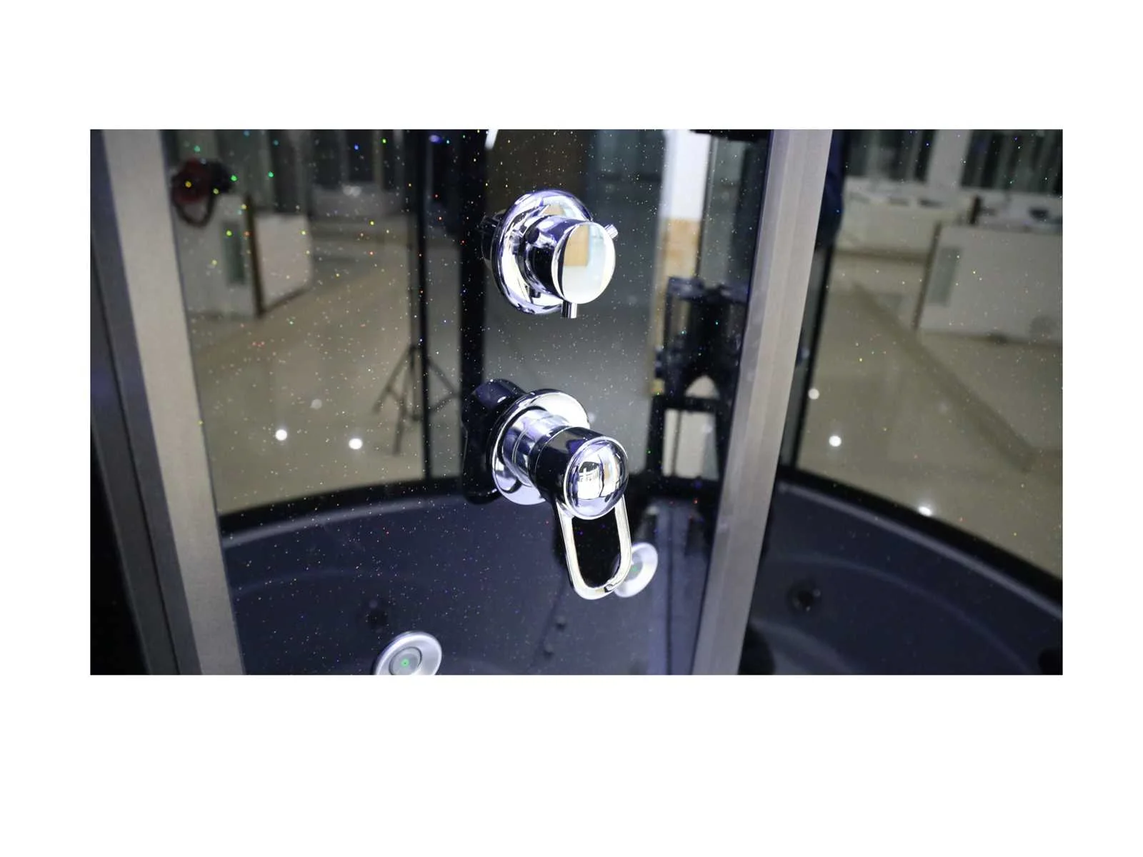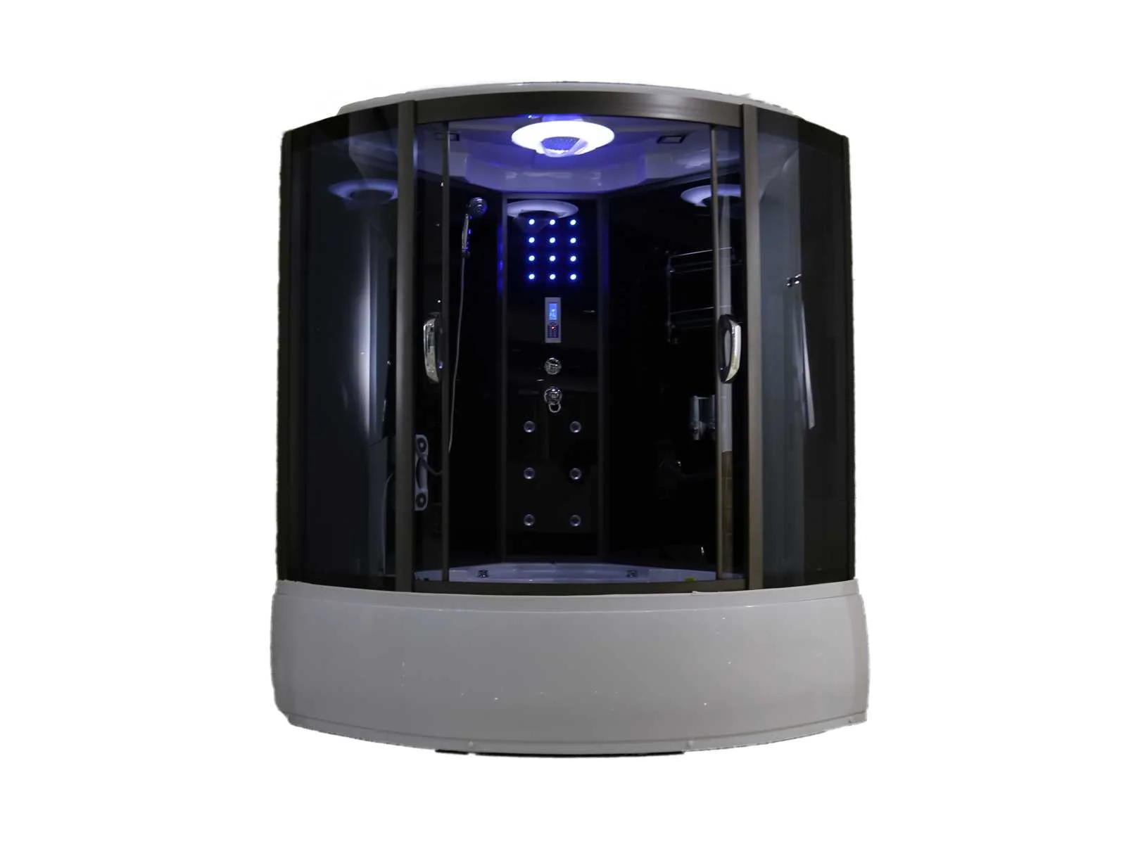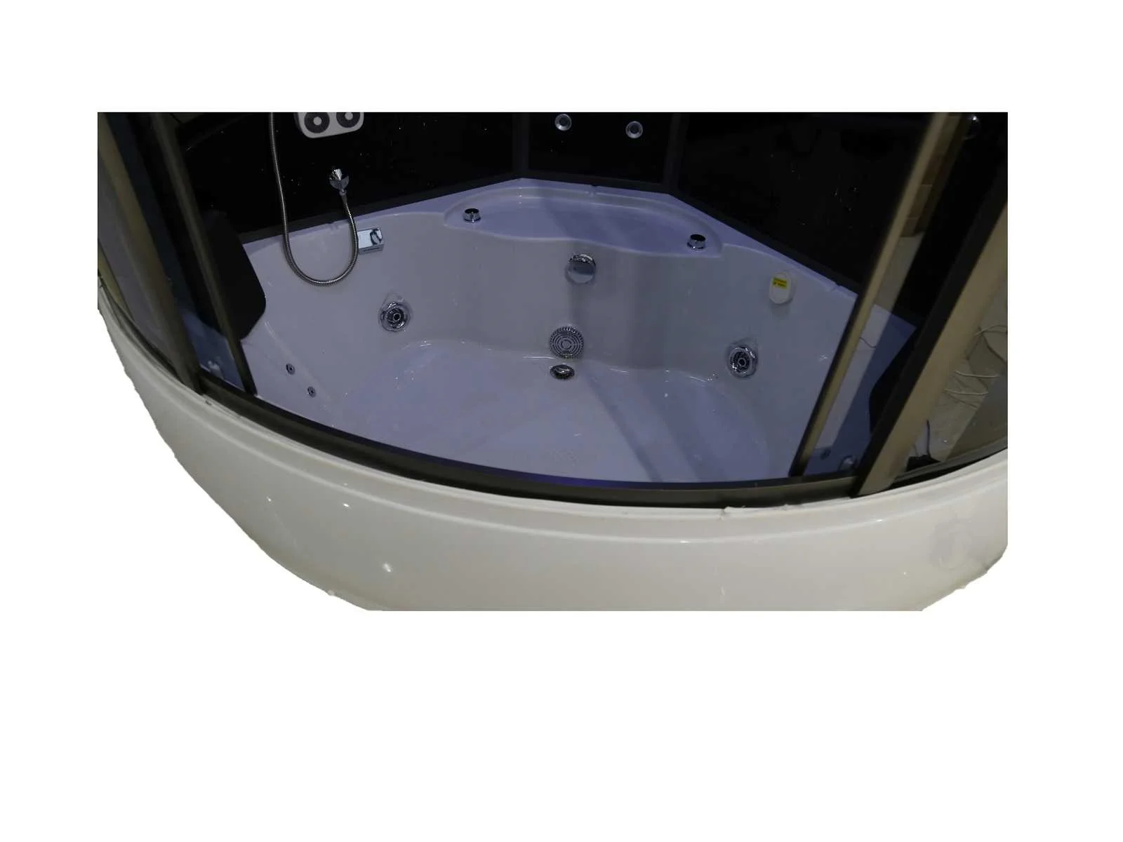 Type: SM2528. Model: Stoomcabine met whirlpool massagebad 150x150cm. Voorzien van: Gekleurd veiligheidsglas wat zorgt voor extra veiligheid in de stoomcabine. Dankzij het veiligheidsglas hoef u zich nooit zorgen te maken over scherven op de vloer want het is stootbestendig en sterk. Mocht het toch gebeuren dat het glas barst, dan zal het uiteenvallen in onscherpe stukjes.- Schuifdeuren met een waterdichte afsluiting - Whirlpool - Plafondverlichting - Sfeerverlichting - Handdouche - Regendouche - Handdoekenrek met planchet - Zeep en shampoodispenser - Functie voor een aangename voetmassage. Merk: Vonato Model: HydroTherm Lux Product type: met massagejets Kleur: Zwarte cabine, wit bad Lengte: 150cm Hoogte: 220cm Materiaal: Veiligheidsglas