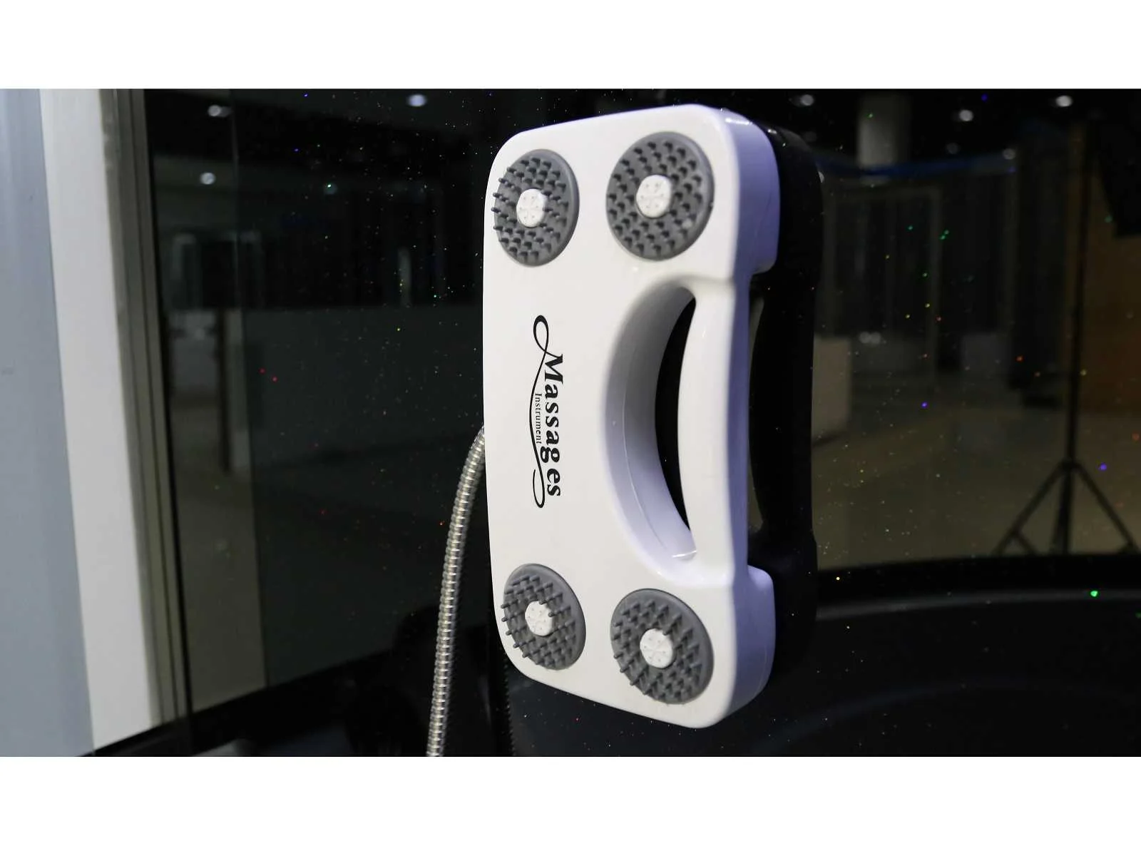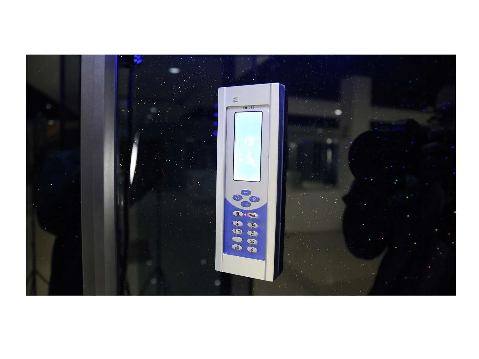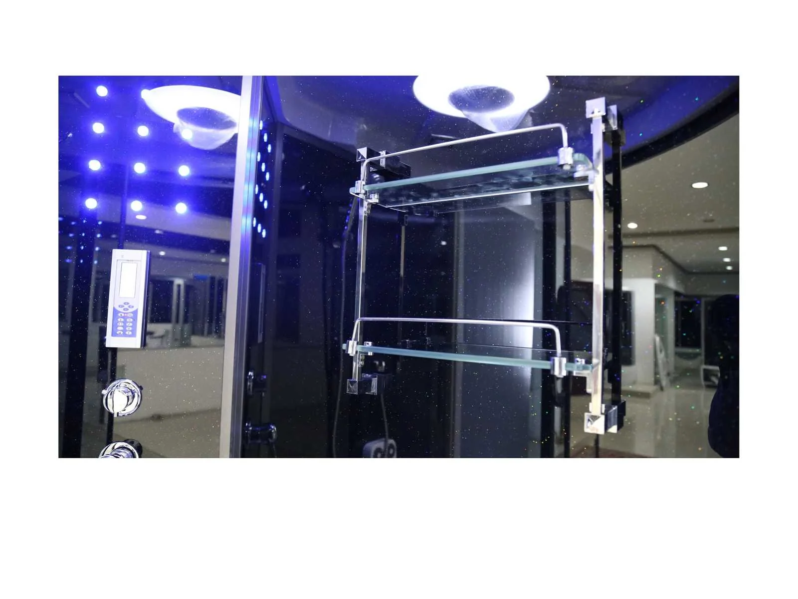 Type: SM2528. Model: Stoomcabine met whirlpool massagebad 150x150cm. Voorzien van: Gekleurd veiligheidsglas wat zorgt voor extra veiligheid in de stoomcabine. Dankzij het veiligheidsglas hoef u zich nooit zorgen te maken over scherven op de vloer want het is stootbestendig en sterk. Mocht het toch gebeuren dat het glas barst, dan zal het uiteenvallen in onscherpe stukjes.- Schuifdeuren met een waterdichte afsluiting - Whirlpool - Plafondverlichting - Sfeerverlichting - Handdouche - Regendouche - Handdoekenrek met planchet - Zeep en shampoodispenser - Functie voor een aangename voetmassage. Merk: Vonato Model: HydroTherm Lux Product type: met massagejets Kleur: Zwarte cabine, wit bad Lengte: 150cm Hoogte: 220cm Materiaal: Veiligheidsglas