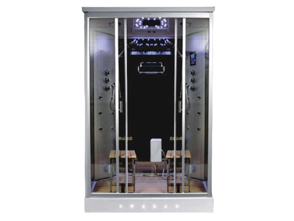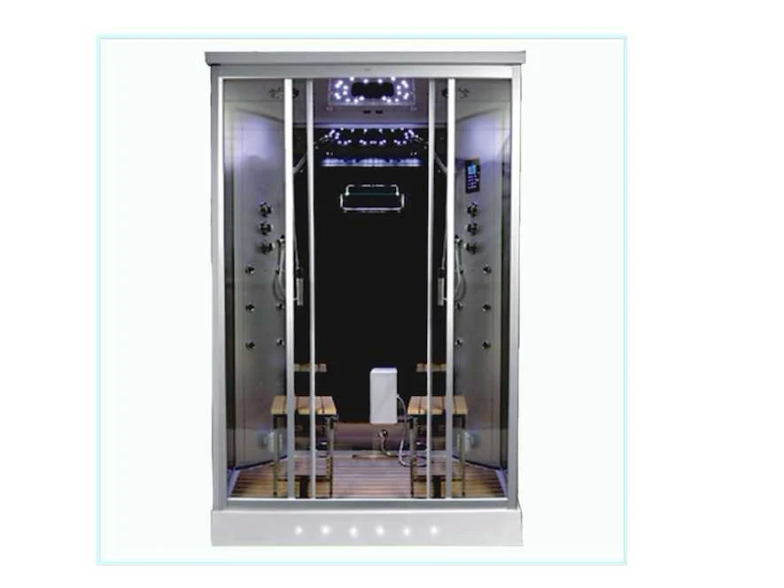 Type: GT0526. Model: 2-Persoons stoomcabine - Rechthoekig. Waterjets: Linker- en rechterkant voorzien van 6 waterjets, zorgen voor een aangename rugmassage. Voorzien van: ABS bodemplaat (zeer resistent tegen krassen, vlekken en breken) - Stoomgenerator - Helder veiligheidsglas - Uitgebreide Control Panel - FM-radio met speaker - Regendouche met LED-verlichting en temperatuur display - 2 Handdouches - Spiegelende glazen achterwand - Handdoekenrekje - Voetmassage - Twee waterdichte schuifdeuren - Ventilator - Cabine staat op verstelpoten die eenvoudig te stellen zijn in hoogte. let op: zonder stoeltjes en houtenvloer ter decoratie. Verpakking: Product bestaat uit 5 kartons: ca. 1 * 1500x980x250mm - 1 * 1920x450x150mm - 1 * 1920x900x80mm - 1 * 1920x450x150mm 1 * 1920x420x90mm Merk: Vonato Model: Halvo JetElite Product type: met massagejets Kleur: Zilver Lengte: 140cm Hoogte: 215cm Materiaal: Veiligheidsglas