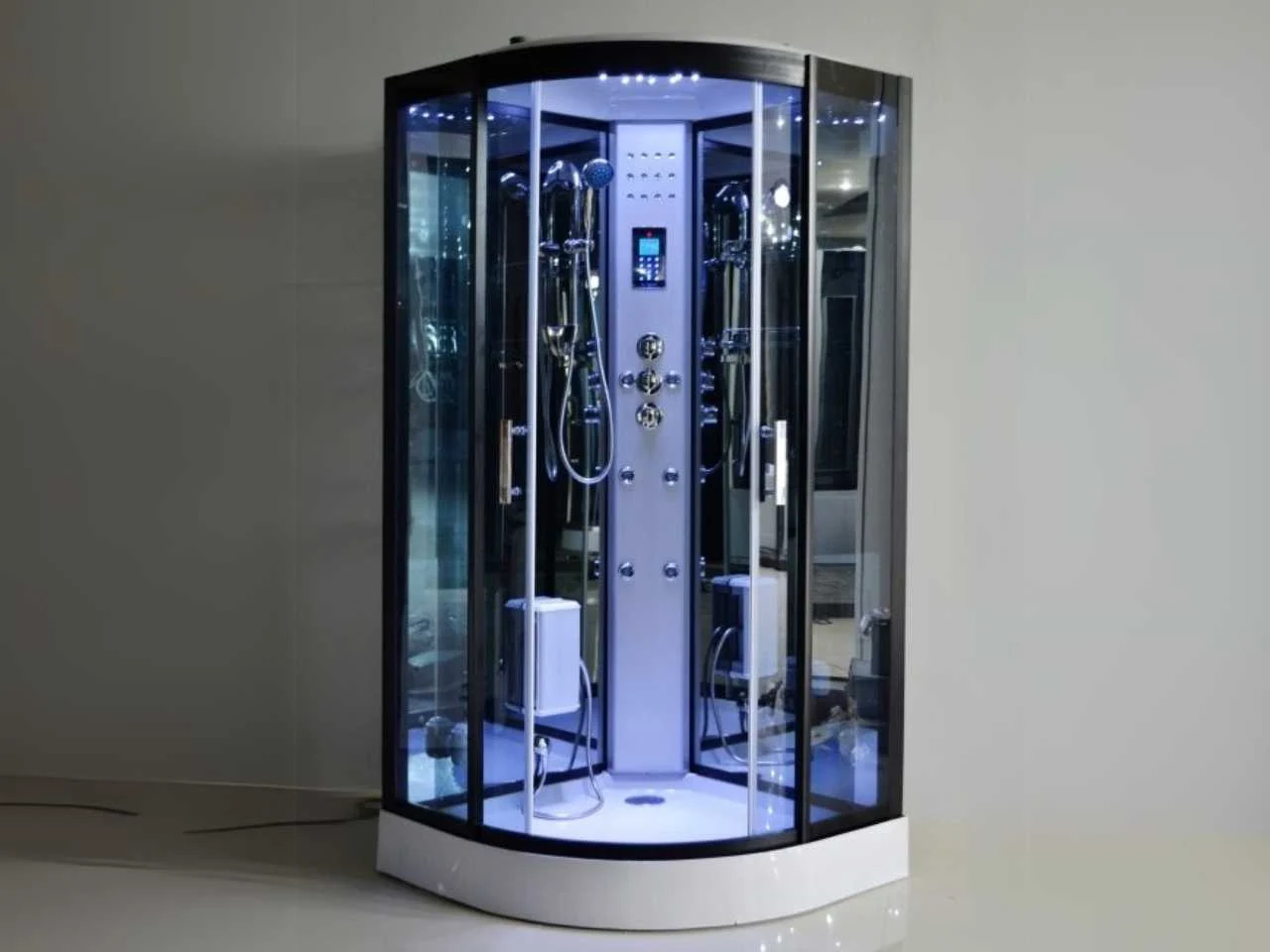 Type: GT0513B Waterjets: De cabine heeft 6 waterjets voor een aangename rugmassage Voorzien van: Veiligheidsglas wat zorgt voor extra veiligheid in de stoomcabine. Dankzij het veiligheidsglas hoef u zich nooit zorgen te maken over scherven op de vloer want het is stootbestendig en sterk. Mocht het toch gebeuren dat het glas barst, dan zal het uiteenvallen in onscherpe stukjes. - Control panel (o.a. tijd en temperatuur instelbaar) - Circulatie ventilator - Regendouche met verlichting rondom in het plafond - Extra verlichting in het plafond - ABS bodemplaat (zeer resistent tegen krassen, vlekken en breken) - Functie voor een aangename voetmassage - RVS kraan Garantie: 1 jaar op onderdelen Merk: Vonato Model: Halvo LuxeSteam Product type: met massagejets Kleur: Zwart & wit Lengte: 90cm Hoogte: 215cm Materiaal: Getint veiligheidsglas, RVS kraan, ABS bodemplaat
