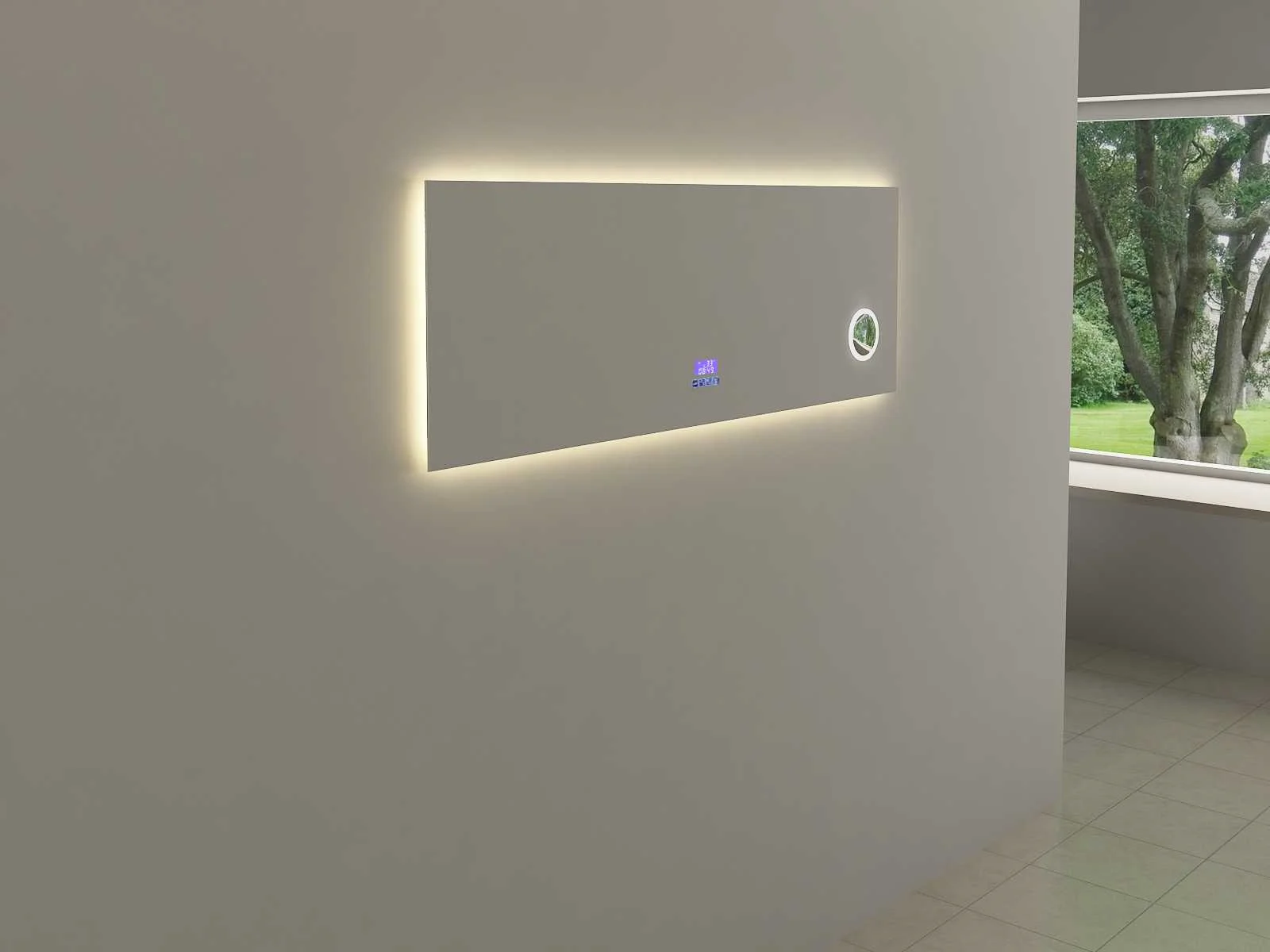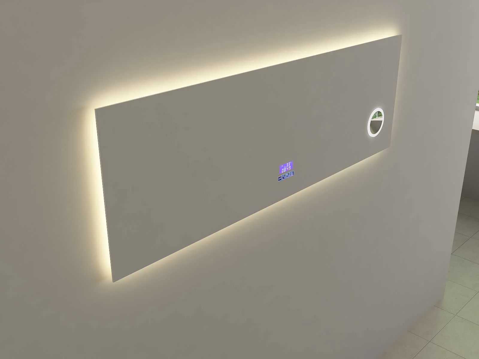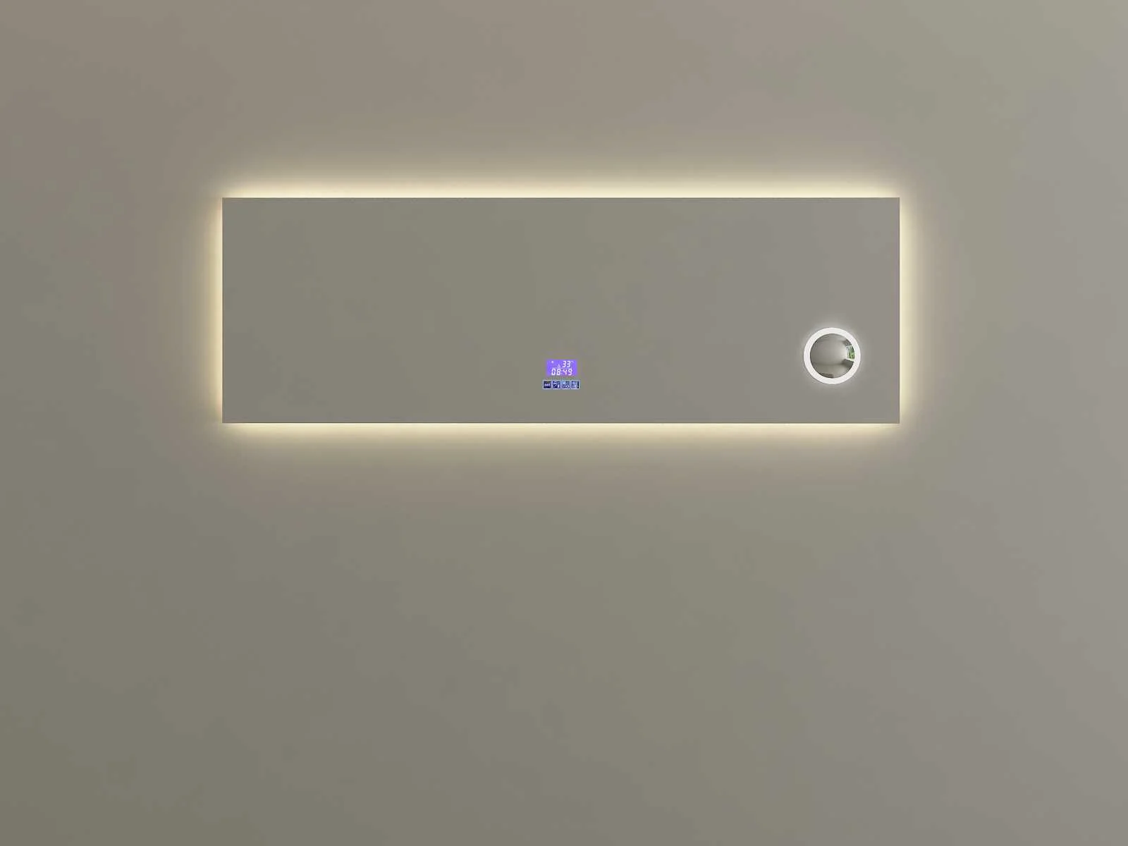 Type: RALM-150 Voorzien van: Touch bediening via digitaal display – LED verlichting in 3 kleuren, dimbaar – Bluetooth & speakers – Digitale klok – Digitale temperatuurmeter – 220 volt aansluiting – Anti-fog technologie door verwarming in de spiegel – Vergrootglas (vergroot 3x) in de spiegel Ø10 cm - Kopervrije spiegel - 1,5mm explosieveilige laag aan de achterkant. Merk: Vonato Model: Serenza Product type: met LED verlichting Kleur: LED verlichting in 3 kleuren; geel, blauw en wit Hoogte: 50cm
