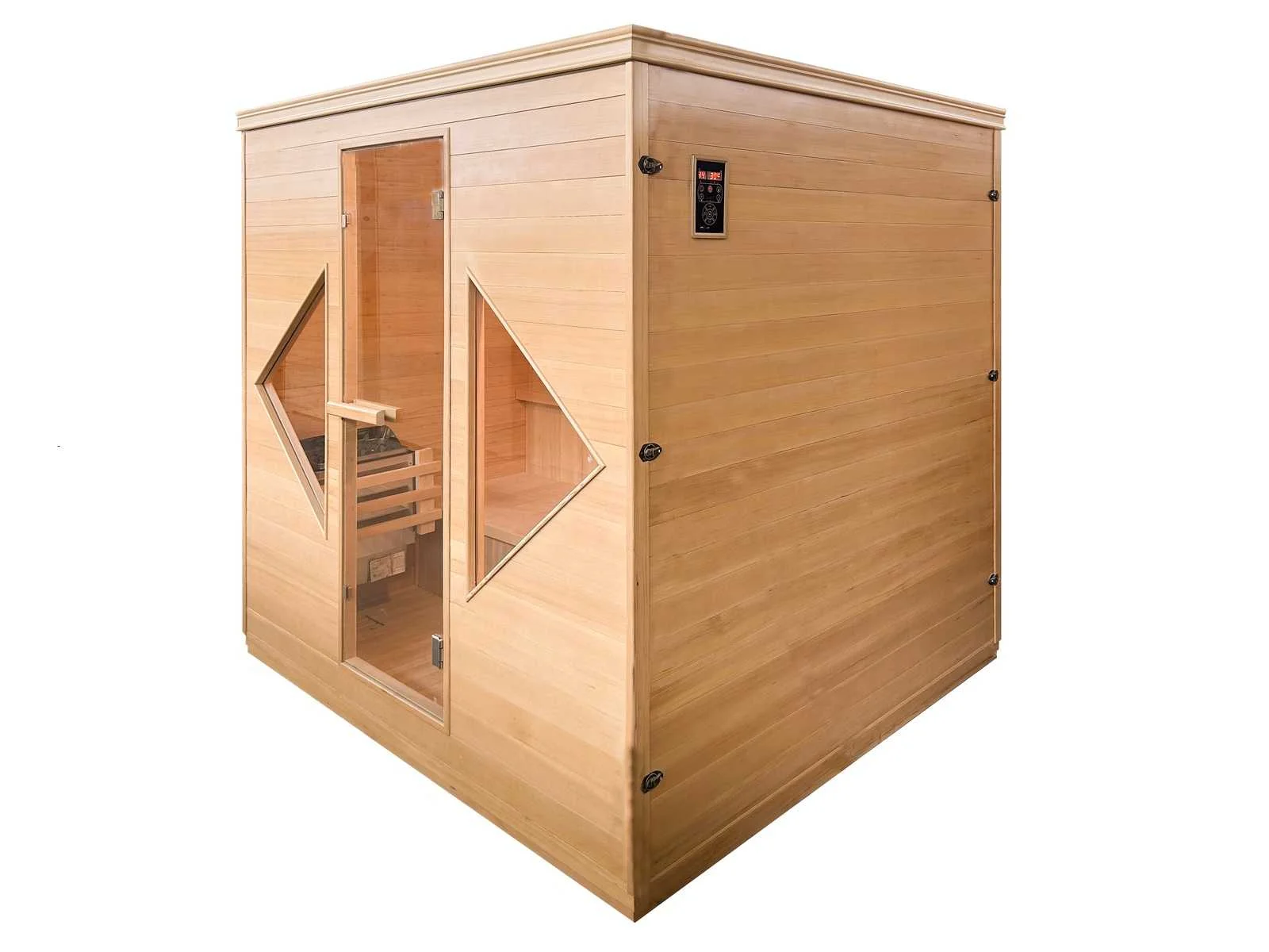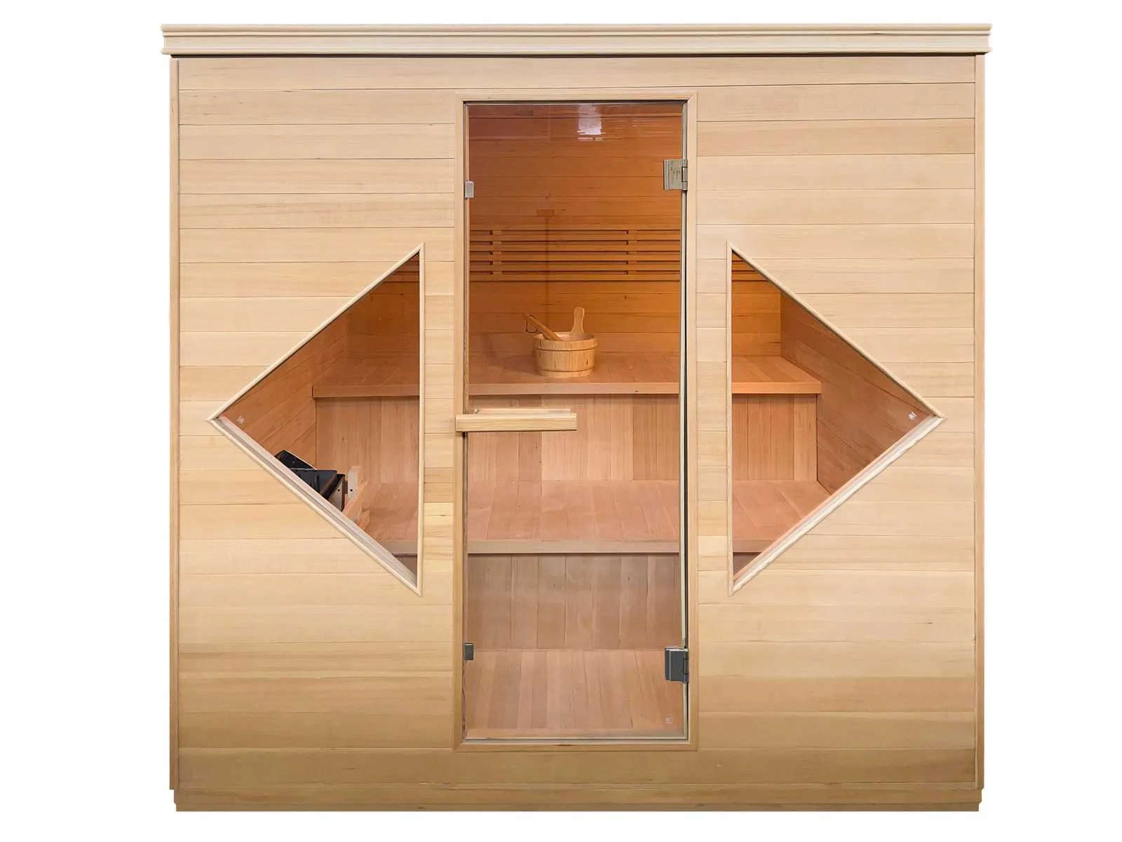 Type: SMS-601. Model: Sauna met kachel - rechthoekig. Afmeting: 2060x1830x2040mm. Verwarming: Kachel (6 KW). Voorzien van: Helder veiligheidsglas 8 mm - Ventilatie - Control Panel - Ca. 15 Kg. Lavastenen - Houten deurhendel - Bluetooth integratie voor muziek met speaker - Incl. vloer - Houten emmer met scheplepel - Zandloper - Thermometer Merk: Vonato Product type: Rechthoekig met kachel Kleur: Hout Lengte: 183cm Hoogte: 204cm Materiaal: Hout met helder veiligheidsglas