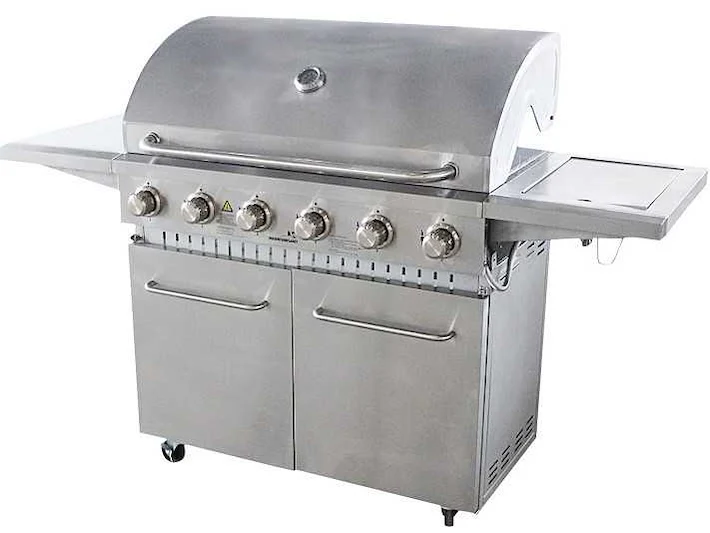 Type: JF006. Model: RVS Gasbarbecue - 6 branders. Voorzien van: 6 Hoofdbranders en 1 zijbrander - Gietijzeren rooster met warmhoudrek en leklade - Elektrische ontsteking - Opbergruimte met deurtjes - Plankje - Deksel voorzien van thermometer - Verrijdbaar. Merk: Vonato Model: RVS Traditionele Grill Elite 6 Product type: 6 branders Kleur: Zilverkleurig, RVS (mat) Lengte: 175cm Hoogte: 120cm Materiaal: RVS