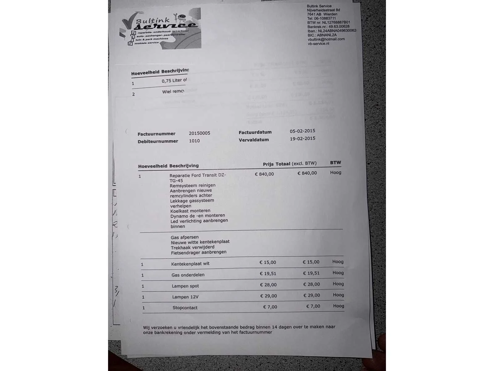 Omdat dit kavel niet in Spijkenisse staat moet u ons een mail sturen dan krijgt u van ons het adres. Vermeld wel het veilingnummer en kavelnummer zodat het voor ons makkelijker zoeken is. Kenteken: DZ-TG-45 Merk: Ford Model: Transit Type: 120 Kampeerauto Camper DZ-TG-45 Afgelezen kilometerstand: 97482km Cilinderinhoud: 0cc Chassisnummer: SFACXXBDVCLJ95221 Laadvermogen: 0kg NAP status: Geen oordeel Datum eerste toelating: 1990-06-30 Datum eerste toelating (NL): 1992-04-13 APK vervaldatum: 2027-08-29 Kleur: wit Stuurwiel: links Emissieklasse: 0 Aantal deuren: 3 Ledig gewicht: 2080kg Aantal cilinders: 4 Carrosserie: kampeerwagen Onderhoudshistorie: Ja gedeeltelijk Carfax Link: https://was.carfax.eu/v0/api/ccdid/5100016408/svc/201/vinreg/DZTG45/checksum/eyJhbGciOiJIUzI1NiIsInR5cCI6IkpXVCJ9.eyJleHAiOjE3NjQ5NjcyMDZ9.uH9LXeoUdW1yFaxr5_8I1dDND1dEW0UsPS5CWmJu6Qs startinformatie : Start en rijdt