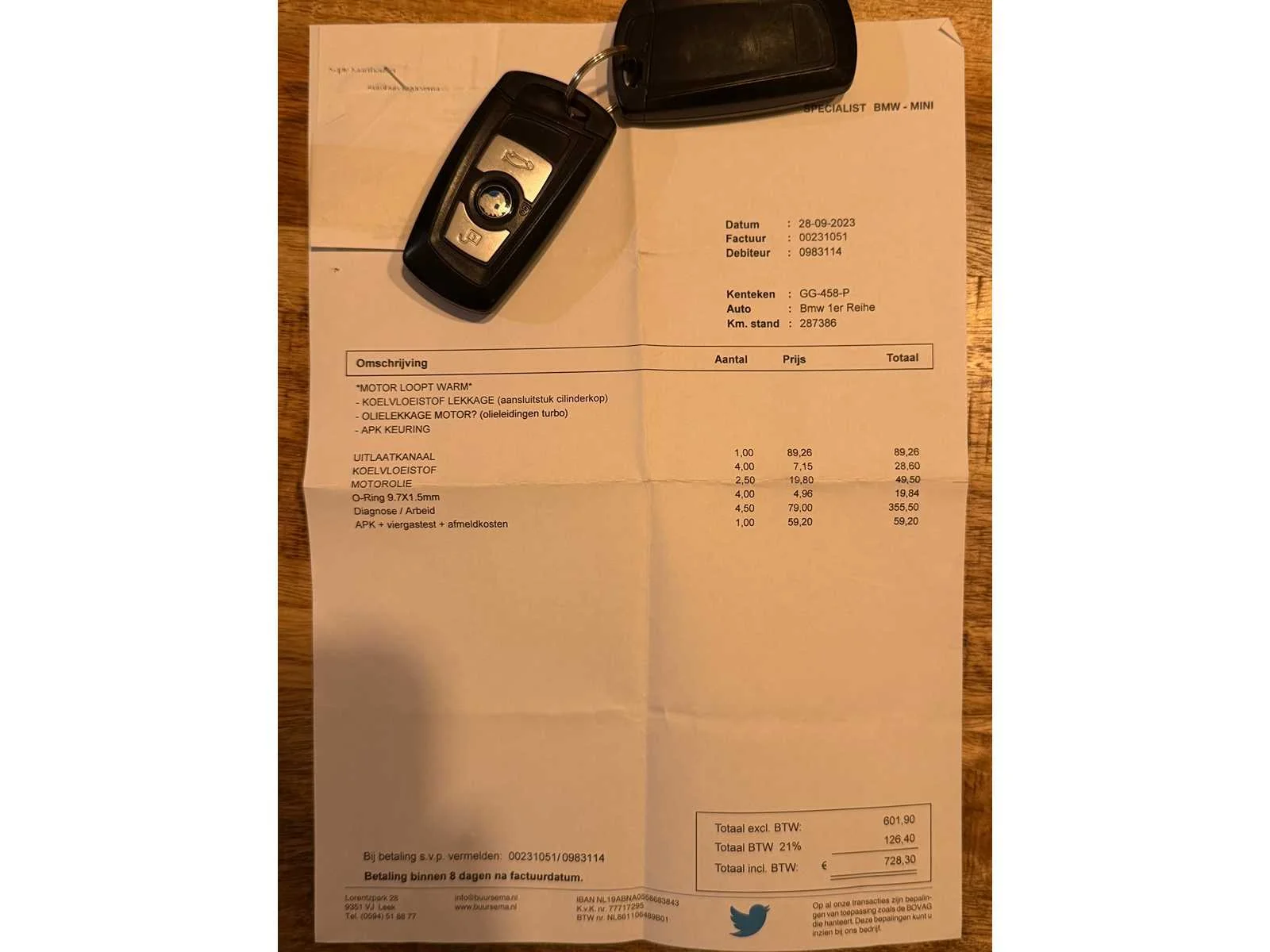 Omdat dit kavel niet in Spijkenisse staat moet u ons een mail sturen dan krijgt u van ons het adres. Vermeld wel het veilingnummer en kavelnummer zodat het voor ons makkelijker zoeken is. Kenteken: GG-458-P Merk: BMW Model: 1-serie Type: 116i Limited Edition GG-458-P Afgelezen kilometerstand: 312072km Cilinderinhoud: 1598cc Vermogen (kW): 100kW Chassisnummer: WBA1A11020E912120 Laadvermogen: 0kg NAP status: Geen oordeel Datum eerste toelating: 2012-04-17 Datum eerste toelating (NL): 2015-05-15 APK vervaldatum: 2025-11-06 Aantal zitplaatsen: 5 Kleur: zwart Stuurwiel: links Emissieklasse: 5 Aantal deuren: 4 Ledig gewicht: 1265kg Bruto BPM (NL): 3811€ Aantal cilinders: 4 Carrosserie: stationwagen Onderhoudshistorie: Ja gedeeltelijk Carfax Link: https://was.carfax.eu/v0/api/ccdid/5100016408/svc/201/vinreg/GG458P/checksum/eyJhbGciOiJIUzI1NiIsInR5cCI6IkpXVCJ9.eyJleHAiOjE3NjQ5NjgzNzN9.UG2U85EVqvTYih58jqeRHE1GNa5c3fvi8L2ANnpNOAE startinformatie : Start en rijdt
