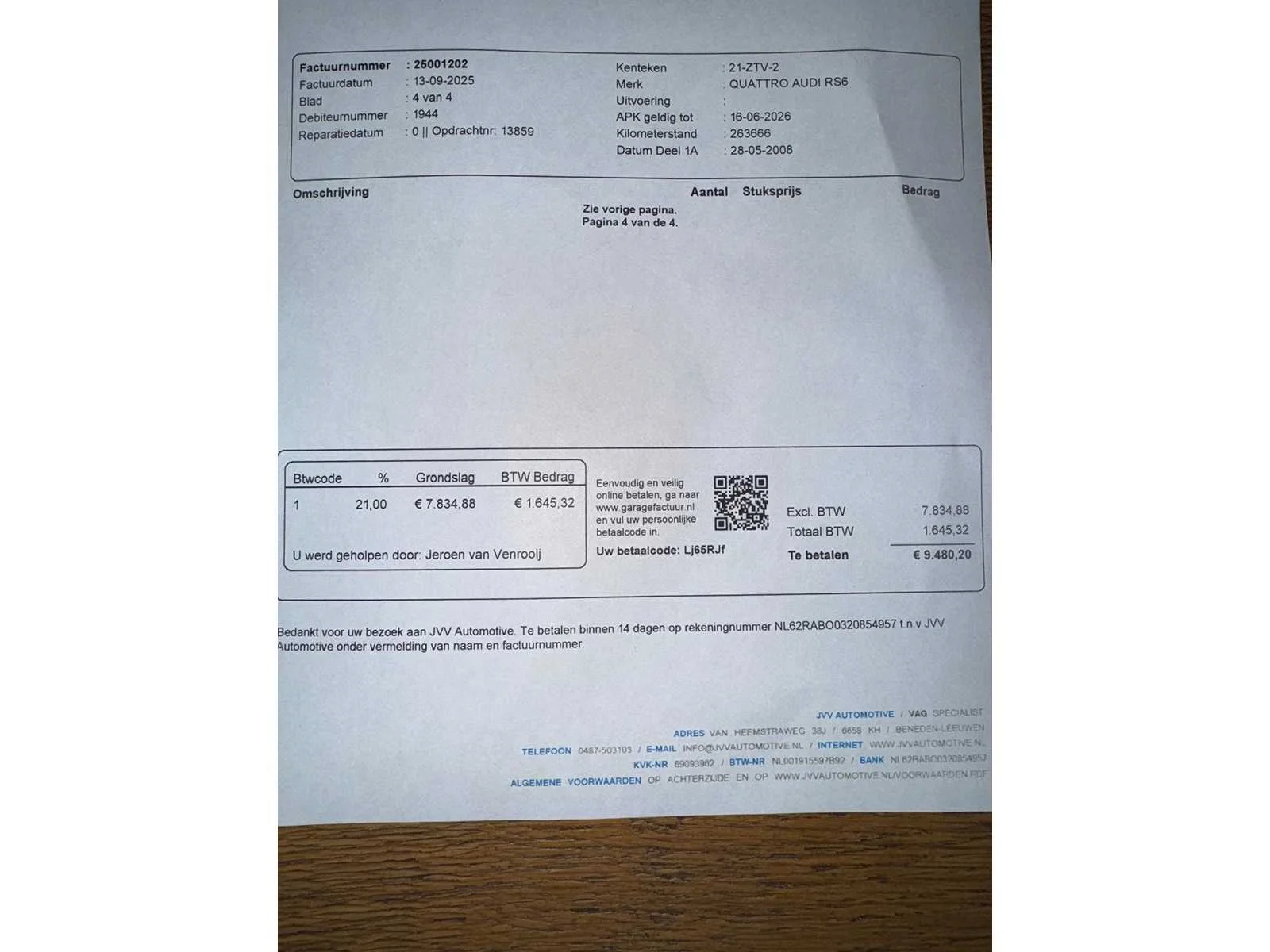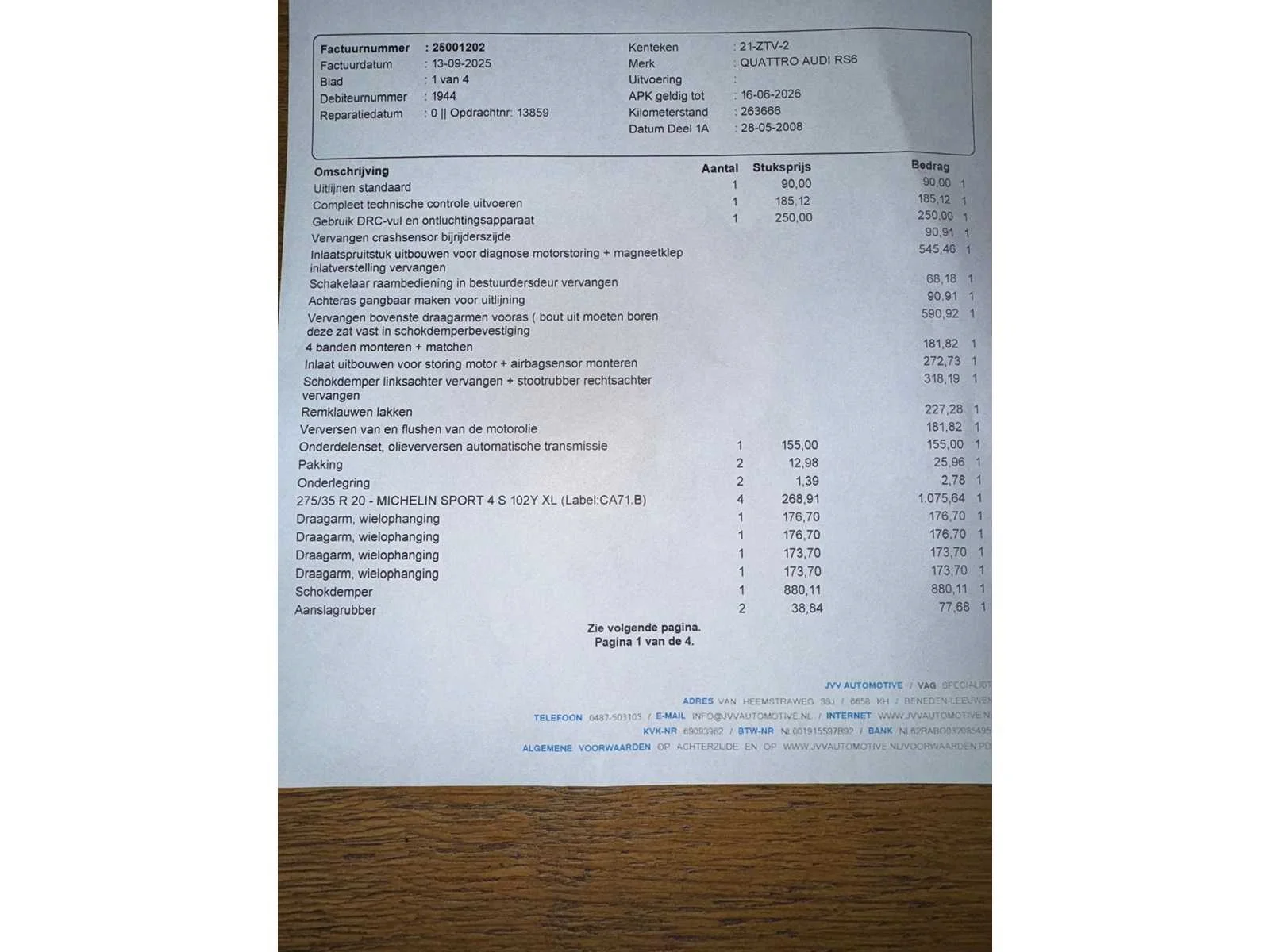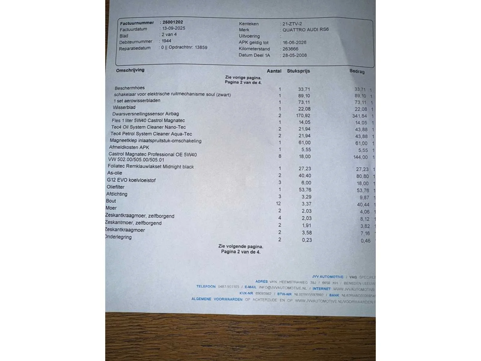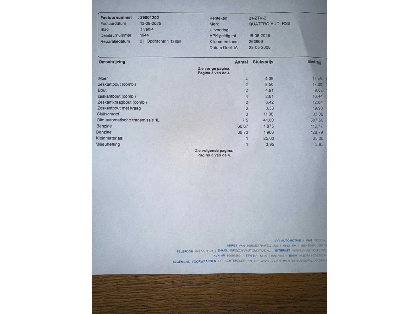 Grote beurt gehad €9480,- zie factuur full options achteruitrijcamera airco automatisch alarm klasse 3 7AL - Diefstalalarm Anti Blokkeer Systeem Anti doorSlip Regeling armsteun achter armsteun voor audio-navigatie full map autotelefoon voorbereiding PT5 - Autotelefoon voorbereiding (15032007) bagage-scheidingsnet bandenspanningscontrolesysteem 7K3 - Bandenspanningscontrolesysteem bestuurdersairbag binnenspiegel automatisch dimmend 4L6 - Binnenspiegel, automatisch dimmend bi-xenon koplampen PX4/8 - Xenon plus verlichting boordcomputer buitenspiegel(s) automatisch dimmend buitenspiegels elektrisch inklapbaar 6XE - Elek. inklapbare buitenspiegels buitenspiegels elektrisch verstel- en verwarmbaar carbonafwerking interieur cruise control dakrails dimlichten automatisch elektrisch bedienbare achterklep PGA - Kofferdeksel, automatisch bedienbaar elektrisch verstelbare stoel(en) met geheugen PV6 - Voorstoelen, met geheugenfunctie elektrische ramen voor en achter Elektronisch Stabiliteits Programma elektronische remkrachtverdeling hoofd airbag(s) achter hoofd airbag(s) voor hoofdsteunen anti-whiplash keyless entry 4F2 - Advanced key koplampen adaptief koplampreiniging 8X1 - Koplampreinigingsinstallatie lederen exclusive bekleding N7U - Leder-alcantara combinatie lichtmetalen velgen 20" PQF/F - aluminium velgen 8,5Jx19 7-dubbelspaak PQS - lichtmetaal 8,5J x 19 "20 spaak"-design mistlampen voor parkeersensor voor en achter 7X4 - acoustic parking system voor en achter passagiersairbag regensensor S Line exterieur sportonderstel 1BE - Sportonderstel stuur leder voorstoelen en achterbank verwarmd 4A4 - Stoelen en achterbank, verwarmbaar zij airbag(s) achter 4X4 - Zij-airbags achter zij airbag(s) voor zonnescherm Omdat dit kavel niet in Spijkenisse staat moet u ons een mail sturen dan krijgt u van ons het adres. Vermeld wel het veilingnummer en kavelnummer zodat het voor ons makkelijker zoeken is. Kenteken: 21-ZTV-2 Merk: Audi Model: RS 6 Avant Type: 5.0 V10 740PK TFSI RS 6 Cilinderinhoud: 4991cc Brandstof: Benzine Afgelezen mijlenstand: 164561mi Chassisnummer: WUAZZZ4F38N901123 Laadvermogen: 0kg NAP status: Geen oordeel Datum eerste toelating: 2008-05-28 Datum eerste toelating (NL): 2013-02-07 APK vervaldatum: 2026-06-16 Vermogen (pk): 740hp Aandrijving: 4x4 Aantal zitplaatsen: 5 Kleur: blauw Stuurwiel: links Emissieklasse: 4 Aantal deuren: 4 Ledig gewicht: 2000kg Bruto BPM (NL): 27835€ Aantal cilinders: 10 Carrosserie: stationwagen Nationaliteit documenten: Nederland Onderhoudshistorie: Ja gedeeltelijk Carfax Link: https://was.carfax.eu/v0/api/ccdid/5100016408/svc/201/vinreg/21ZTV2/checksum/eyJhbGciOiJIUzI1NiIsInR5cCI6IkpXVCJ9.eyJleHAiOjE3NjUwNDAyMDB9.l_qRXhOV4yDtshCjcY2OeOTFW9FoRWX1Q6Q96dDXWpo startinformatie : Start en rijdt Airconditioning: true Navigatie: true Xenon verlichting: true Leder bekleed: true Luchtvering: true Vierwielaandrijving 4x4: true