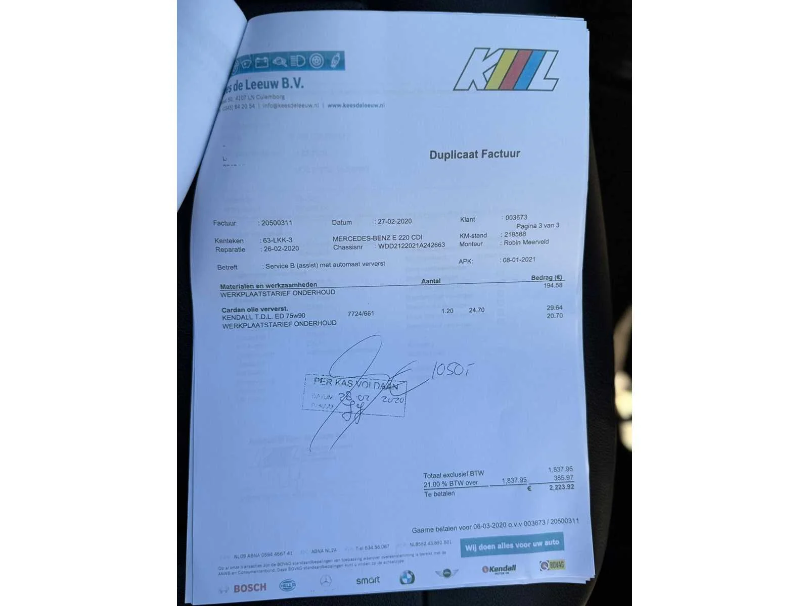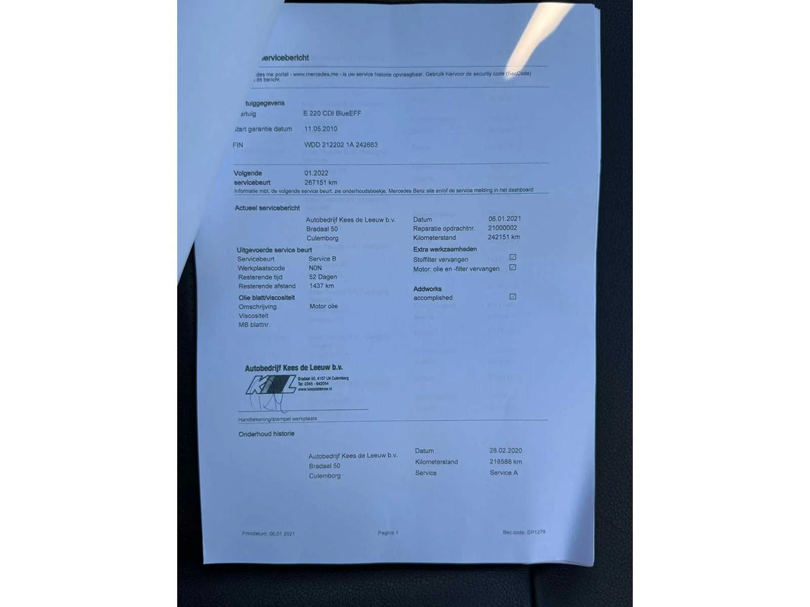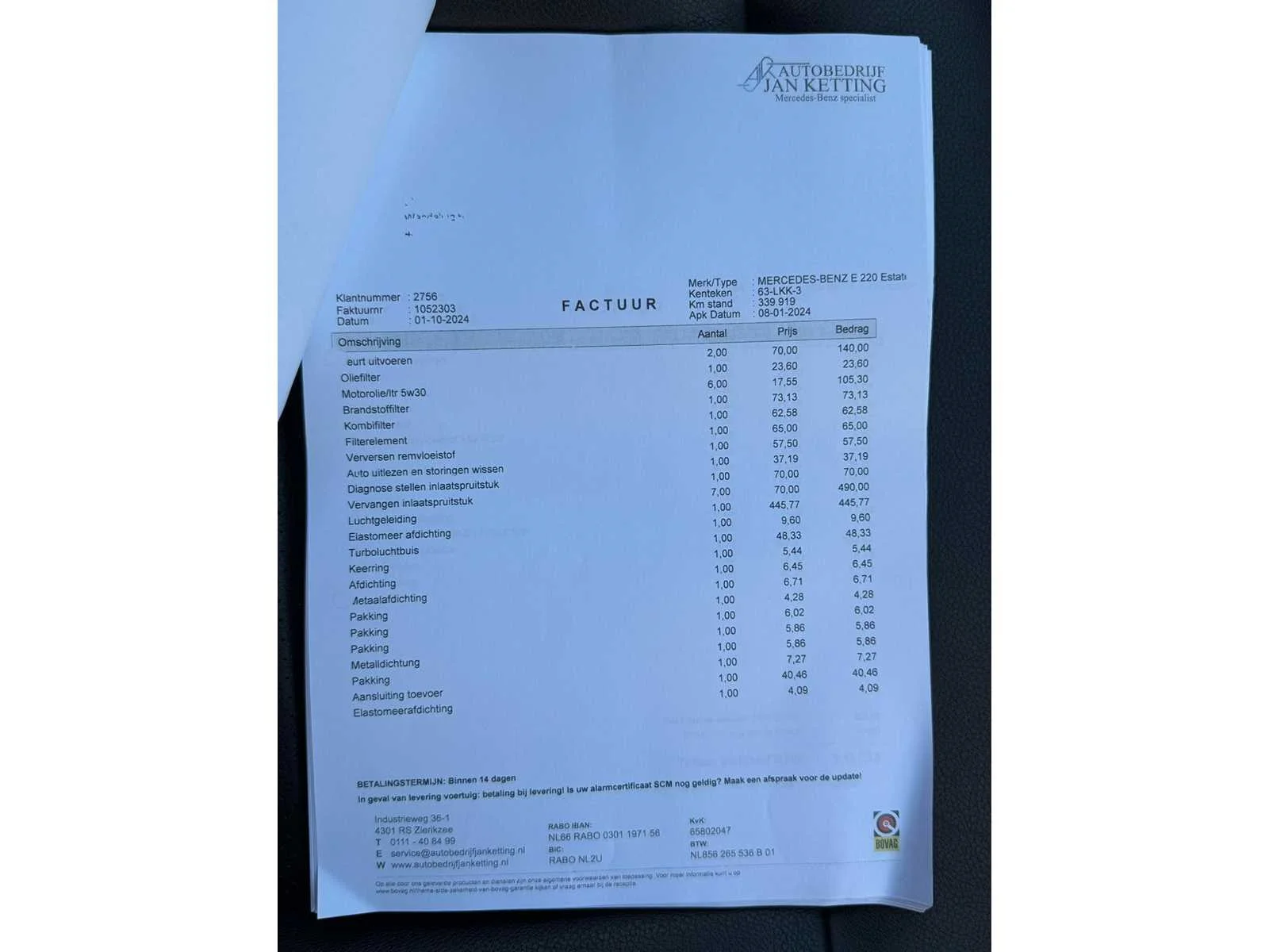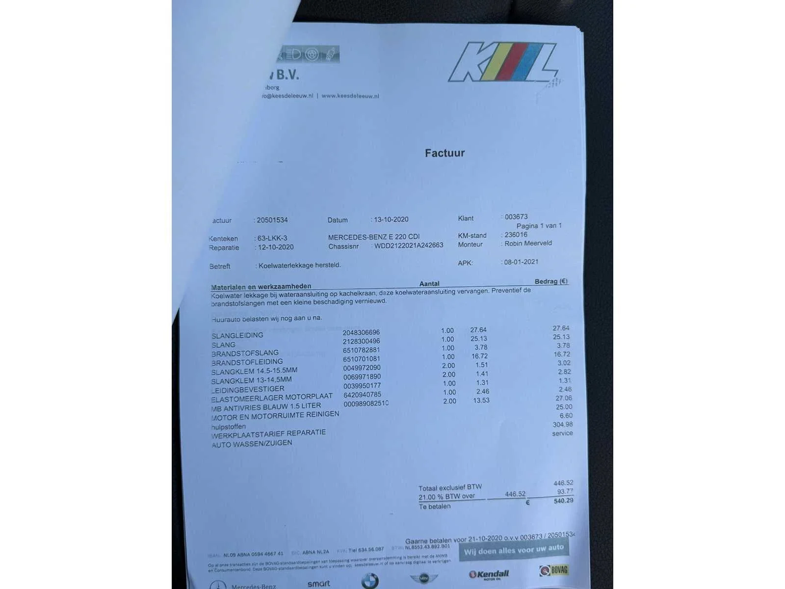 Kenteken: 63-LKK-3 Merk: Mercedes-Benz Model: E-klasse Estate Type: 220 CDI Avantgarde ORG NEDERLANDS NAP 63-LKK-3 Afgelezen kilometerstand: 370439km Cilinderinhoud: 2143cc Vermogen (kW): 125kW Brandstof: Diesel Chassisnummer: WDD2122021A2426632663 Laadvermogen: 0kg NAP status: Logisch Datum eerste toelating: 2010-05-11 Datum eerste toelating (NL): 2010-05-11 APK vervaldatum: 2026-01-08 Vermogen (pk): 170hp Energielabel: C Aandrijving: RWD Aantal zitplaatsen: 5 Maximaal trekgewicht ongeremd: 750kg Maximaal trekgewicht geremd: 2100kg Kleur: grijs Transmissie: Automaat Stuurwiel: links Emissieklasse: 5 Aantal deuren: 4 Ledig gewicht: 1745kg Bruto BPM (NL): 16474€ Rest BPM: 939€ Aantal cilinders: 4 Carrosserie: stationwagen CO2-uitstoot NEDC: 162 Onderhoudshistorie: Ja gedeeltelijk Carfax Link: https://was.carfax.eu/v0/api/ccdid/5100016408/svc/201/vinreg/63LKK3/checksum/eyJhbGciOiJIUzI1NiIsInR5cCI6IkpXVCJ9.eyJleHAiOjE3NjI2ODMyNDB9.uL2NFL1JrZhreoQHObNg0iPorfwfNfEjk7DJxlTpv9w startinformatie : Start en rijdt