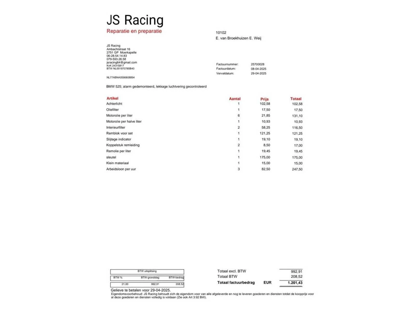 Kenteken: 57-PG-JK Merk: BMW Model: 5-serie Touring Type: 525i Executive Afgelezen kilometerstand: 395596km Cilinderinhoud: 2494cc Vermogen (kW): 141kW Laadvermogen: 0kg NAP status: Logisch Datum eerste toelating: 2004-06-25 Datum eerste toelating (NL): 2004-06-25 APK vervaldatum: 2026-05-11 Vermogen (pk): 192hp Energielabel: E Aandrijving: RWD Aantal zitplaatsen: 5 Maximaal trekgewicht ongeremd: 750kg Maximaal trekgewicht geremd: 2000kg Kleur: grijs Transmissie: Automaat Stuurwiel: links Emissieklasse: 4 Aantal deuren: 4 Ledig gewicht: 1565kg Bruto BPM (NL): 17063€ Rest BPM: 0€ Aantal cilinders: 6 Carrosserie: stationwagen CO2-uitstoot NEDC: 248 Onderhoudshistorie: Ja gedeeltelijk Carfax Link: https://was.carfax.eu/v0/api/ccdid/5100016408/svc/201/vinreg/57PGJK/checksum/eyJhbGciOiJIUzI1NiIsInR5cCI6IkpXVCJ9.eyJleHAiOjE3NjAwODc2OTB9.ZgbBnIJCx48OMzW3t1hGTeMC2BiBDrWQ7JdLHh1NxCQ startinformatie : Start en rijdt
