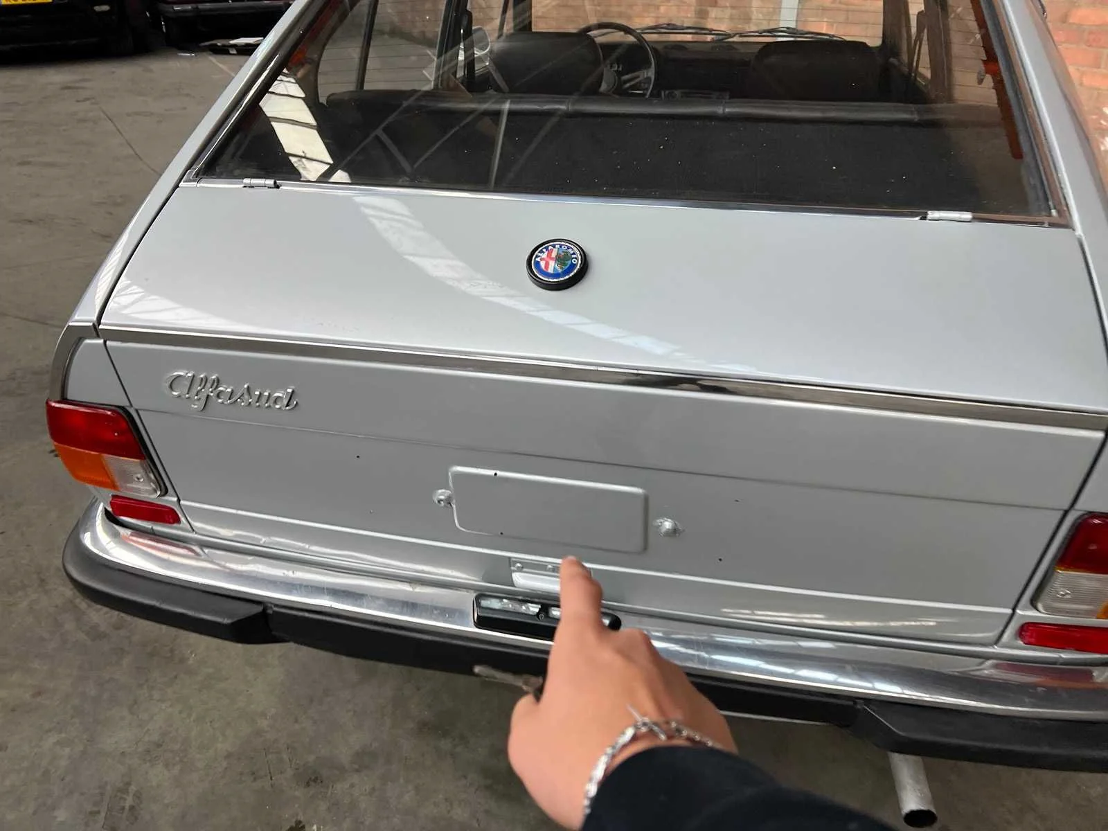Merk: Alfa Romeo Model: Sud Type: 901 Afgelezen kilometerstand: 65188km Brandstof: Benzine Chassisnummer: A346920Na24 Datum eerste toelating: 1978-07-04 Vermogen (pk): 97hp Aandrijving: Voorwielaandrijving Aantal zitplaatsen: 5 Kleur: Grijs Transmissie: Handgeschakeld Aantal deuren: 5 Carrosserie: Sedan Nationaliteit documenten: Italiaanse