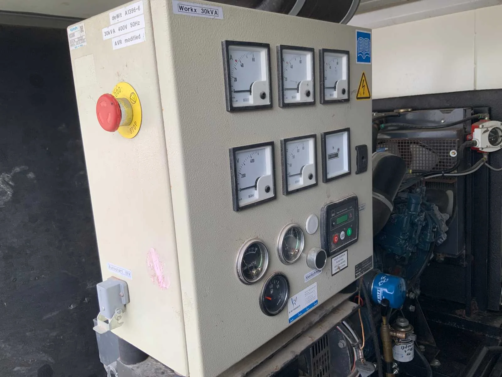 Generatorset is gebouwd op dieselolietank in geluidgedempte container. Merk: Kubota Type: V3300 Bouwjaar: 2013 Serienummer: BS0336 Capaciteit.: 30kVA Aansluiting: 400V Generator merk: Meccalte Generator type: ECP28-VL/4 Afgelezen urenstand: 18340 Totale afmeting L: 2450mm Totale afmeting Breedte: 2190mm Totale afmeting Hoogte: 2250mm