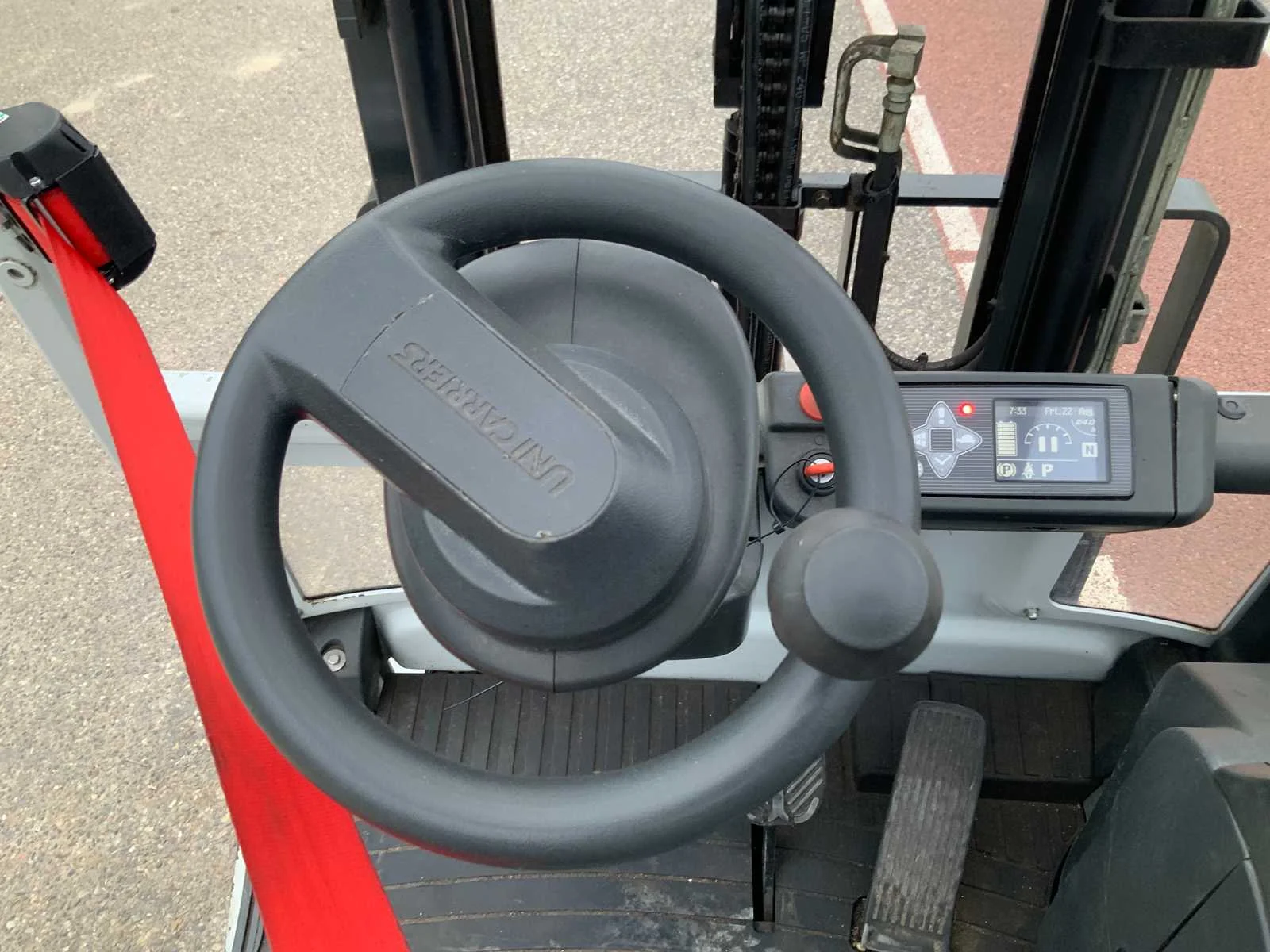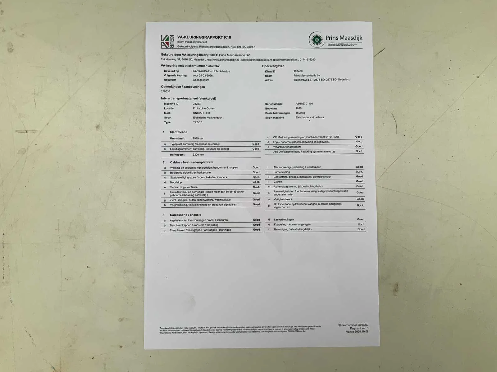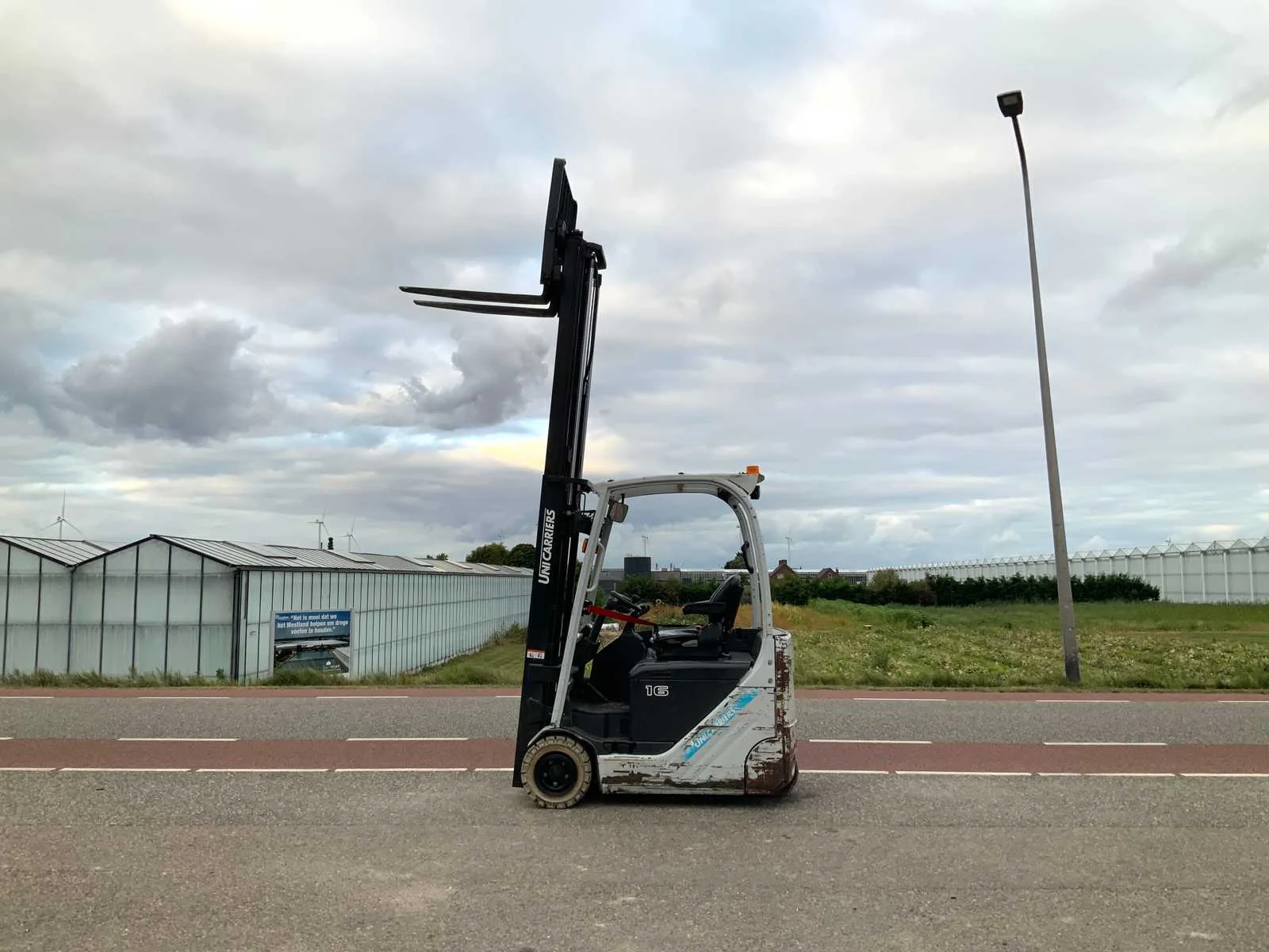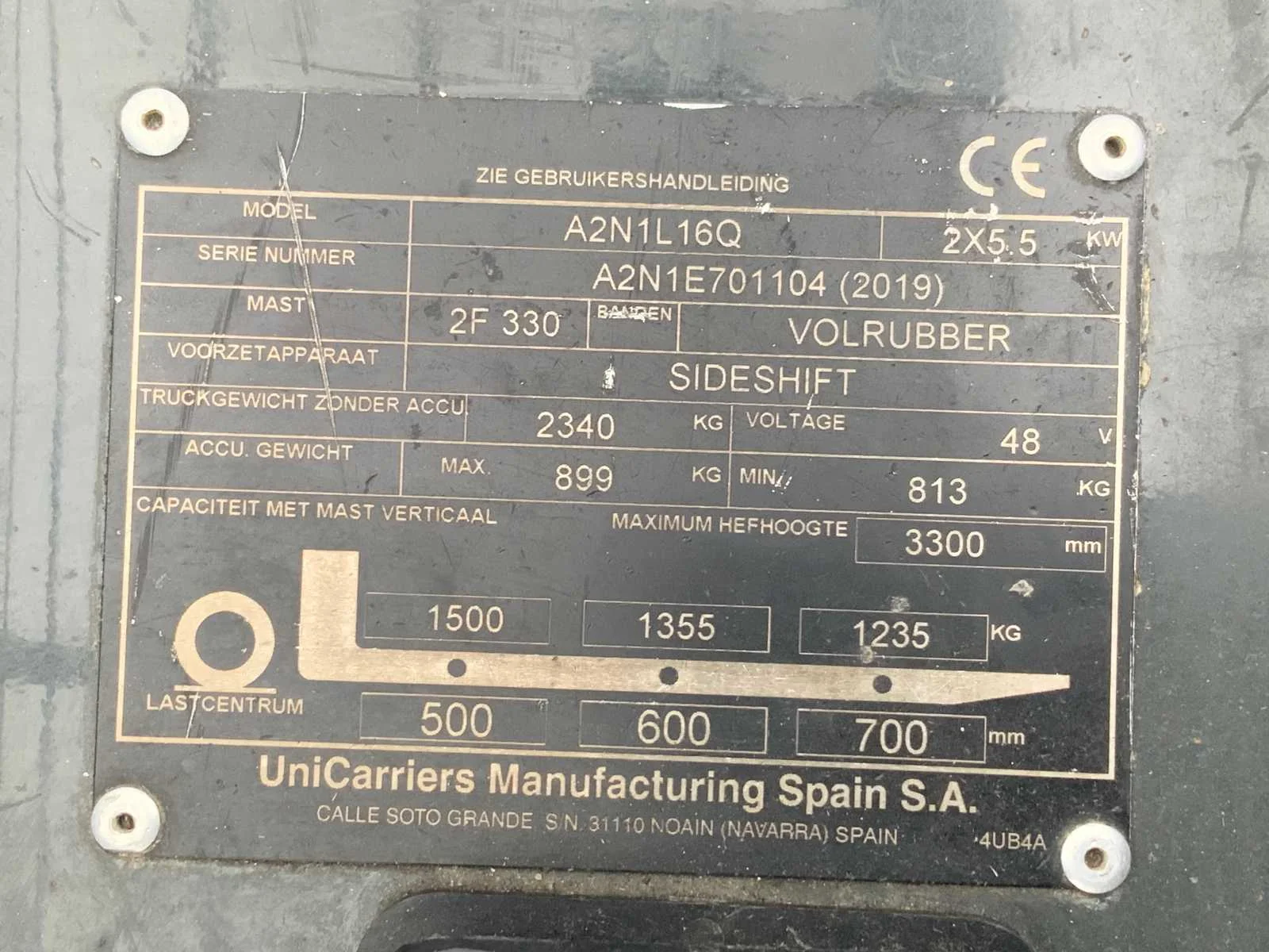 Accu getest en goedwerkende machine, gekeurd t/m maart 2026. Merk: UniCarriers Type: A2N1L16Q Bouwjaar: 2019 Serienummer: A2N1E701104 Brandstof: Elektrisch Mast: Duplex Soort band: Volrubber banden Aantal wielen: 4 Afgelezen urenstand: 7995 Accu lader: true Side-shift: true Duplex mast: true Eigen gewicht: 2239kg Hefvermogen: 1600kg Lepellengte: 1000mm Max. hefhoogte: 3300mm Vol rubber banden: true Minimale doorrijhoogte: 2130mm Totale afmeting L: 3000mm Totale afmeting Breedte: 1120mm Totale afmeting Hoogte: 2130mm