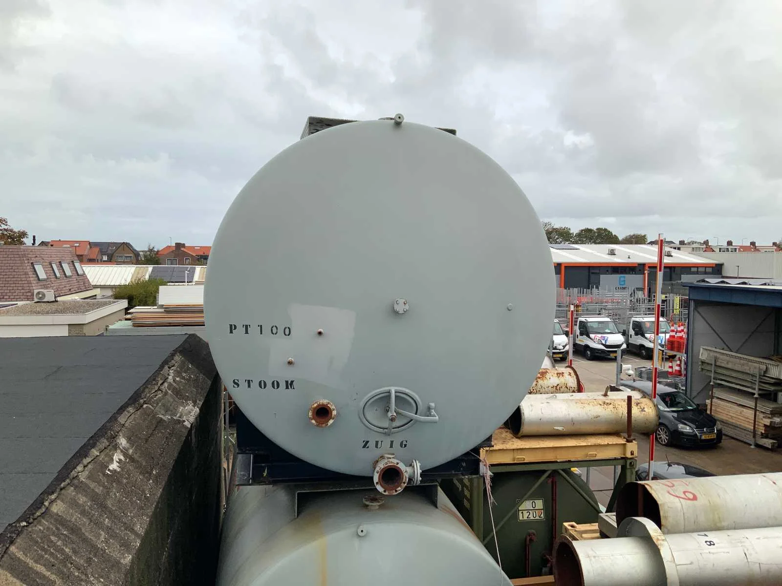 Stalen tank is gemonteerd op frame en binnenzijde tank is geëmailleerd afmeting lengte x dia: ca 850x300 cm en inhoud ca 55-60 M3 eigen gewicht ca 11.000 kg, assistentie met laden en heftruck 16T beschikbaar. Staal: true