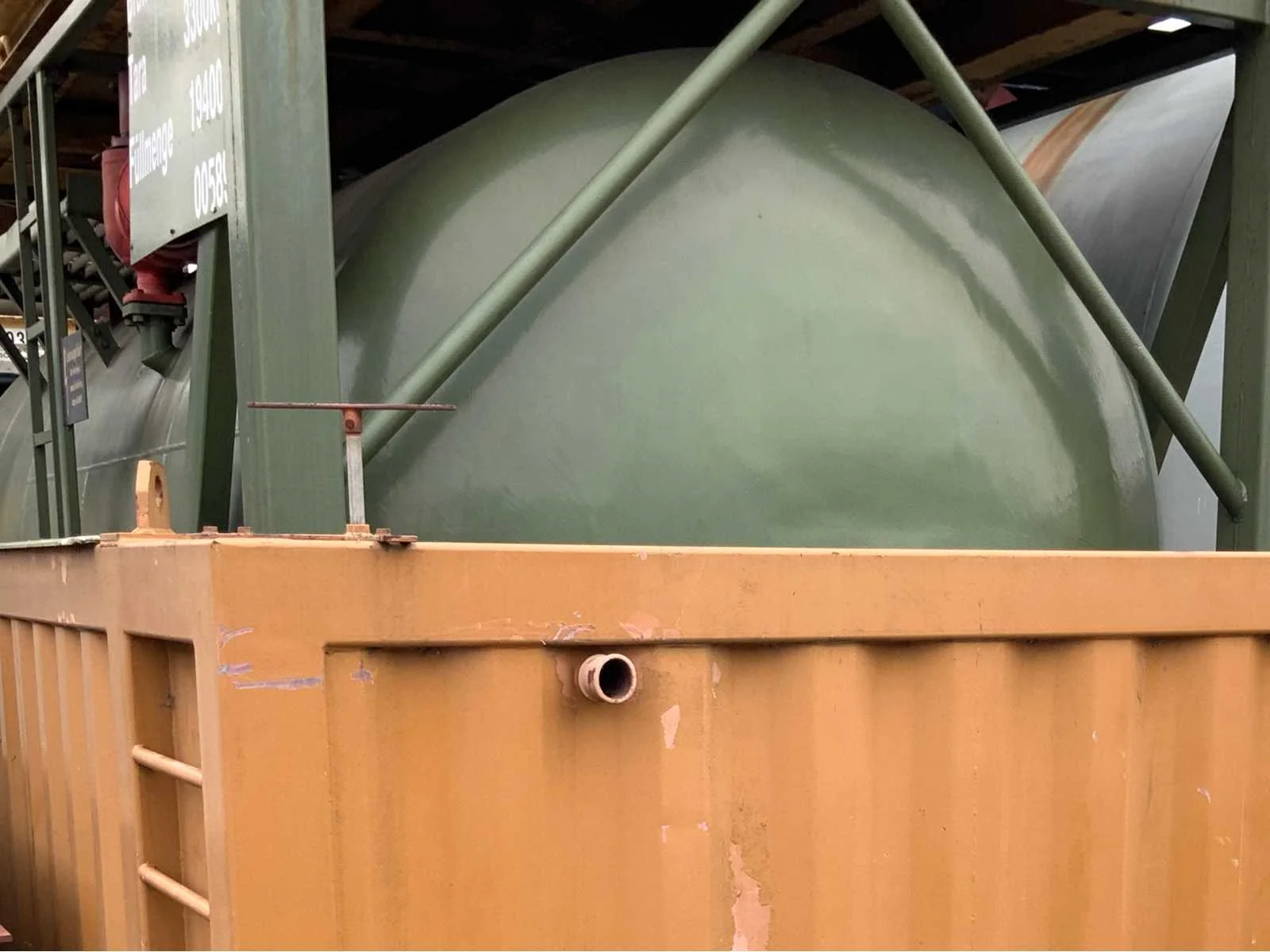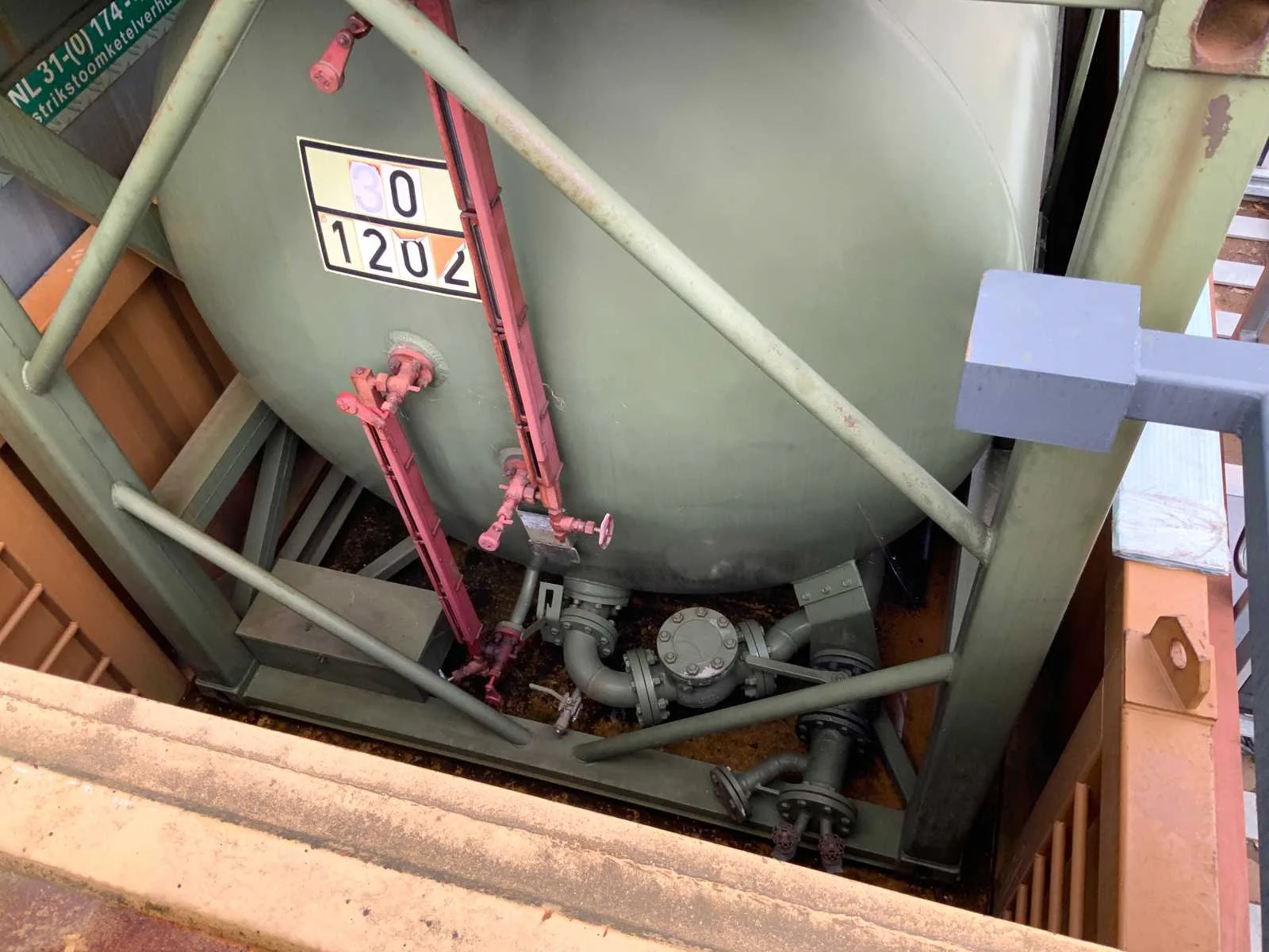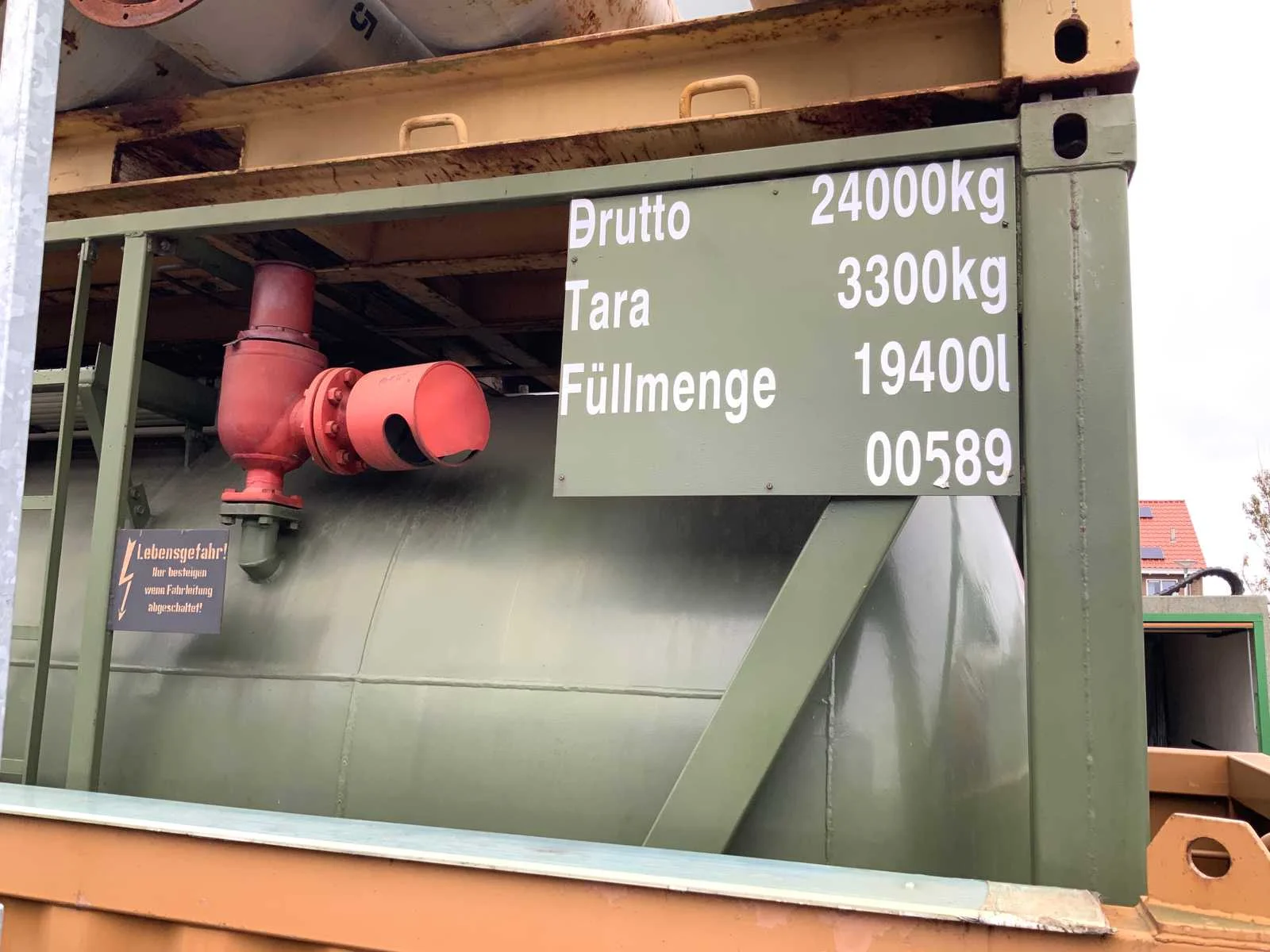 Aluminium tank is gemonteerd in frame van 20ft container afmeting frame lxbxh: ca 610x244x265 cm afmeting tank lengte x dia: ca 550x220 cm inhoud tank ca 20 M3 en totaal gewicht van ca 3300 kg, (LET OP DIT KAVEL BETREFT ALLEEN DE GROENE TANK!!) assistentie met laden en heftruck 16T beschikbaar. Aluminium: true