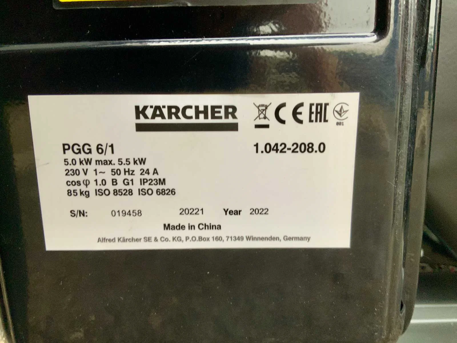 Generator is ongebruikt, elektrisch gestart en zie voor meer specificaties bijgevoegde brochure. Merk: Kärcher Type: PGG6/1 Serienummer: 019458 Aansluiting: 230V Motorcapaciteit: 5kW Generator type: Synchroon Machinegewicht: 85kg Totale afmeting L: 743mm Totale afmeting Breedte: 713mm Totale afmeting Hoogte: 670mm