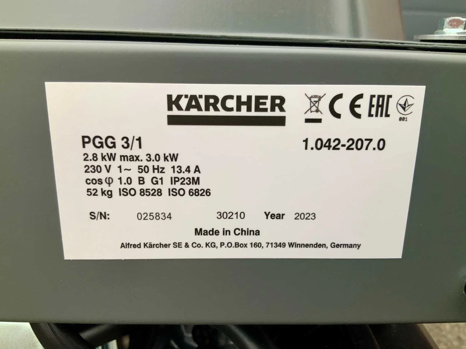 Generator is ongebruikt, elektrisch gestart en zie voor meer specificaties bijgevoegde brochure. Merk: Kärcher Type: PGG3/1 Serienummer: 025834 Aansluiting: 230V Motorcapaciteit: 3kW Generator type: Synchroon Machinegewicht: 52kg Totale afmeting L: 645mm Totale afmeting Breedte: 622mm Totale afmeting Hoogte: 549mm
