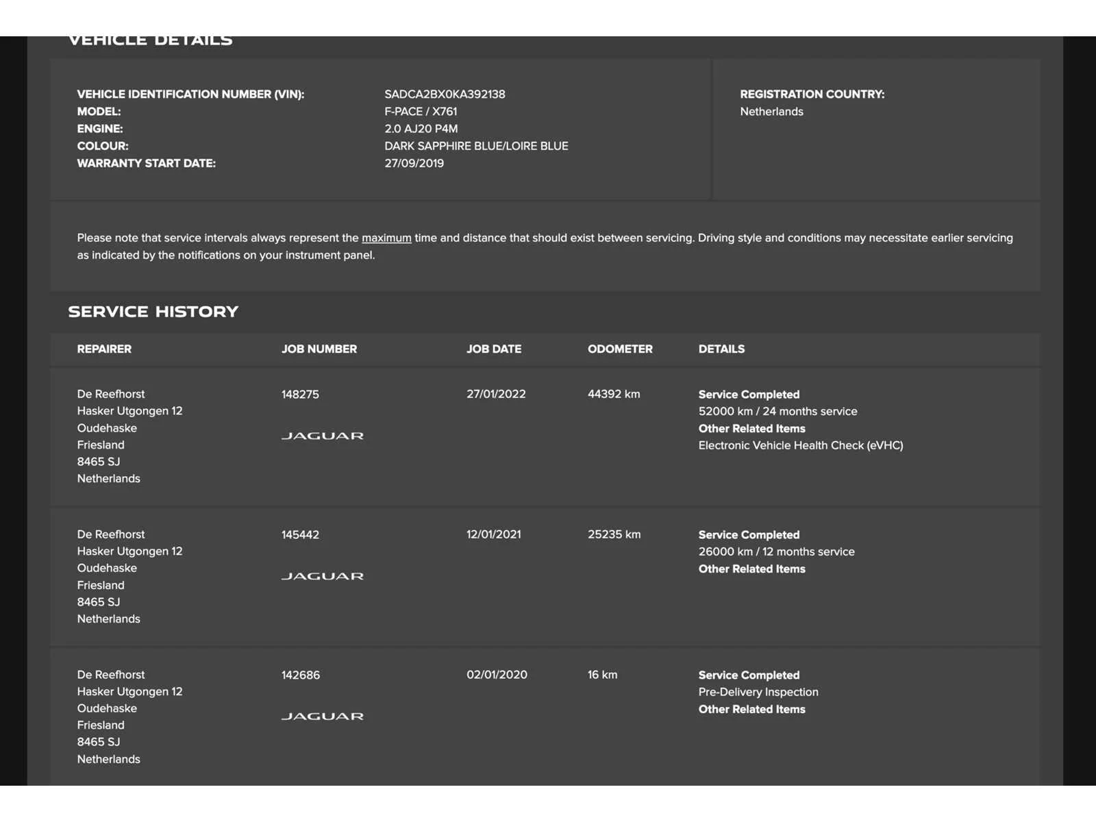 LET OP!: voor Nederlandse kopers en kopers van buiten de EU komt de Rest-BPM er nog bij, deze verschijnt later op de factuur en bedraagt €6.997,-. Dus totale biedprijs + €6.997,-. De totaalprijs bij het bieden is dus excl. BPM! (This is only relevant for Dutch buyers and buyers from outside the EU) Important: international buyers (within the EU) can reclaim the remaining amount Dutch BPM tax ('rest-BPM'). For this lot, buyer pays the BPM tax as a deposit and after registering this lot in your country, the deposit will be refunded. Dutch and non-EU buyers will pay the BPM via the invoice of this lot. Kenteken: H-258-BD Merk: Jaguar Model: F-PACE Type: 2.0t AWD R-Sport Pure Afgelezen kilometerstand: 96650km Cilinderinhoud: 1997cc Vermogen (kW): 184kW Brandstof: benzine Chassisnummer: SADCA2BX0KA392138 Laadvermogen: 0kg NAP status: Logisch Datum eerste toelating: 2020-01-06 Datum eerste toelating (NL): 2020-01-06 APK vervaldatum: 2025-09-08 Vermogen (pk): 250hp Aandrijving: vierwielaandrijving Aantal zitplaatsen: 5 Maximaal trekgewicht ongeremd: 750kg Maximaal trekgewicht geremd: 2400kg Kleur: Portofino Blauw Transmissie: Automaat Stuurwiel: links Emissieklasse: 6 Aantal deuren: 5 Ledig gewicht: 1769kg Aantal cilinders: 4 Carrosserie: SUV Nationaliteit documenten: Nederlandse kentekendocumenten Onderhoudshistorie: ja gedeeltelijk Carfax Link: https://was.carfax.eu/v0/api/ccdid/5100016408/svc/201/vinreg/H258BD/checksum/eyJhbGciOiJIUzI1NiIsInR5cCI6IkpXVCJ9.eyJleHAiOjE3NTUzMzI3NzR9.967mvj7I3M26e8qwtYkEbkkbAW0mms-KBIlCfHoqvy4