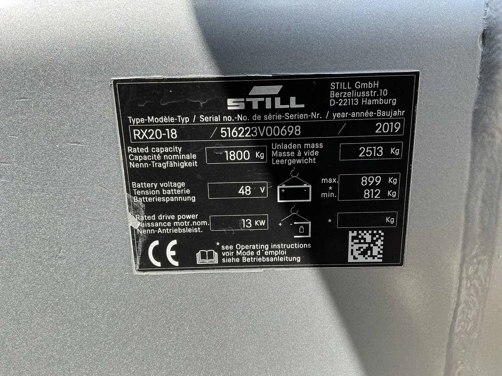 Merk: STILL Type: RX20-18 Bouwjaar: 2019 Serienummer: 516223V00698 Mast: Triplex Aantal wielen: 3 Afgelezen urenstand: 8849 Free-lift: true Side-shift: true Triple mast: true Hefvermogen: 1800kg Lepellengte: 1200mm Hefhoogte: 4460mm Minimale doorrijhoogte: 2060mm