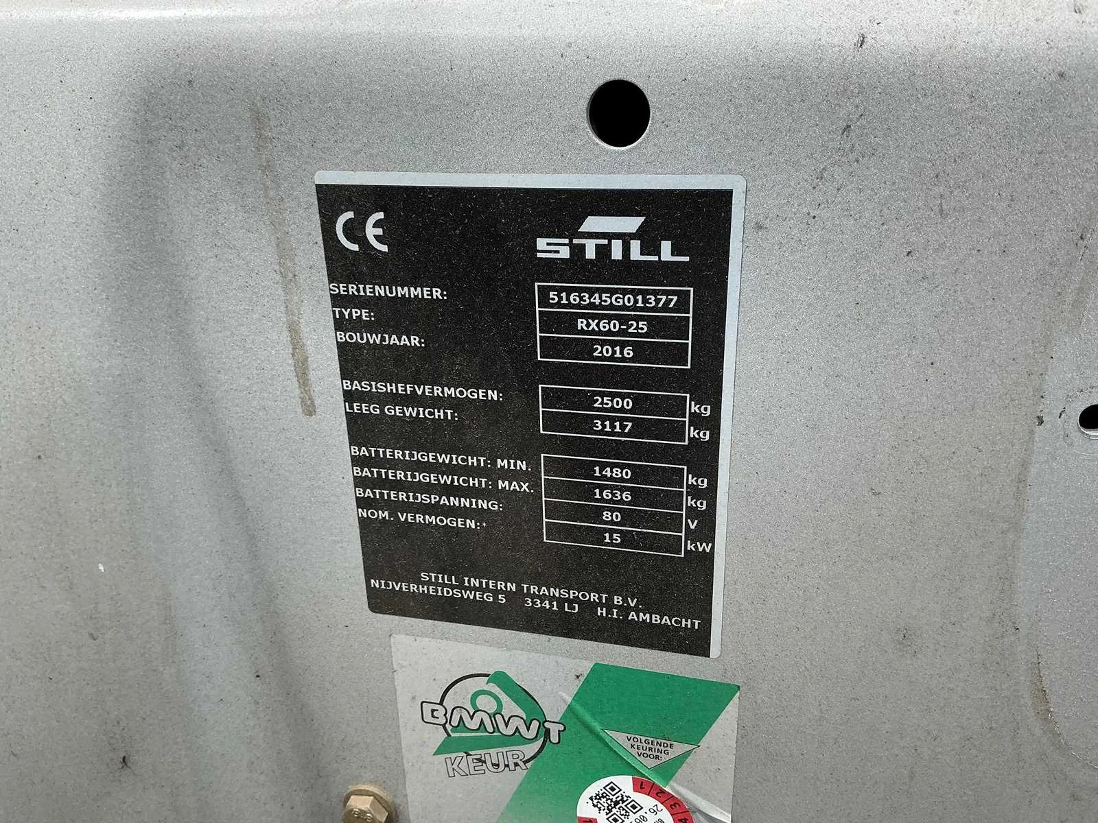 Merk: STILL Type: RX60-25 Bouwjaar: 2016 Serienummer: EUR-Lex - 516345G01377 - NL Mast: Niho Afgelezen urenstand: 6479 Free-lift: true Side-shift: true Eigen gewicht: 4500kg Hefvermogen: 2500kg Lepellengte: 1200mm Hefhoogte: 3690mm Minimale doorrijhoogte: 2450mm