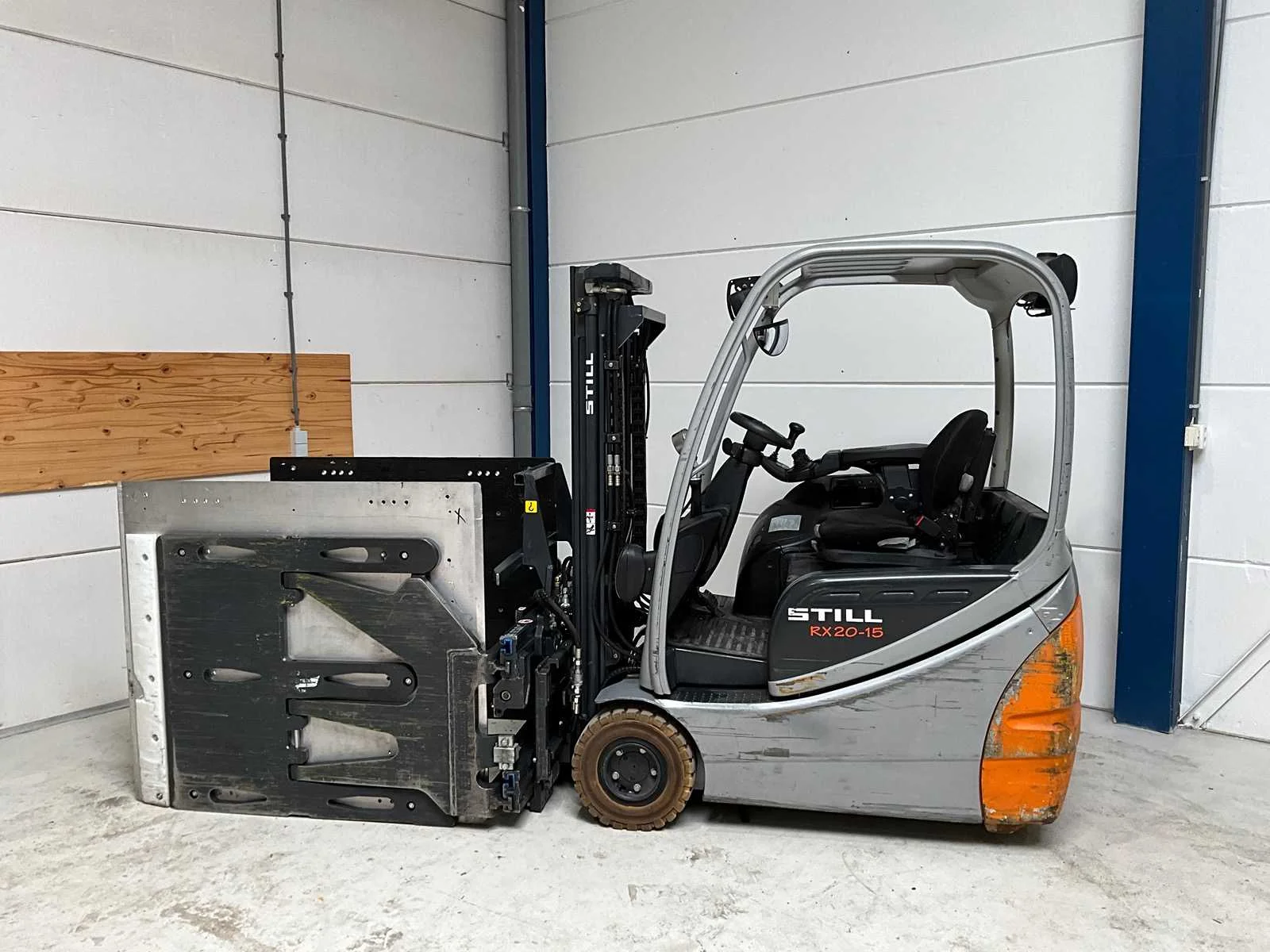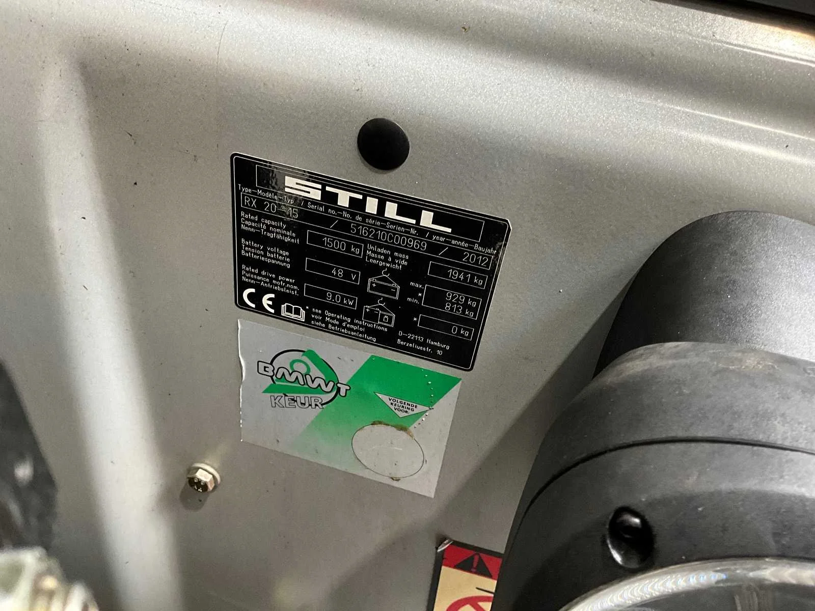 Merk: STILL Type: RX20-15 Bouwjaar: 2012 Mast: Duplex freelift Aantal wielen: 3 Afgelezen urenstand: 3908 Side-shift: true Hydraulisch verstelbare lepels: true Duplex mast: true Eigen gewicht: 3000kg Hefvermogen: 1500kg Hefhoogte: 2950mm Totale afmeting Hoogte: 2060mm