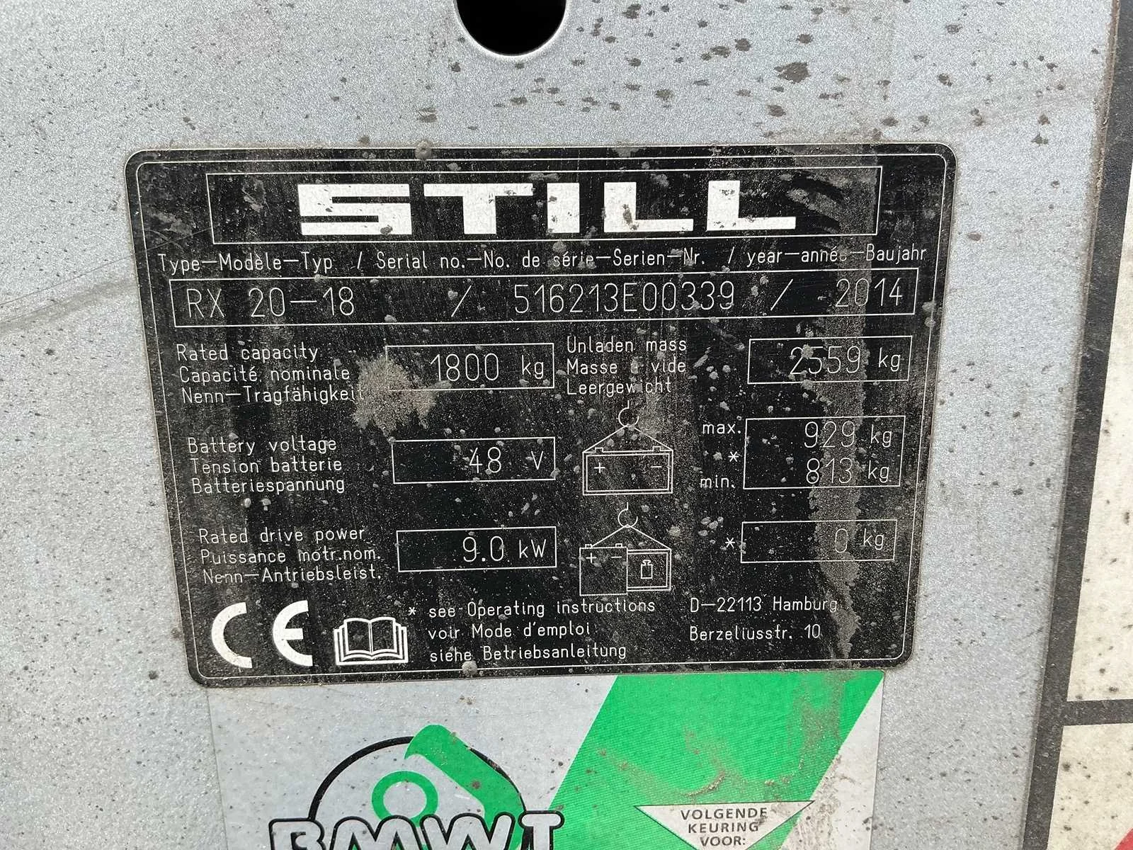 Merk: STILL Type: RX20-18 Bouwjaar: 2014 Serienummer: 516213E00339 Mast: Niho Side-shift: true Duplex mast: true Hefvermogen: 1800kg Hefhoogte: 3360mm Minimale doorrijhoogte: 2160mm