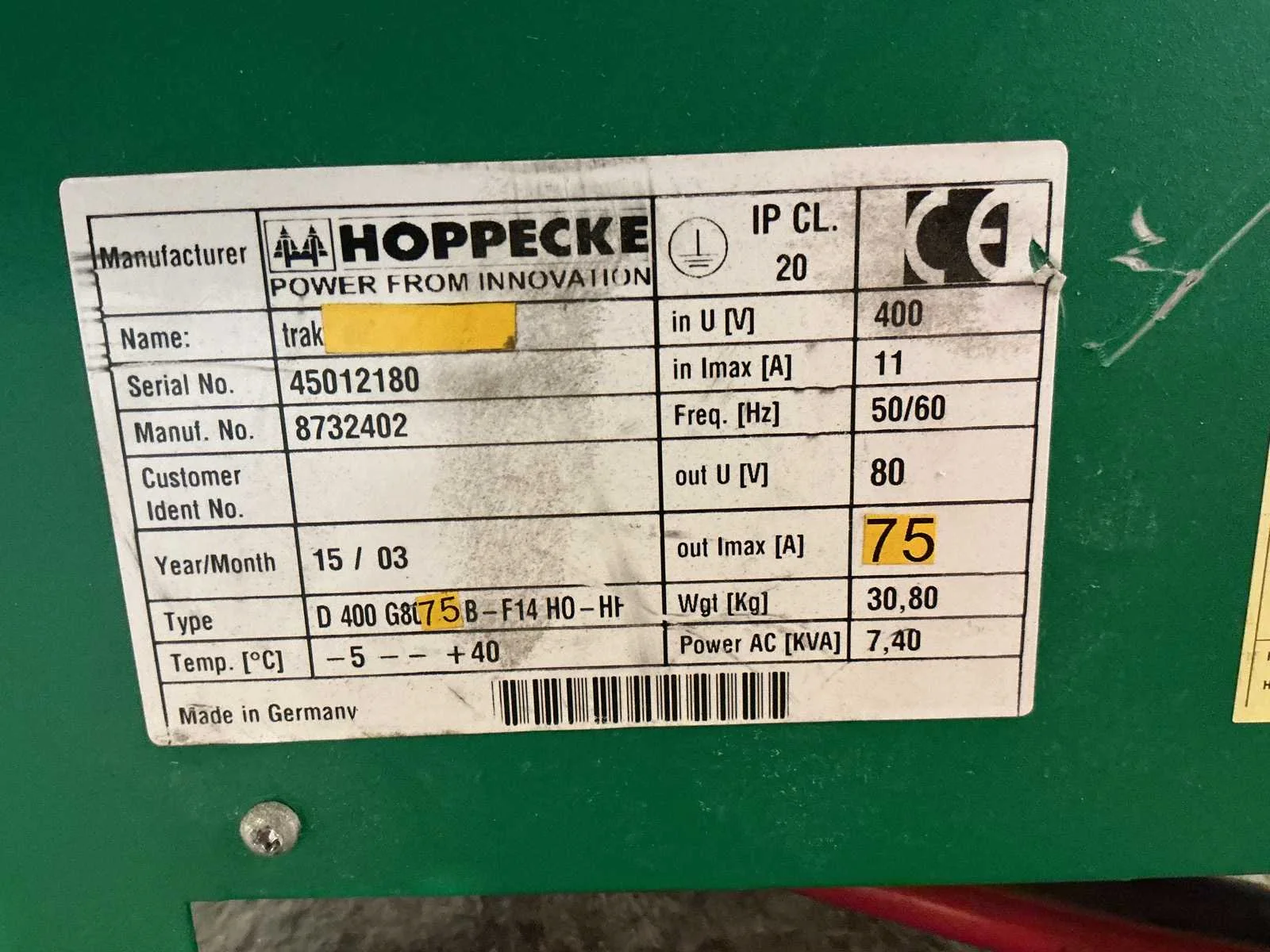 Merk: HOPPECKE Type: 80V 75A Bouwjaar: 2015 Spanning: 80V Laadstroom: 75A