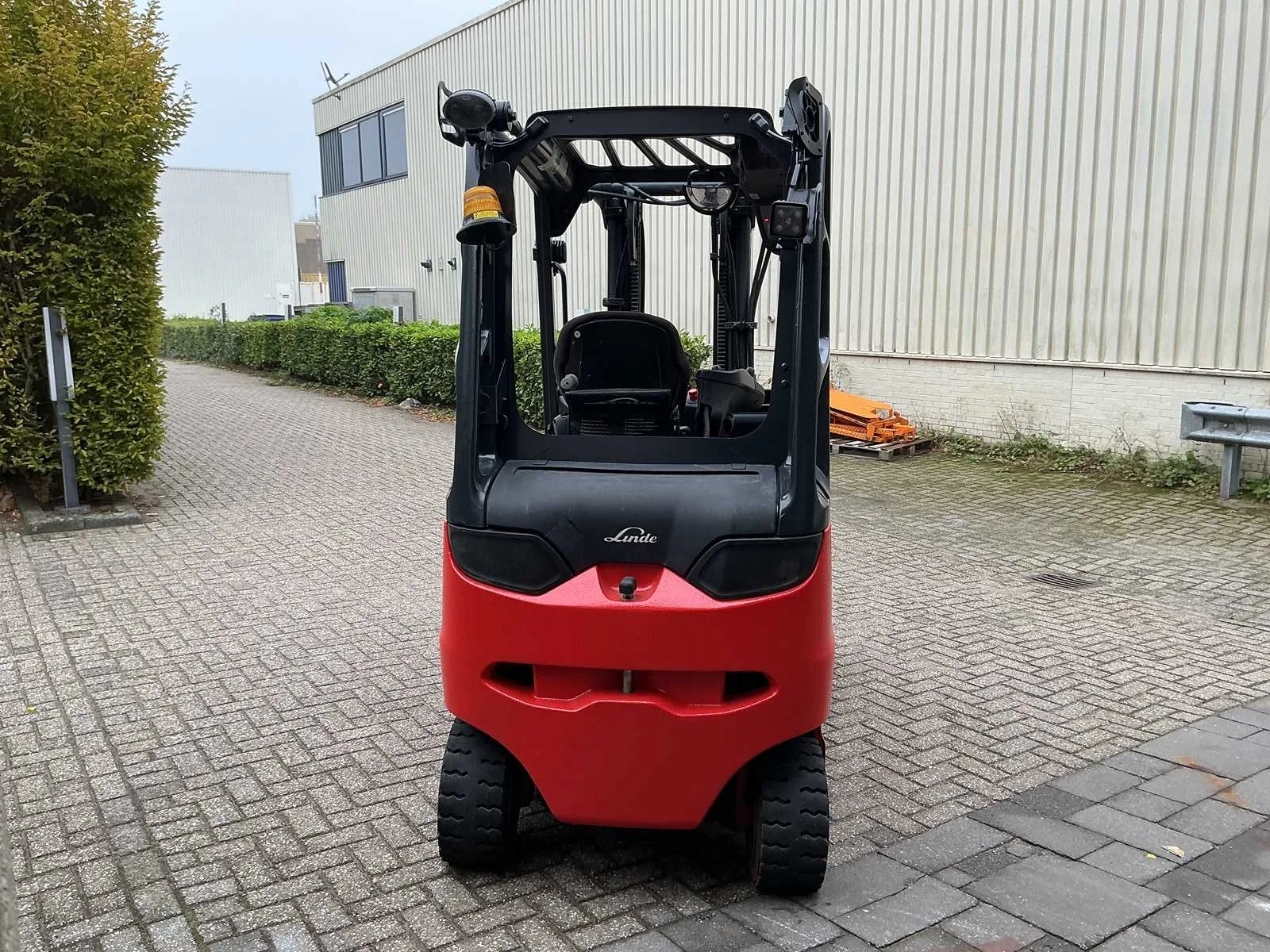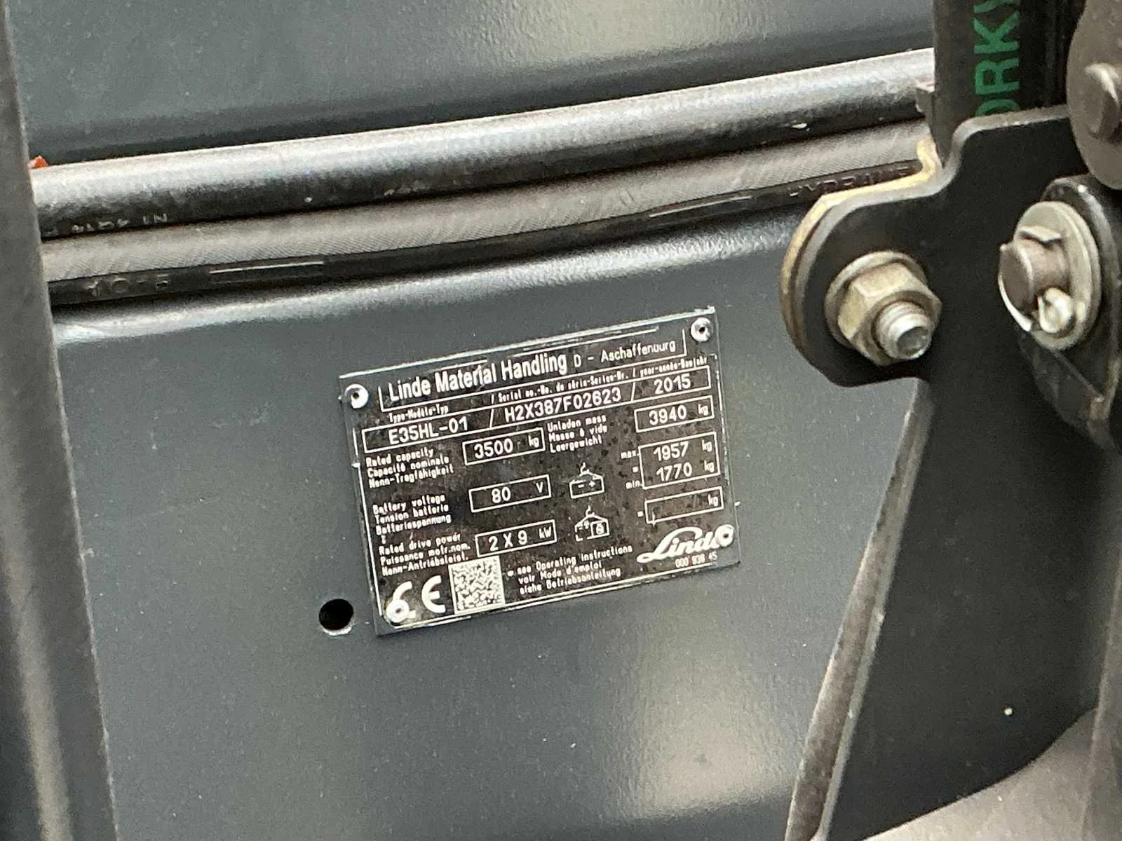 Merk: Linde Type: E35 Bouwjaar: 2015 Mast: Triplex Aantal wielen: 4 Afgelezen urenstand: 7712 Free-lift: true Triple mast: true Eigen gewicht: 6000kg Hefvermogen: 3500kg Lepellengte: 1200mm Hefhoogte: 4800mm Minimale doorrijhoogte: 2250mm