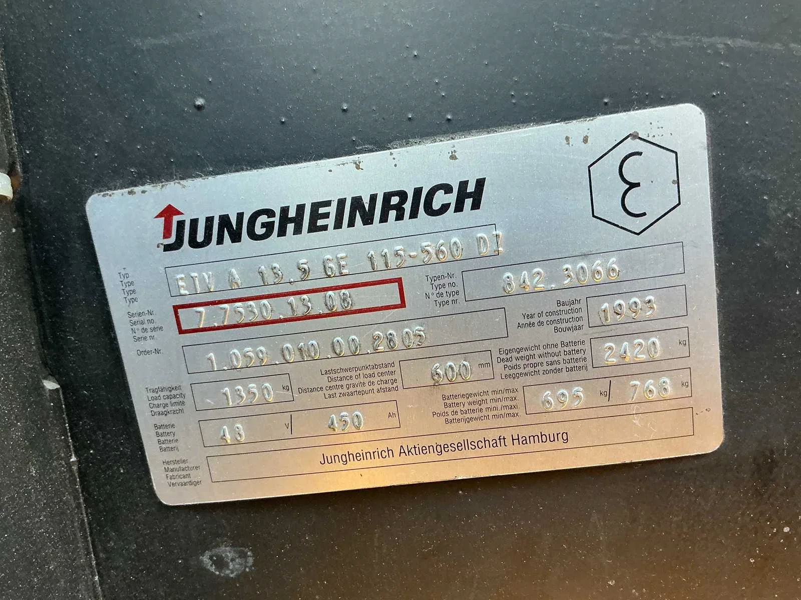 Merk: Jungheinrich Type: ETV A 13.5 GE Bouwjaar: 1993 Serienummer: 775301308 Mast: Triplex Afgelezen urenstand: 6454 Side-shift: true Triple mast: true Hefvermogen: 1350kg Lepellengte: 1155mm Minimale doorrijhoogte: 2400mm