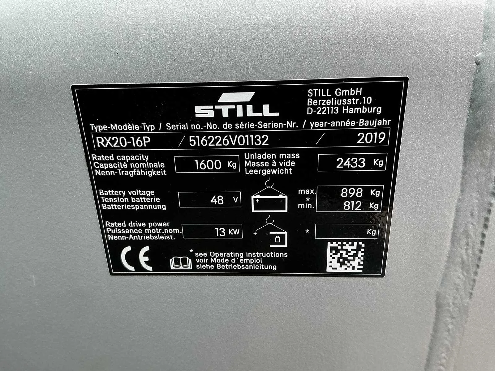 Merk: STILL Type: RX20-16P Bouwjaar: 2019 Serienummer: 516226V01132 Mast: Triplex Aantal wielen: 4 Afgelezen urenstand: 13237 Free-lift: true Side-shift: true Hydraulisch verstelbare lepels: true Triple mast: true Hefvermogen: 1600kg Lepellengte: 1100mm Hefhoogte: 4620mm Minimale doorrijhoogte: 2260mm
