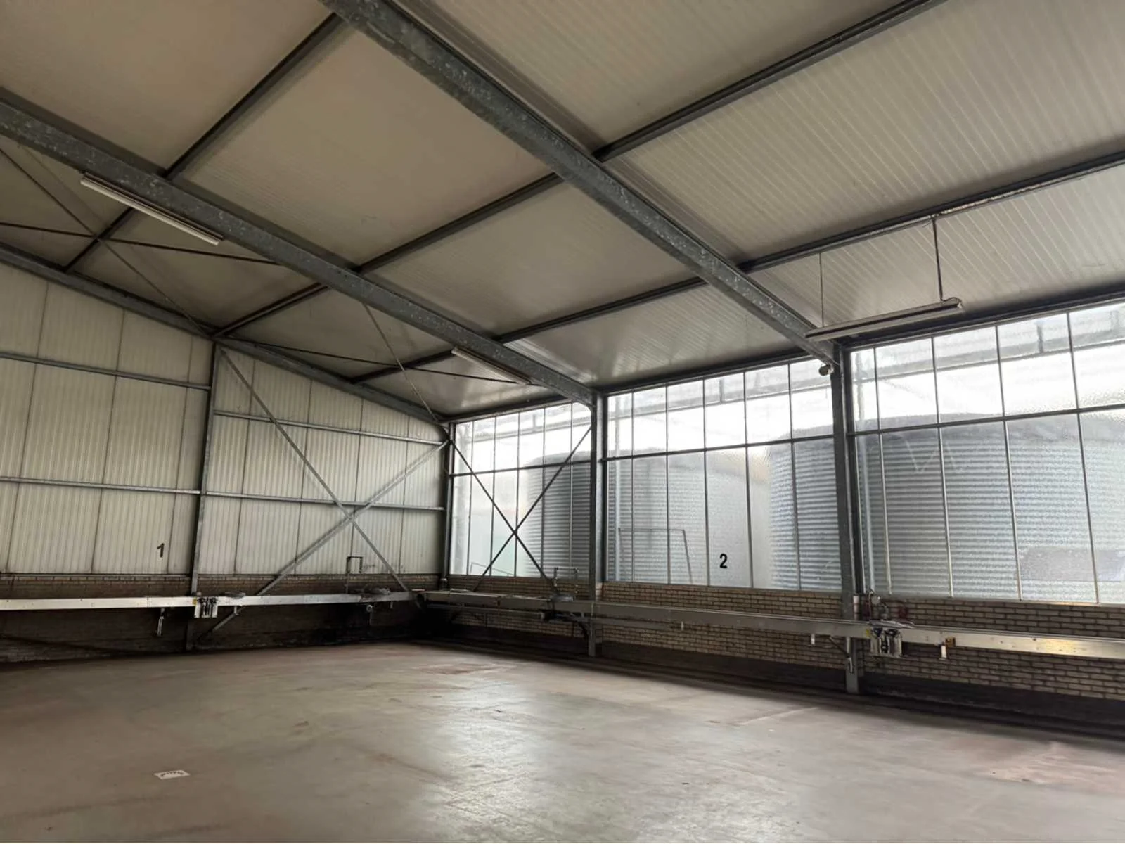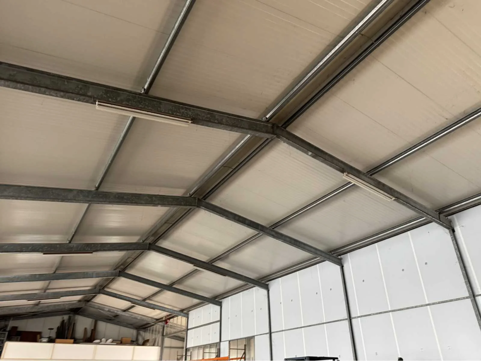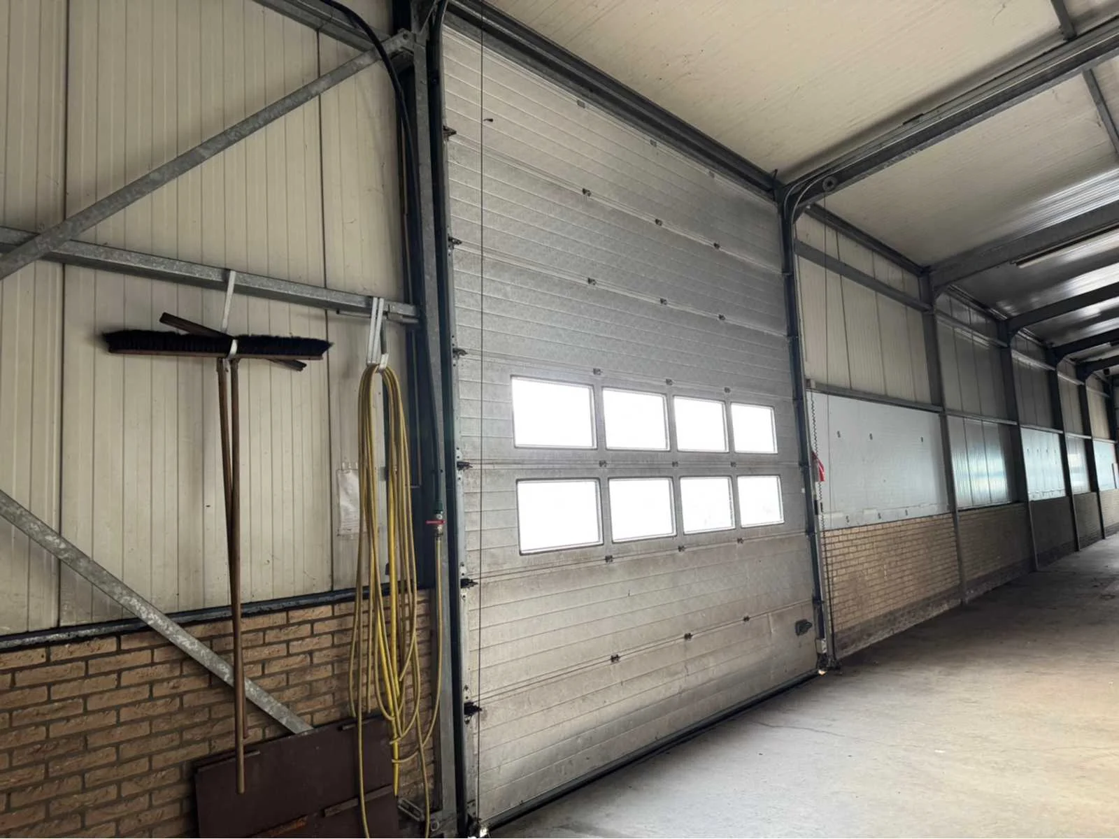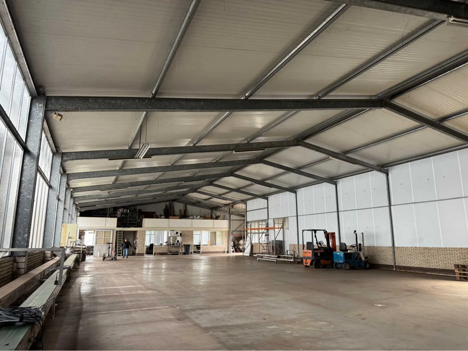 Vrije overspanning van 16000 mm; totale constructie lengte 40840 mm; met gedeelte van tussen gevel tot buitengevel “aanbouw gedeelte” van ca. 4400 mm breed en 31500 mm lang; vakmaat 4000 mm; goothoogte 4550 mm; nokhoogte 6450 mm; 1 zijde van de constructie zijn spantbenen IPE 300; staanders IPE 300; andere zijde spantbenen IPE 240; staanders IPE 160; tussen staanders voor tussen gevel IPE 160; kopgevel constructie spantbenen en staanders IPE 160; dak en gevels van stalen gordingen; dak en gevels met schoren en windverbanden; dak met drukkokers; dak helemaal van sandwichpanelen; gevels gedeeltelijk geïsoleerd; 2 overheaddeuren van 4250 mm breed en 4320 mm hoog; wordt gedemonteerd en transport klaar gemaakt door verkoper; LET OP; afhalen ca. half november; Materiaal: Staal, sandwich
