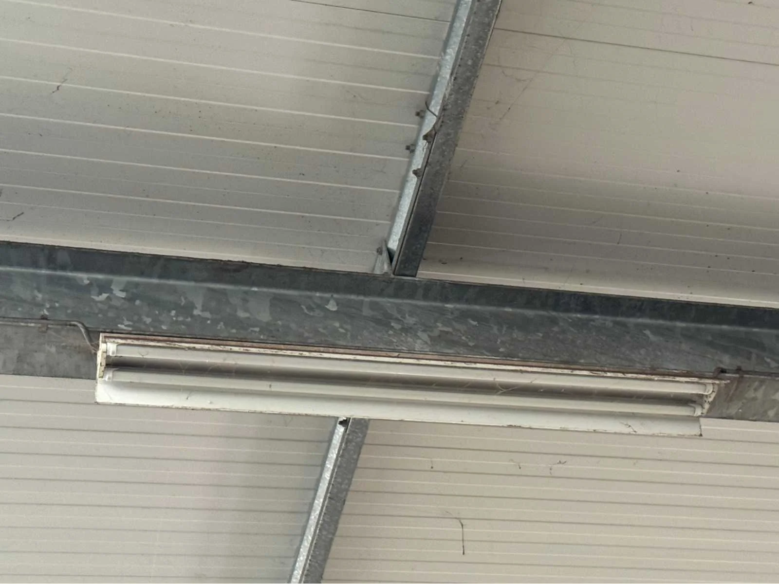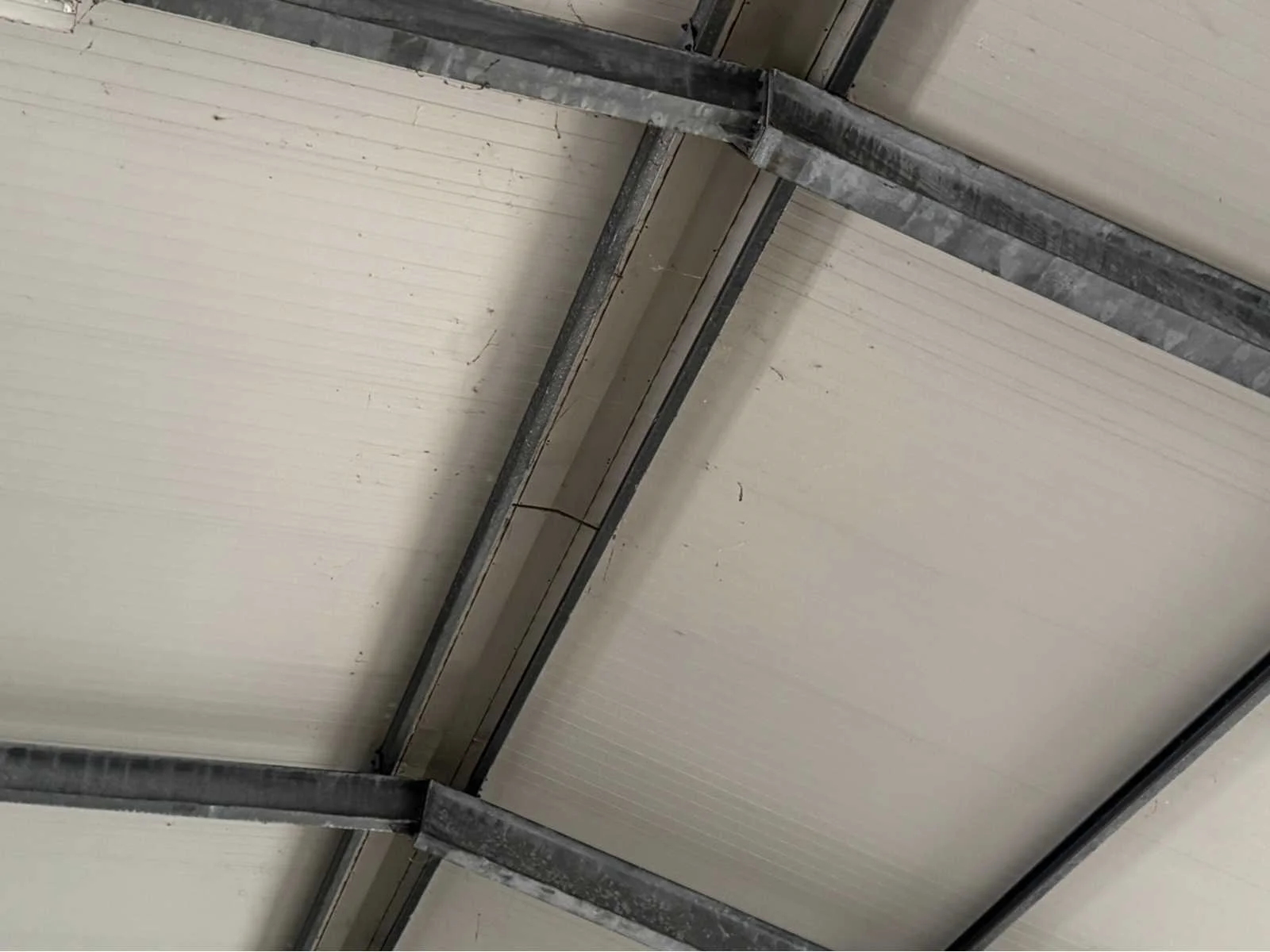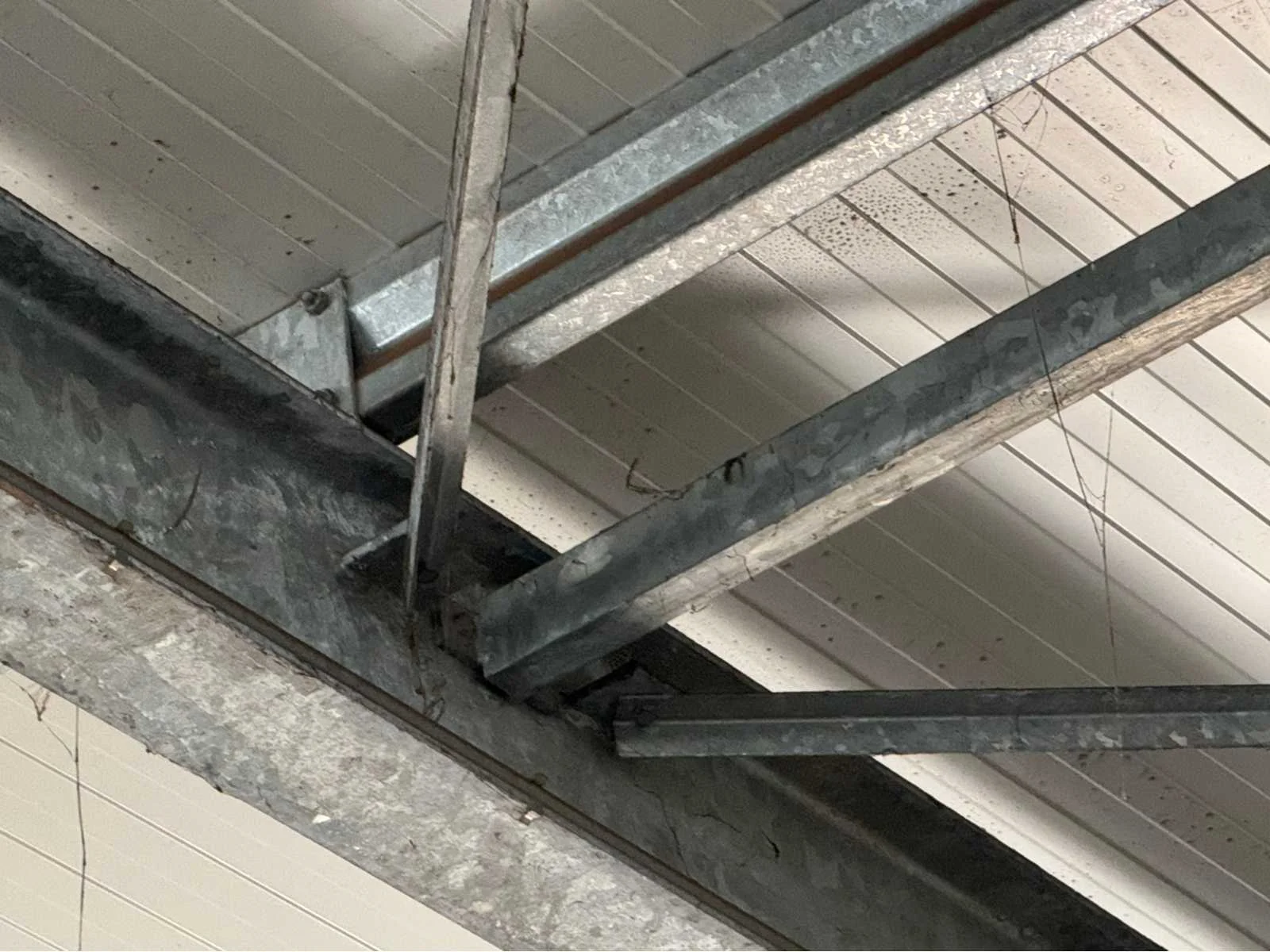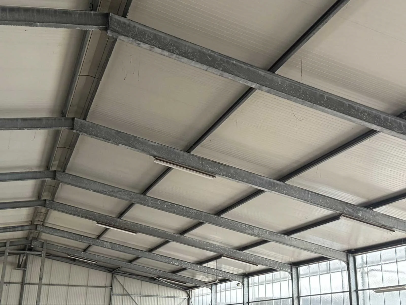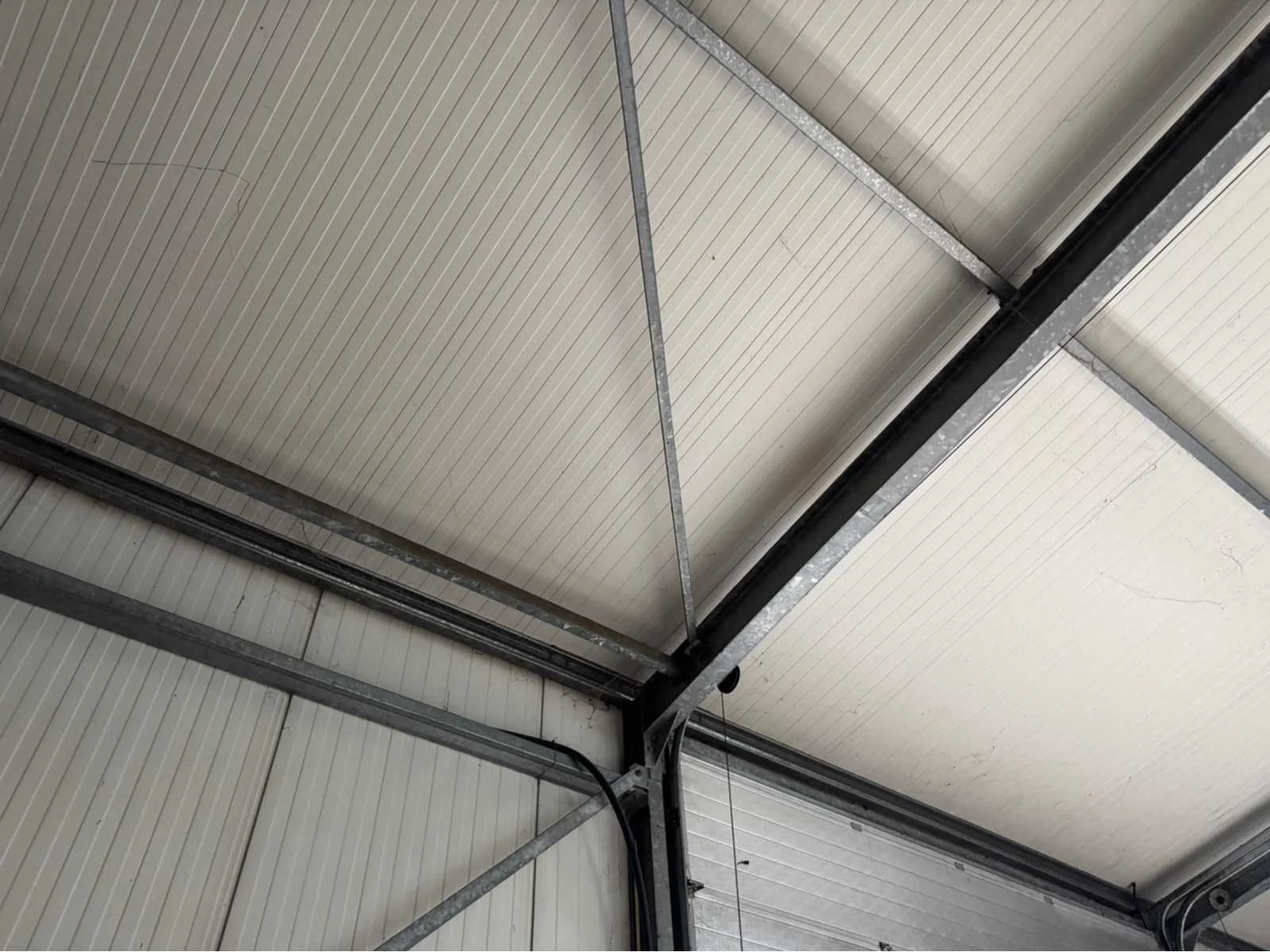Vrije overspanning van 16000 mm; totale constructie lengte 40840 mm; met gedeelte van tussen gevel tot buitengevel “aanbouw gedeelte” van ca. 4400 mm breed en 31500 mm lang; vakmaat 4000 mm; goothoogte 4550 mm; nokhoogte 6450 mm; 1 zijde van de constructie zijn spantbenen IPE 300; staanders IPE 300; andere zijde spantbenen IPE 240; staanders IPE 160; tussen staanders voor tussen gevel IPE 160; kopgevel constructie spantbenen en staanders IPE 160; dak en gevels van stalen gordingen; dak en gevels met schoren en windverbanden; dak met drukkokers; dak helemaal van sandwichpanelen; gevels gedeeltelijk geïsoleerd; 2 overheaddeuren van 4250 mm breed en 4320 mm hoog; wordt gedemonteerd en transport klaar gemaakt door verkoper; LET OP; afhalen ca. half november; Materiaal: Staal, sandwich
