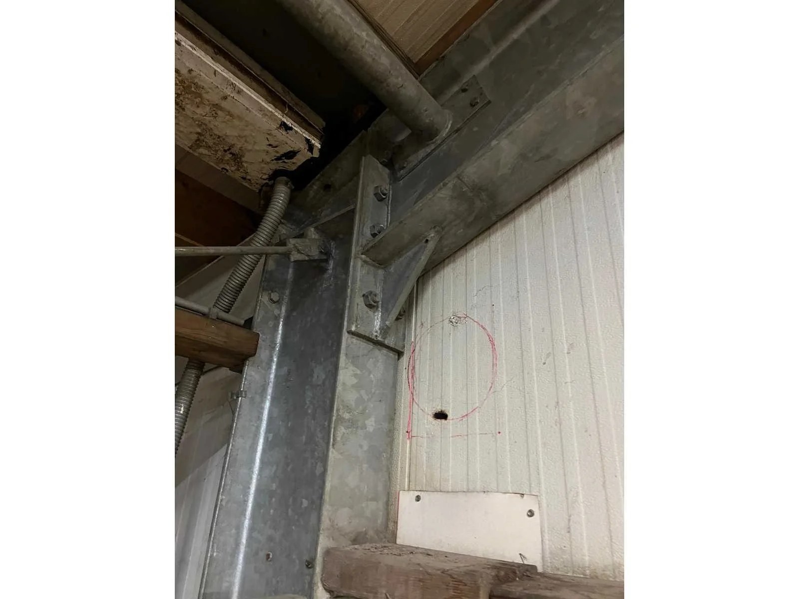 Overkapping diepte 10000 mm; totale lengte object 10 vakken van 5000 mm is 50000 mm; hoogte hoge zijde 6700 mm; hoogte lage zijde 0000 mm; kolommen IPE 330 en IPE 300; spantbenen IPE 300; volblad verzinkte constructie; dek en gevel gordingen van hout; stalen drukbalken; schoor strippen; windverbanden dak; constructie gemonteerd met bouten en moeren; met dak beplating; constructie wordt gedemonteerd door opdrachtgever en transport klaar gemaakt; kijkdag en afhalen op afspraak;