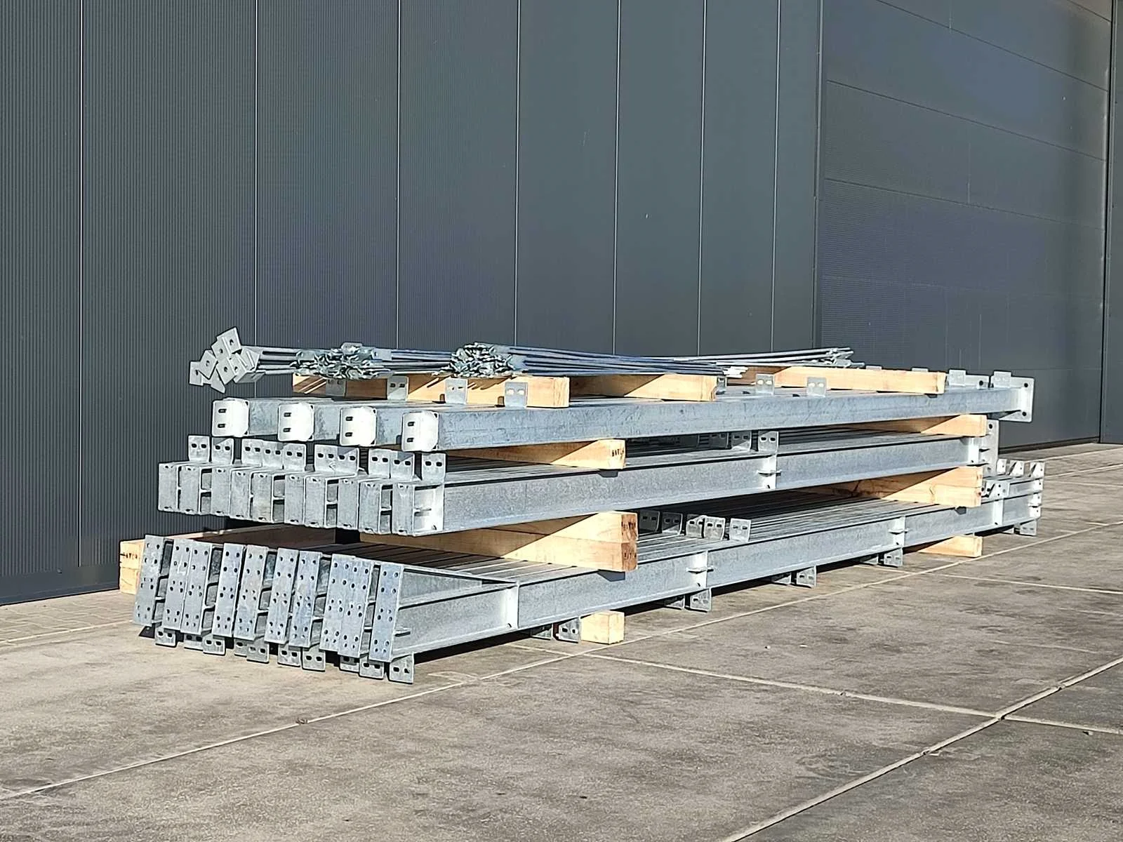 Ongebruikt; gegalvaniseerd staal; volblad verzinkt; bestaande uit IPE staanders en spanten; IPE 160 zowel staanders als spanten; inclusief windverbanden Materiaal: Staal Bouwjaar: 2023 Totaal oppervlakte: 160m² Goot hoogte: 4000mm Totale afmeting L: 16000mm Totale afmeting Breedte: 10000mm