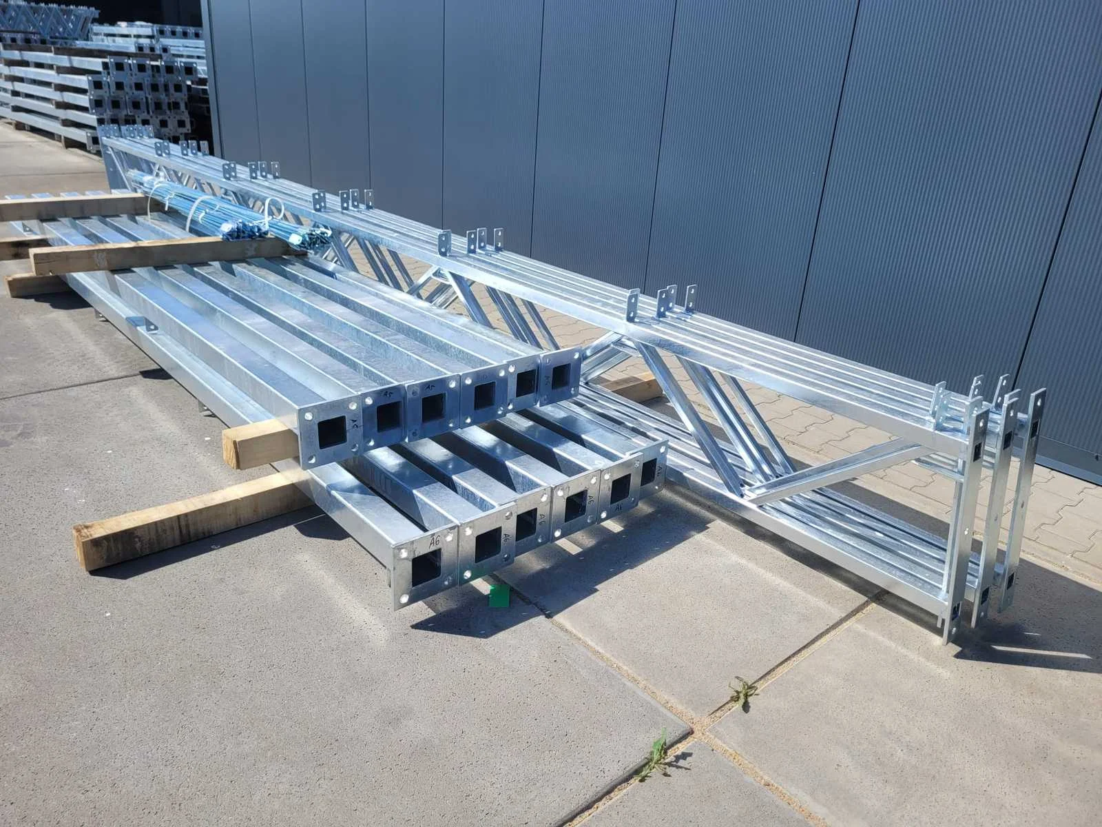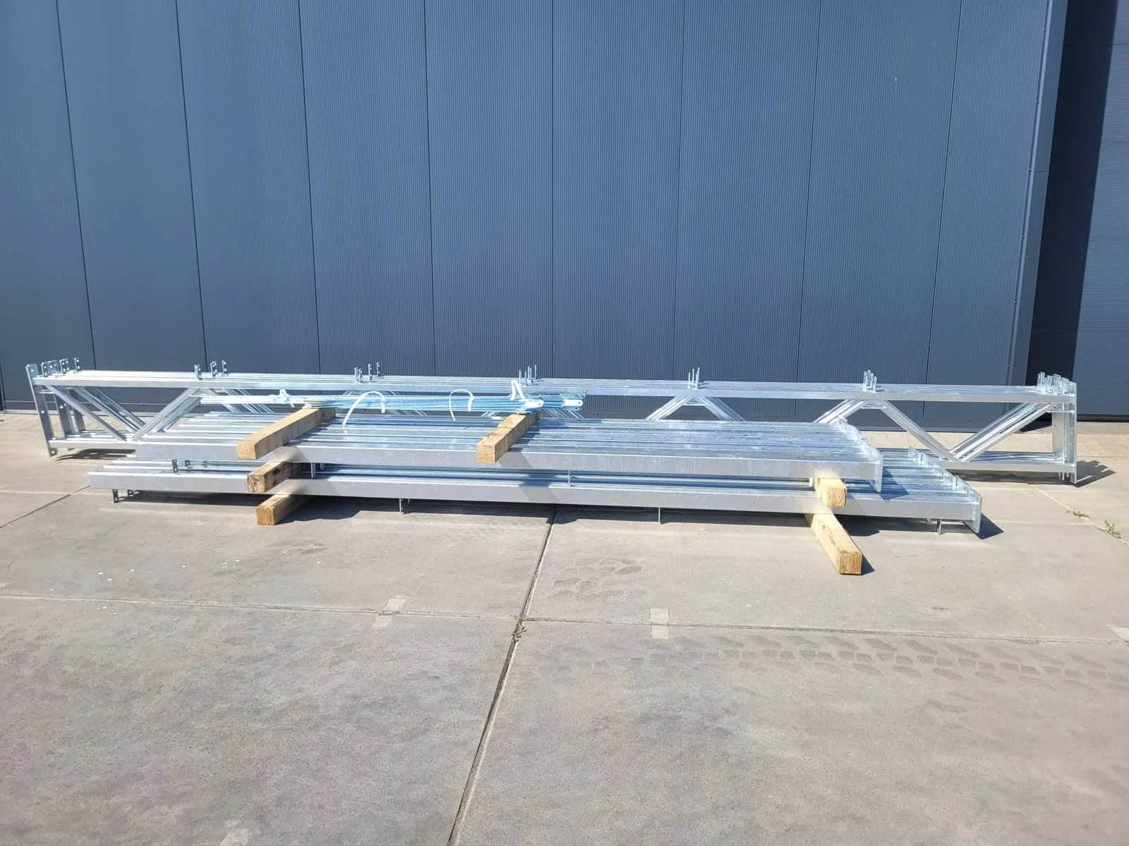 Gegalvaniseerd staal; ongebruikt Totaal oppervlakte: 112m² Goot hoogte: 4000mm Totale afmeting L: 16000mm Totale afmeting Breedte: 7000mm
