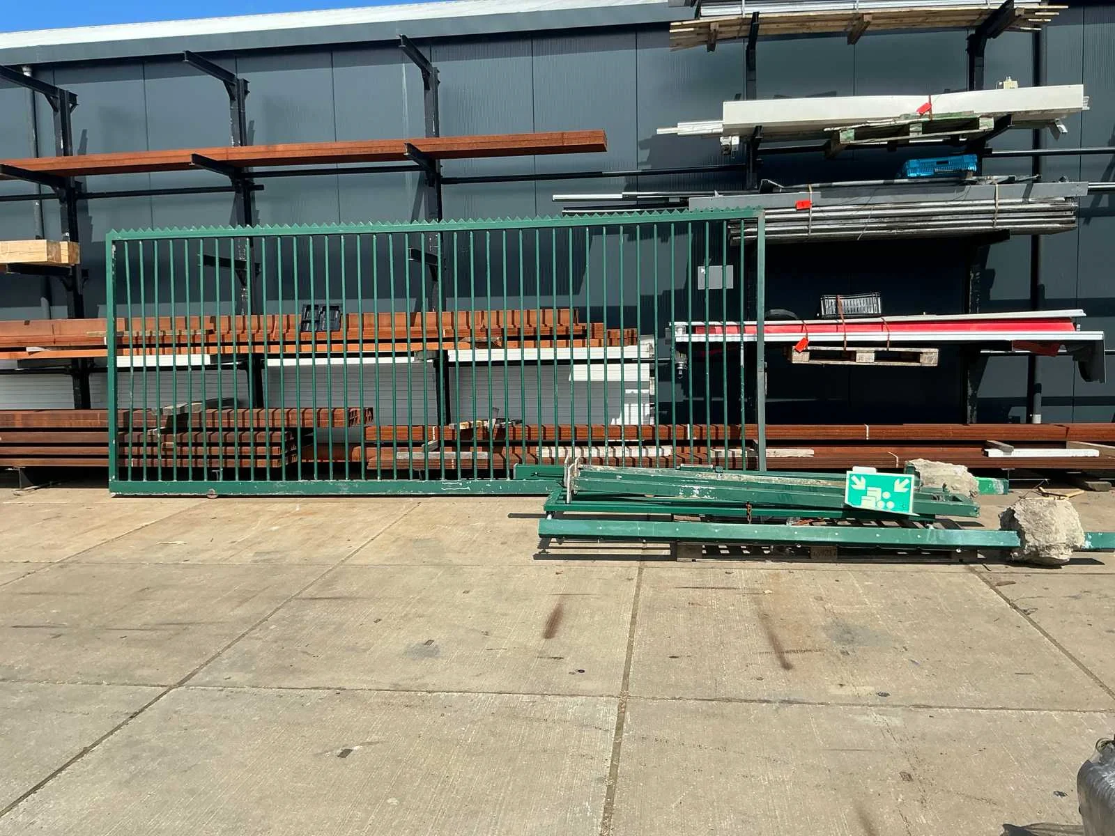 Draaipoort van 1x 6000 mm breed en 2450 mm hoog; 1x draaideur afmetingen ca 1450 mm; steun ijzer voor prikkeldraad Merk: Heras