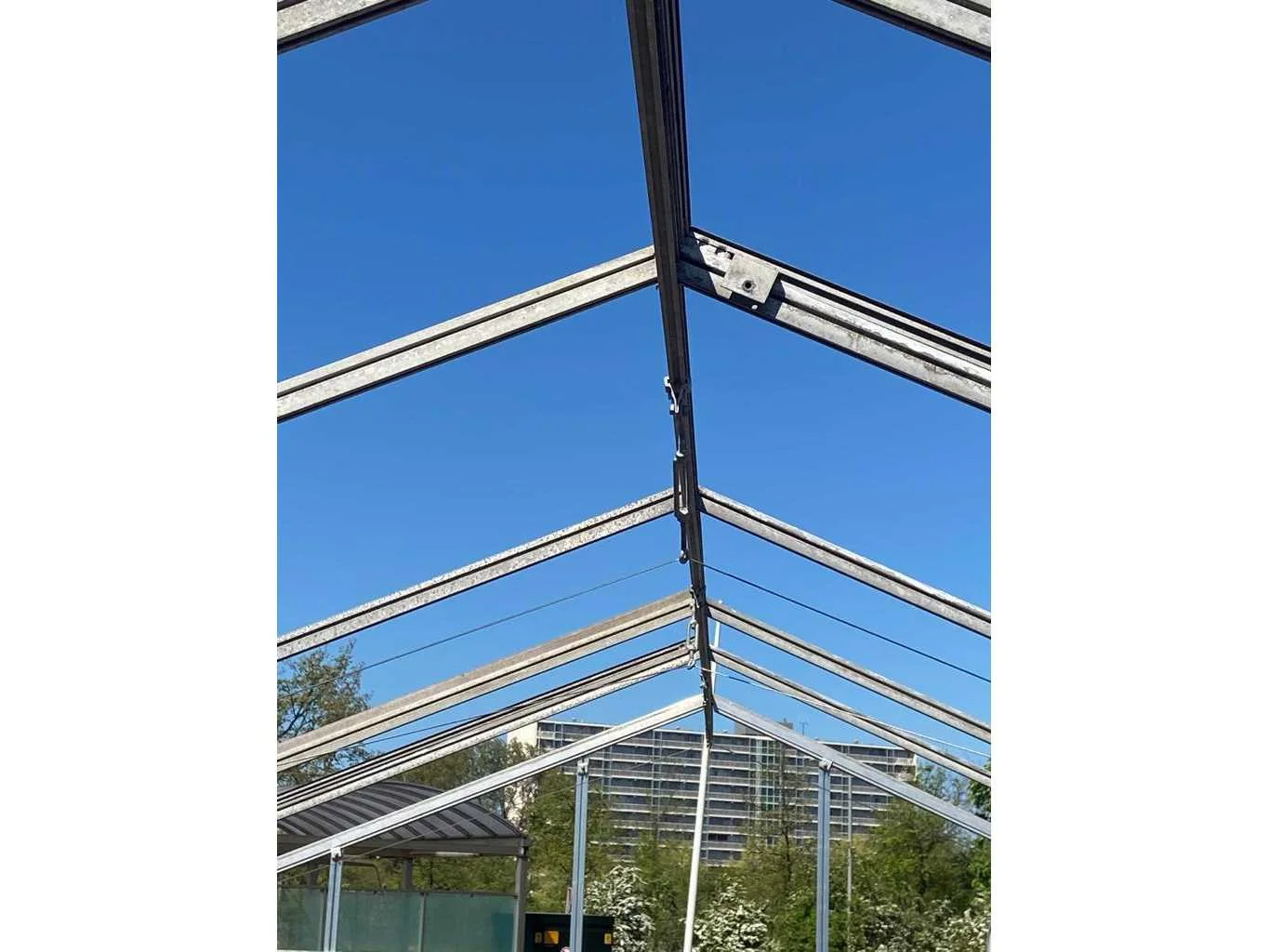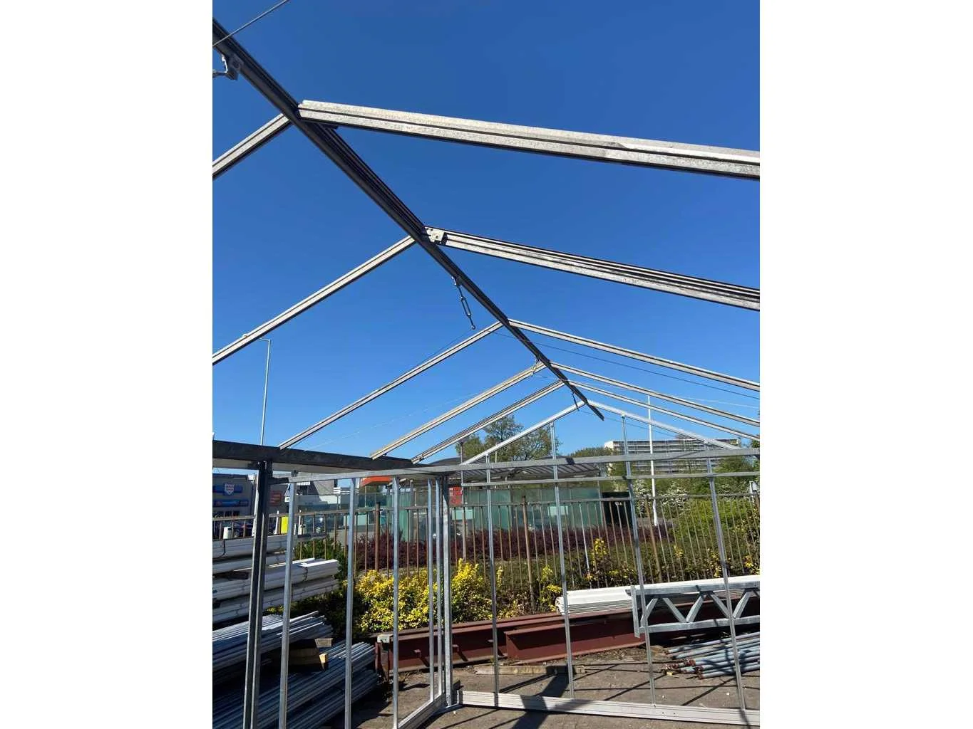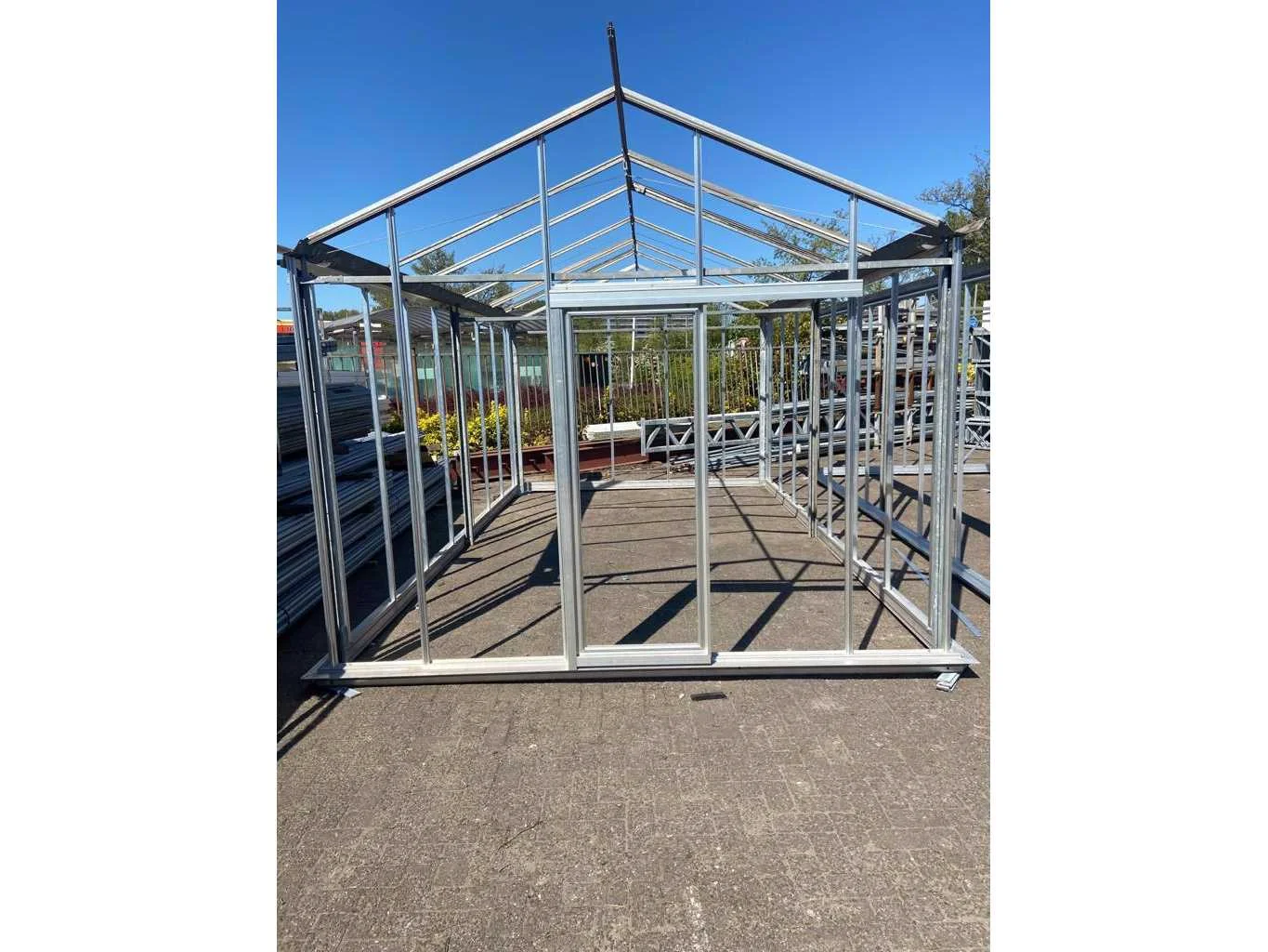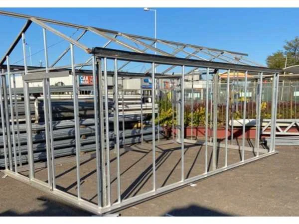Vrije overspanning 3200 mm; v.v. nieuwe aluminium gevels; deur; onderprofiel; rubber; klein materiaal zit erbij inbegrepen; dek is v.v. 2 luchtramen; glas voor dek en gevel staat op 1 bok gestapeld; punten voor de gevels dienen nog gesneden te worden; hobbykas betreft een mix tussen nieuwe en gebruikte materialen; bestaande uit 1 pallet materiaal en 1 bok glas; Goot hoogte: 2200mm Nok hoogte: 3000mm Totale afmeting L: 6000mm Totale afmeting Breedte: 3500mm