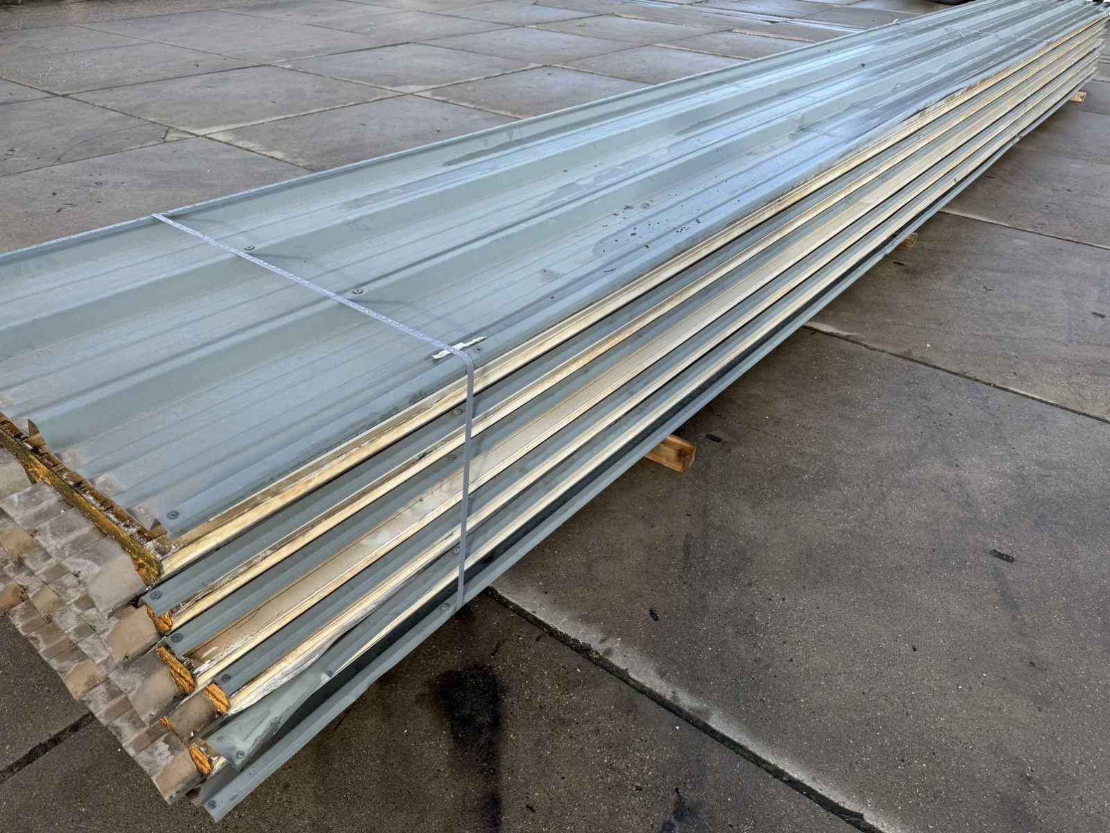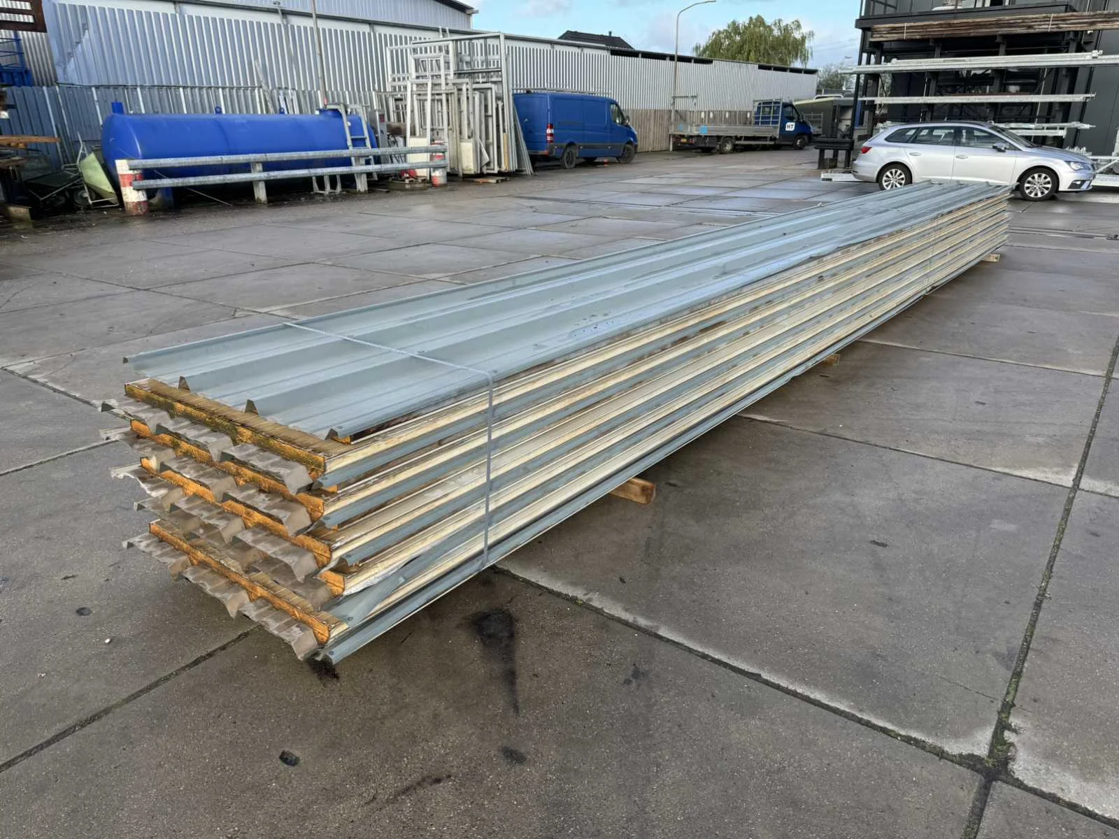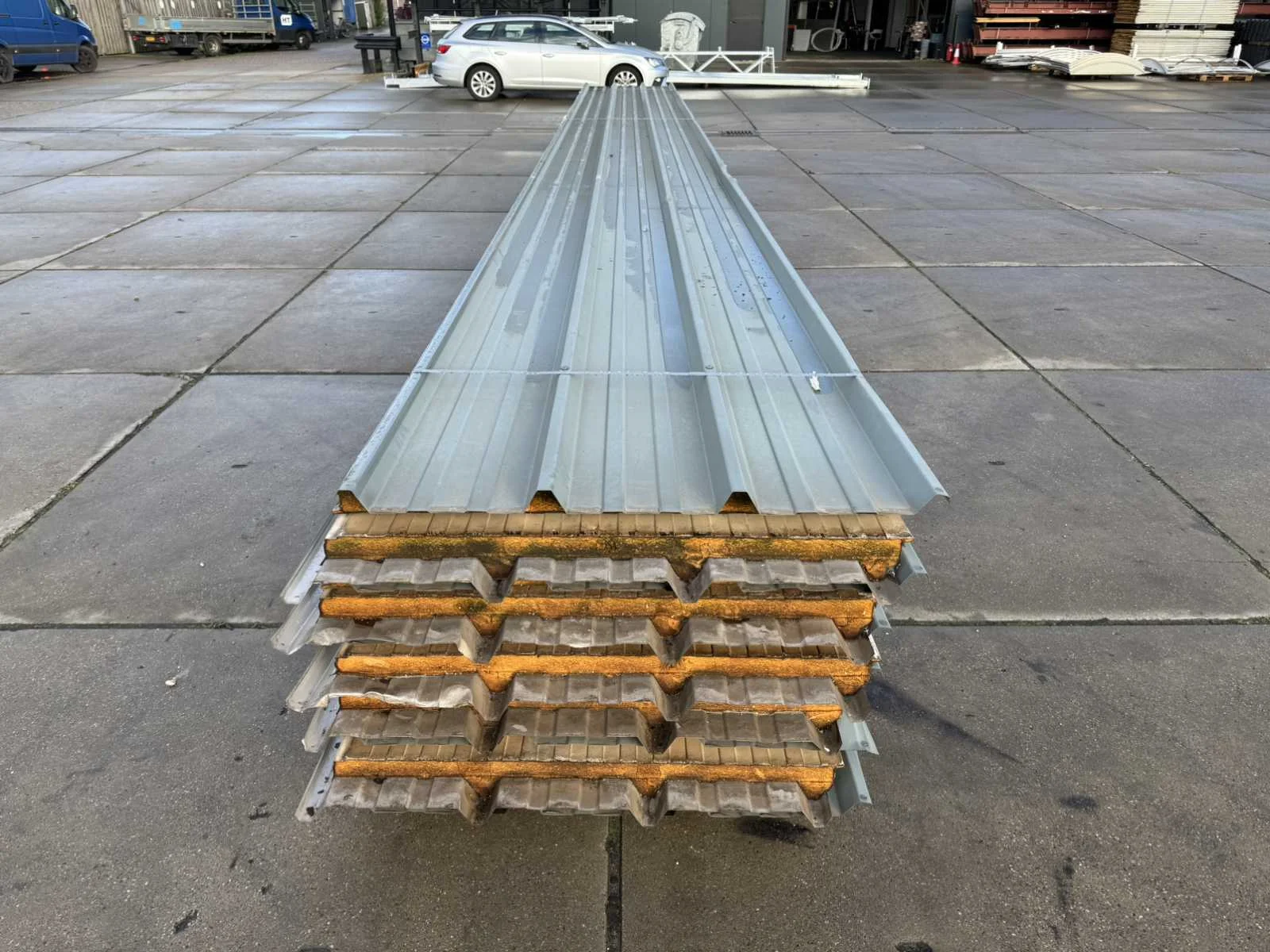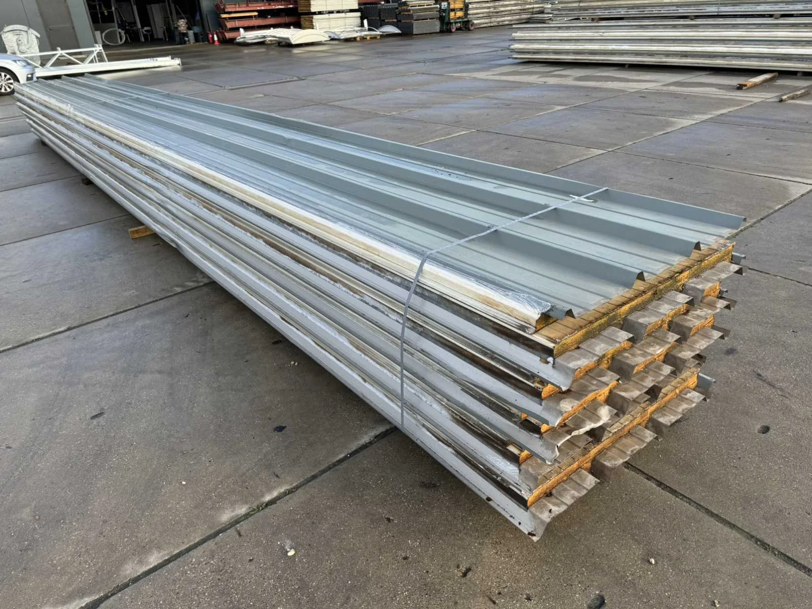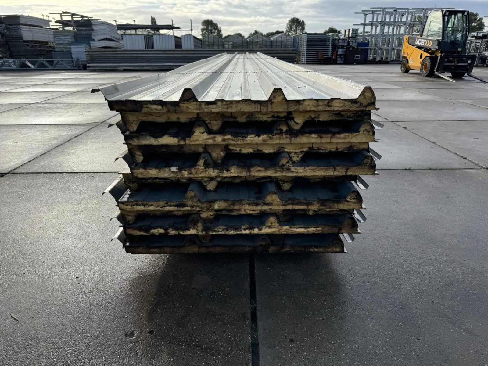 Sandwich dakpanelen; buitenkant kleur is grijs; binnenkant kleur is wit; dikte van de plaat ca 40mm Kleur: Grijs Lengte: 8010cm Breedte: 105cm Materiaal: Sandwich