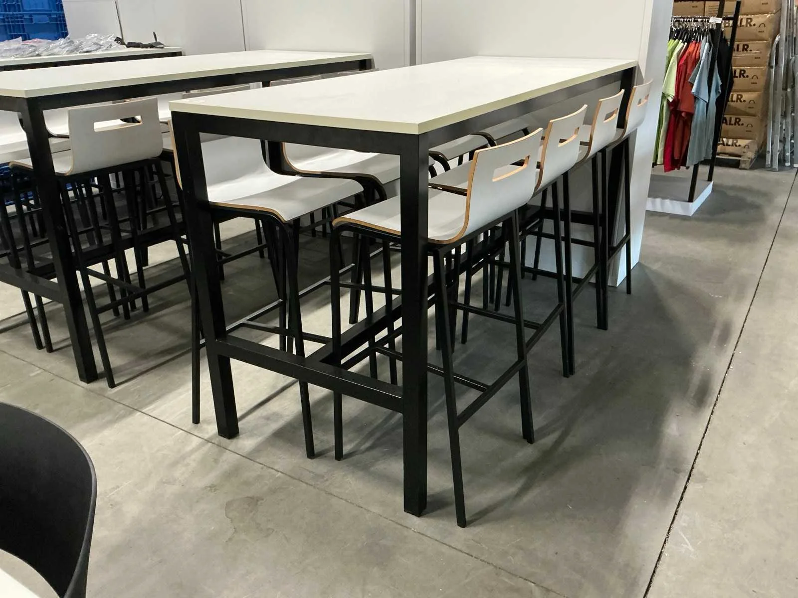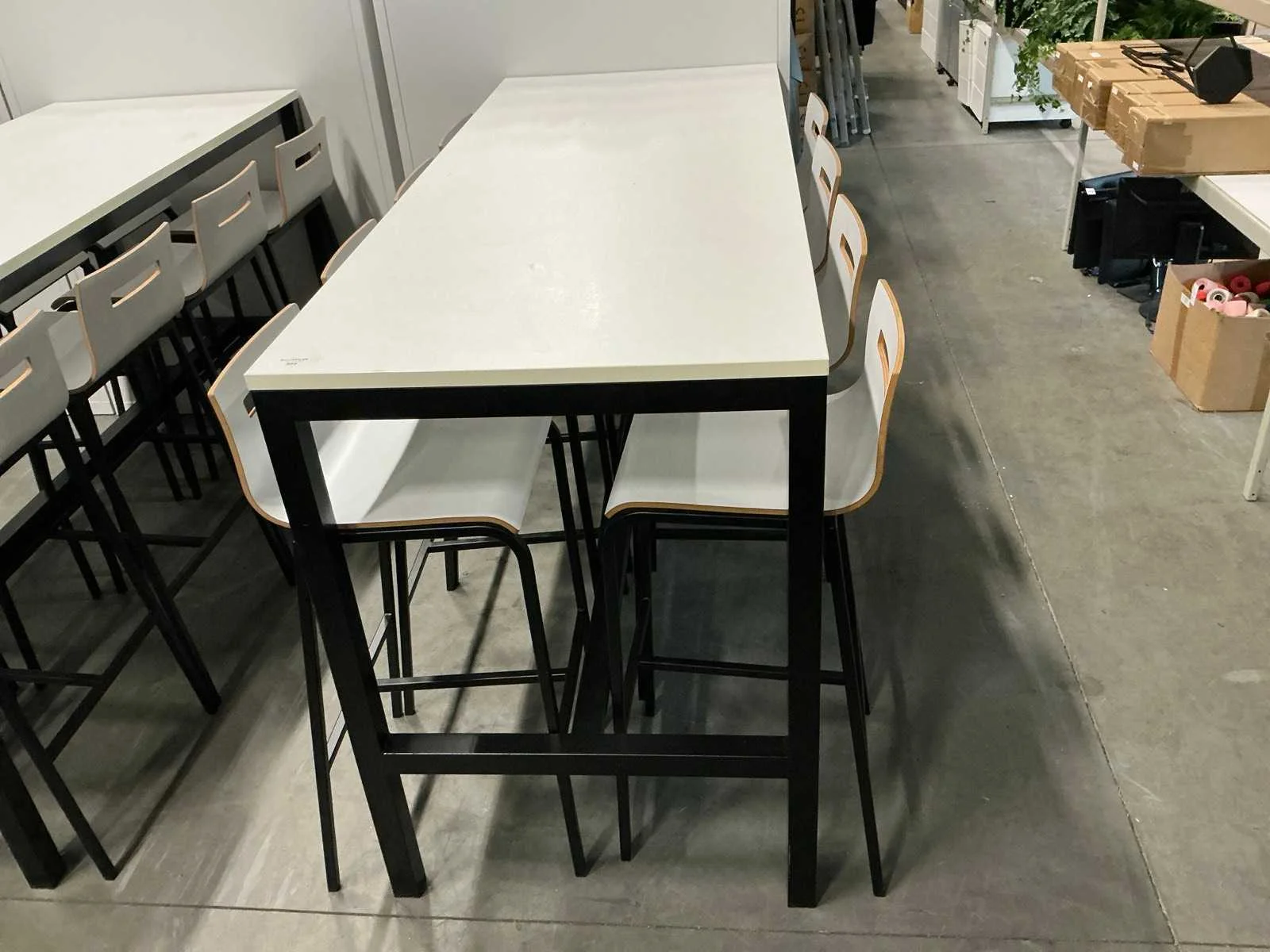 8 krukken. (zithoogte 82,5cm) 1 tafel. (Afmeting L200xB80xH111cm.)