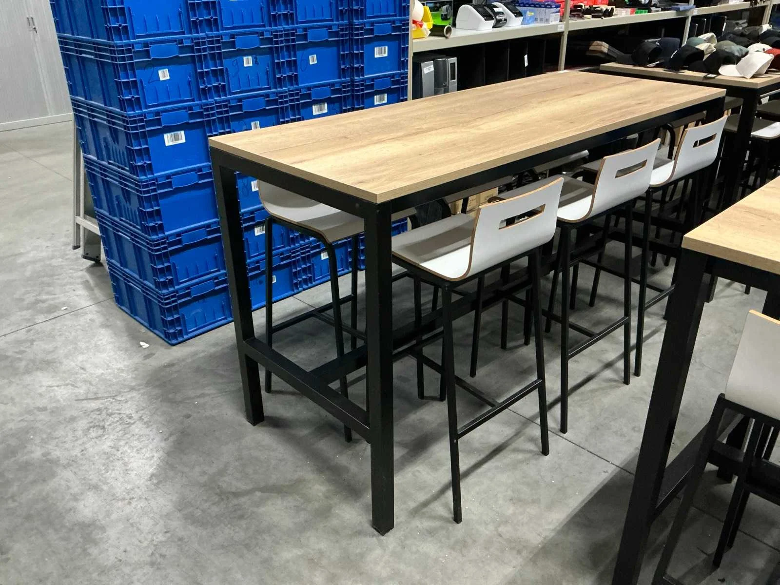 6 krukken. (zithoogte 82,5cm) 1 tafel. (Afmeting L200xB80xH111cm.)