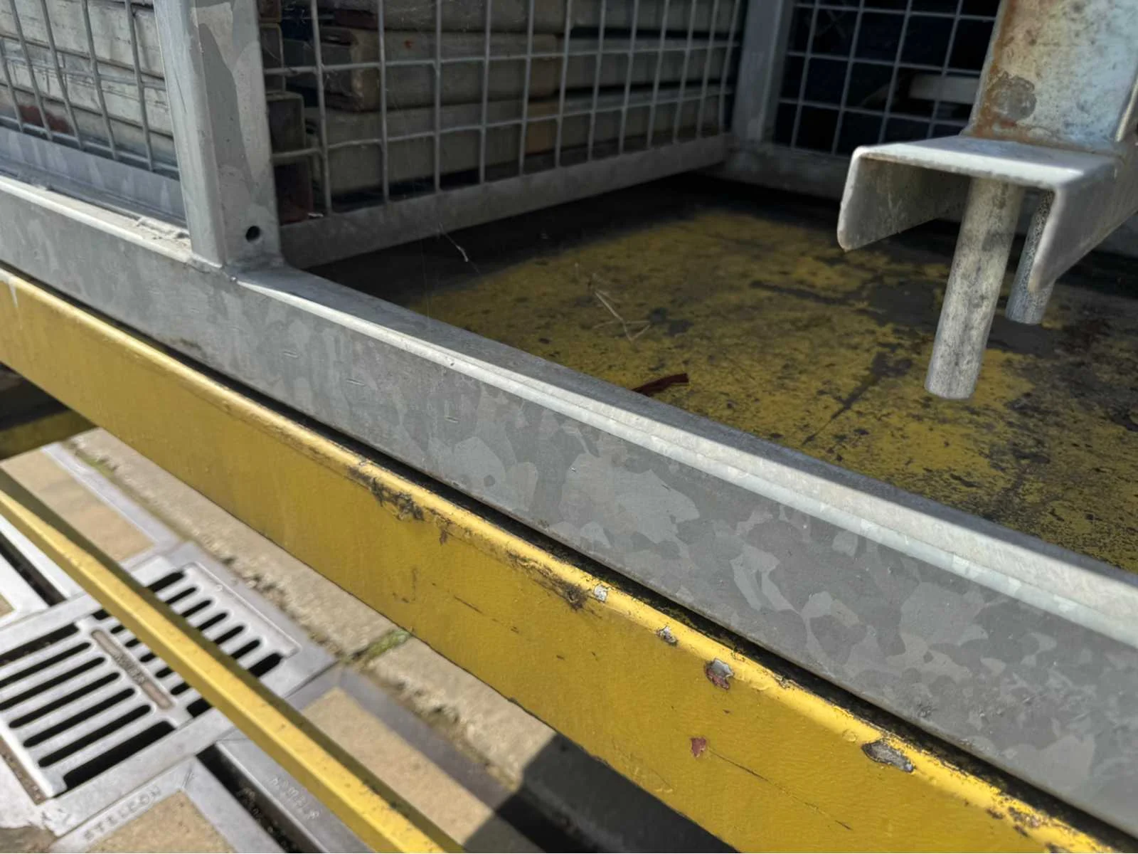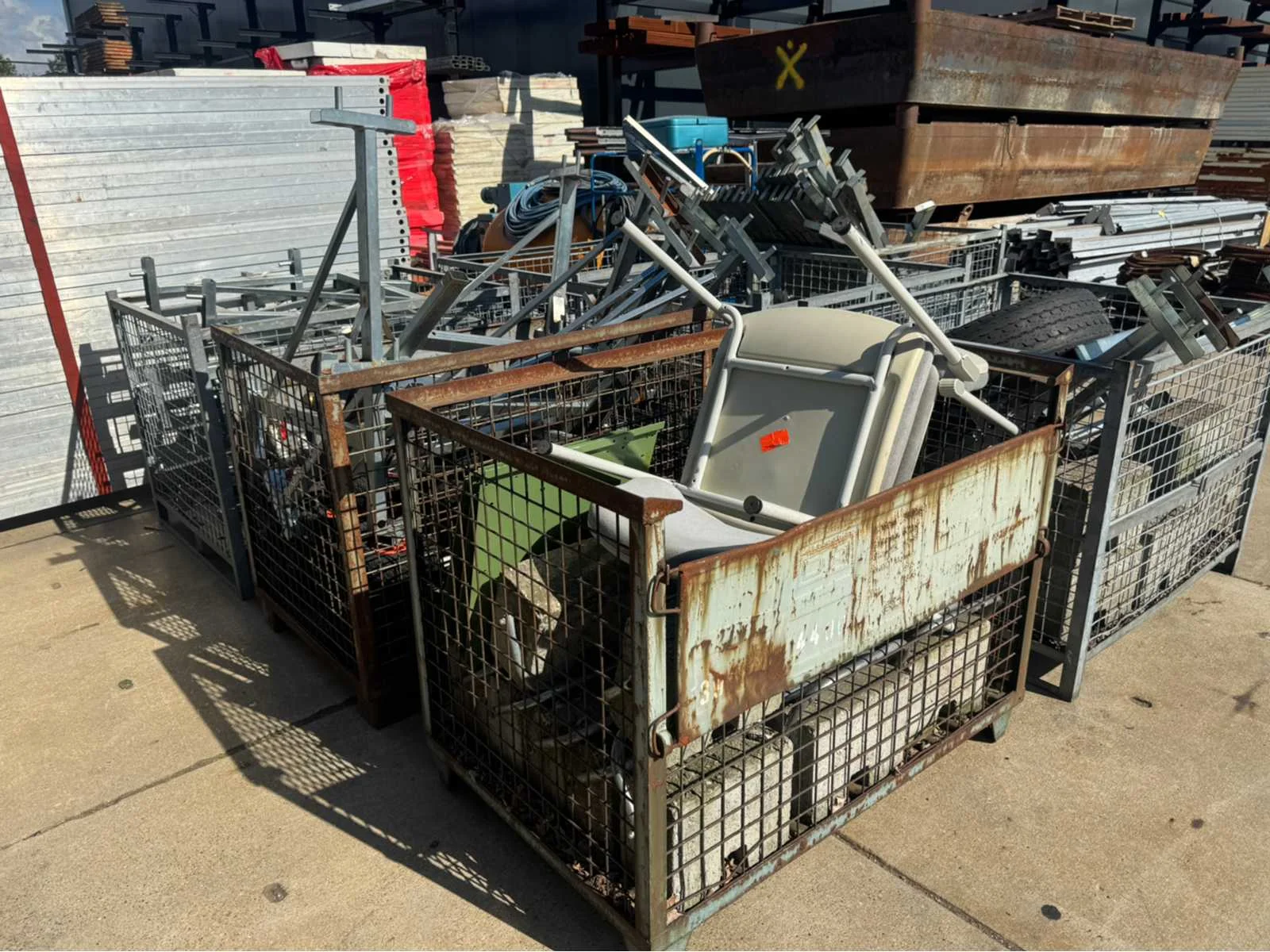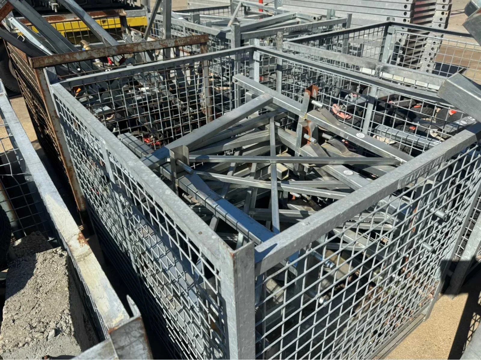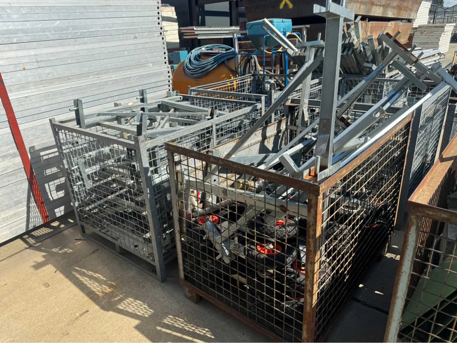 Aluminium dakrand beveiliging; 66 aluminium frames van aluminium met lengte 3000 mm; hoogte van aluminium frames is 595 mm; compleet met steunmaterialen; gedeelte op aanhangwagen; stalen frame op de aanhangwagen is een hijsbok; deze kan van de aanhanger worden gehesen en op het dak worden neergezet; materiaal dat in stalen krat zit hoort ook bij deze kavel; stalen kratten zitten bij het kavel; betreft complete dakrand beveiliging; aanhangwagen dient overgeschreven te worden;
