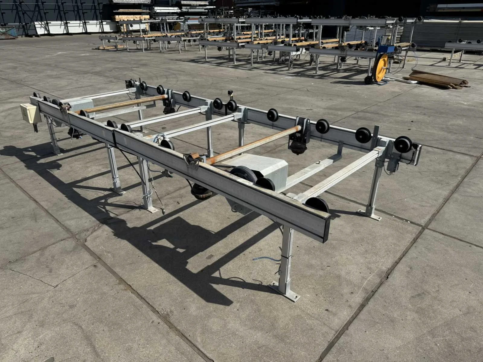 Voor tafel breedte 1250 mm; met stalen lucht balgen; voorzien van 2 elektromotoren en aandrijfwielen Merk: Kg systems Totale afmeting L: 4220mm Totale afmeting Breedte: 1380mm Totale afmeting Hoogte: 740mm
