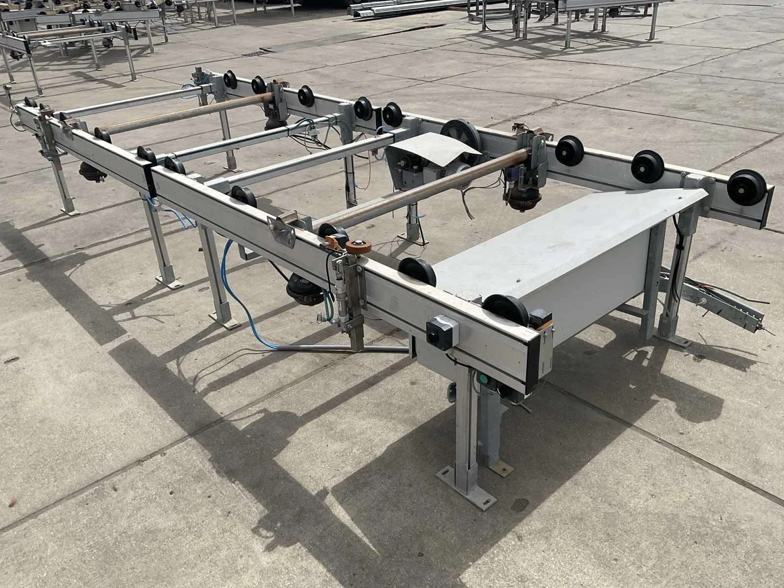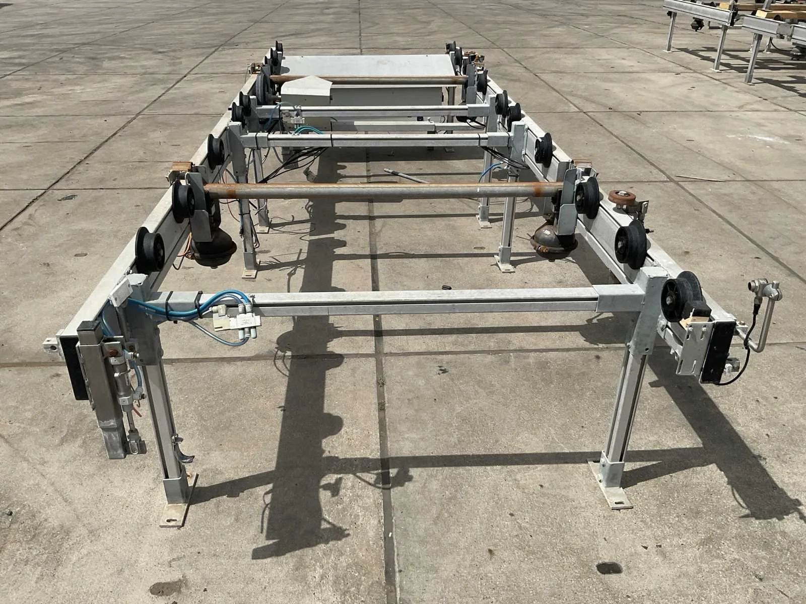 Voor tafel breedte 1250 mm; met stalen lucht balgen; en schakelkast met aansturing; Merk: Kg systems Totale afmeting L: 4220mm Totale afmeting Breedte: 1380mm Totale afmeting Hoogte: 740mm