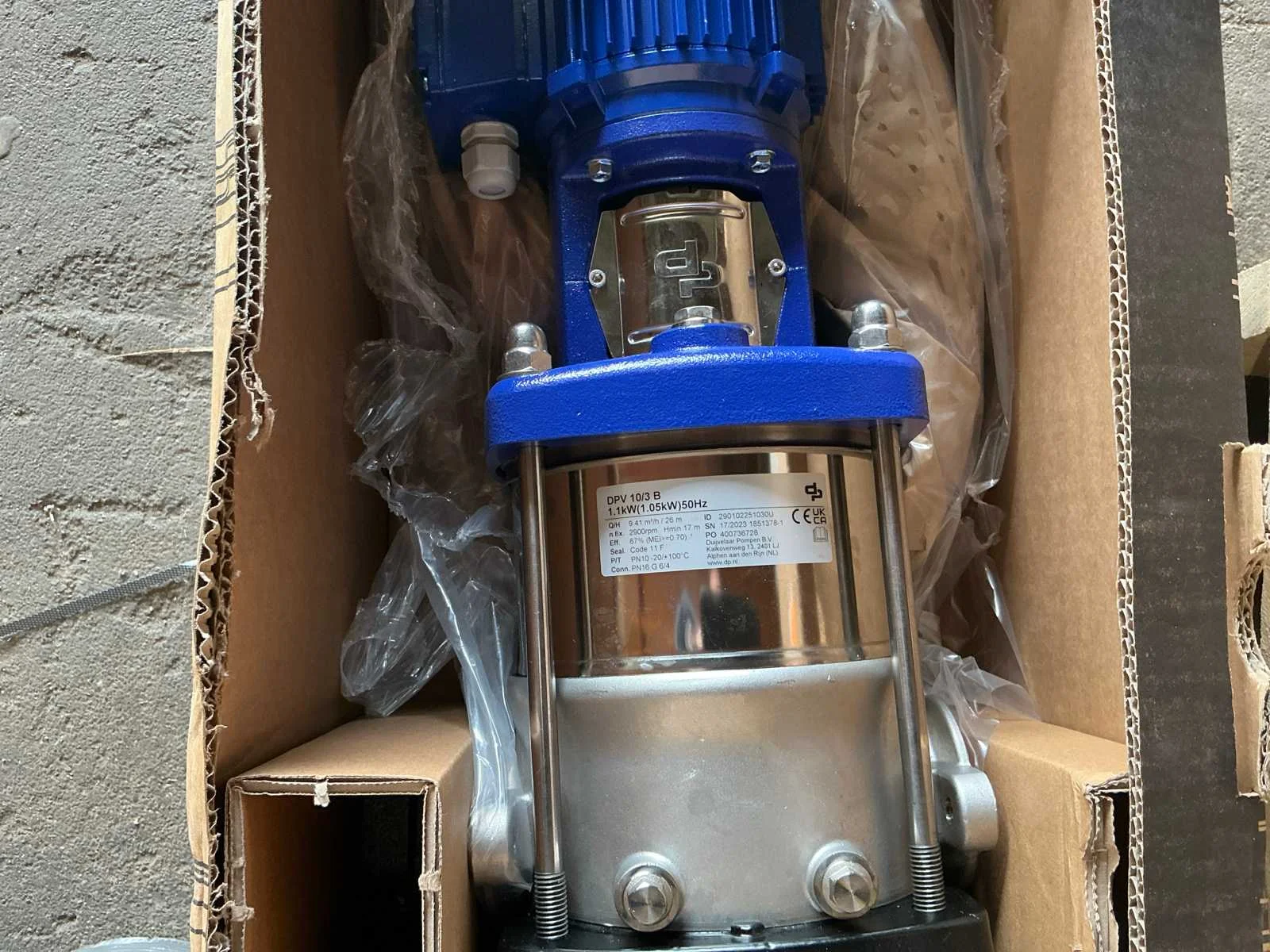 H=23, 2900 rpm Merk: DP Type: DPV 10/3 B Vermogen: 1.1kW Capaciteit.: 9400l/hr Totale afmeting L: 600mm