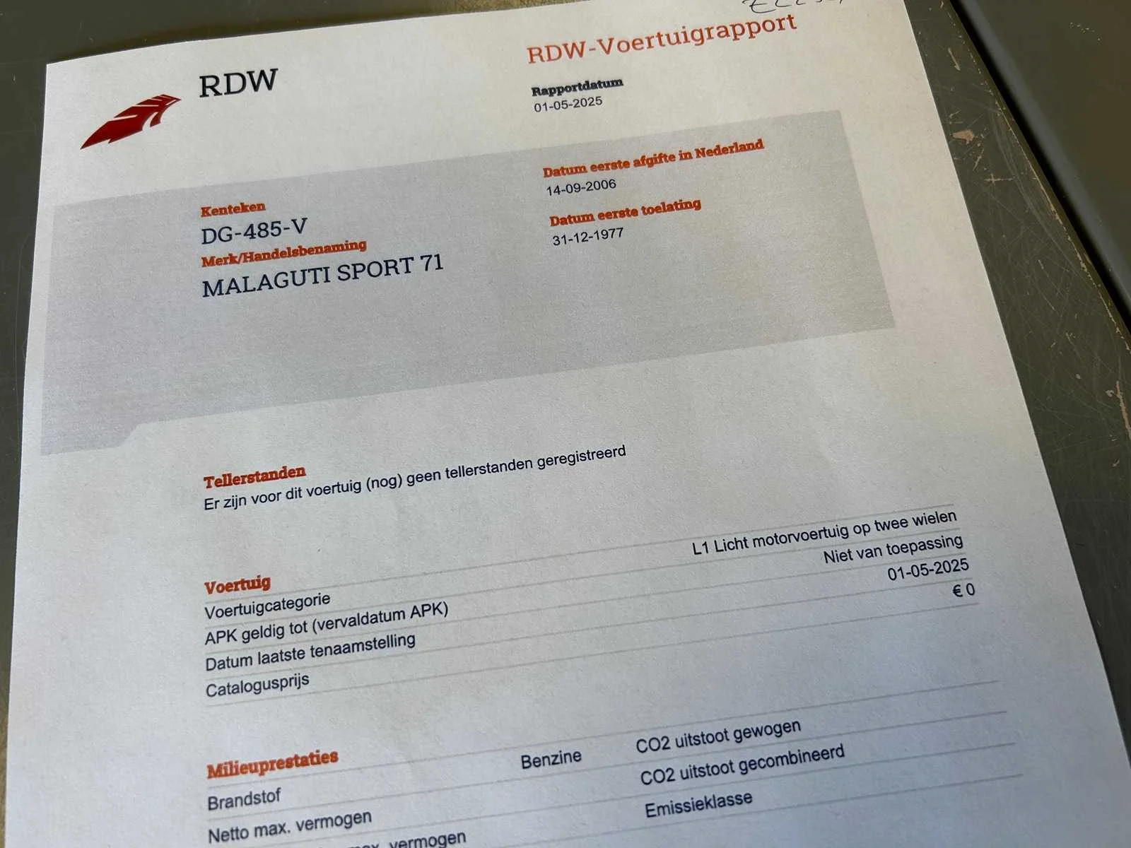 Start en rijdt, concoursstaat Maak een afspraak voor de kijkdag via hollandshoeve@solcon.nl Tuesday, 21 Okt. 2025 van 9 tot 12 uur. Merk: Malaguti Model: Sport Type: 71 Handelsbenaming: SPORT 71 Kenteken: dg485v Datum eerste toelating: 1977-12-31 Brandstof: benzine Kleur: niet van toepassing Bouwjaar: 1977