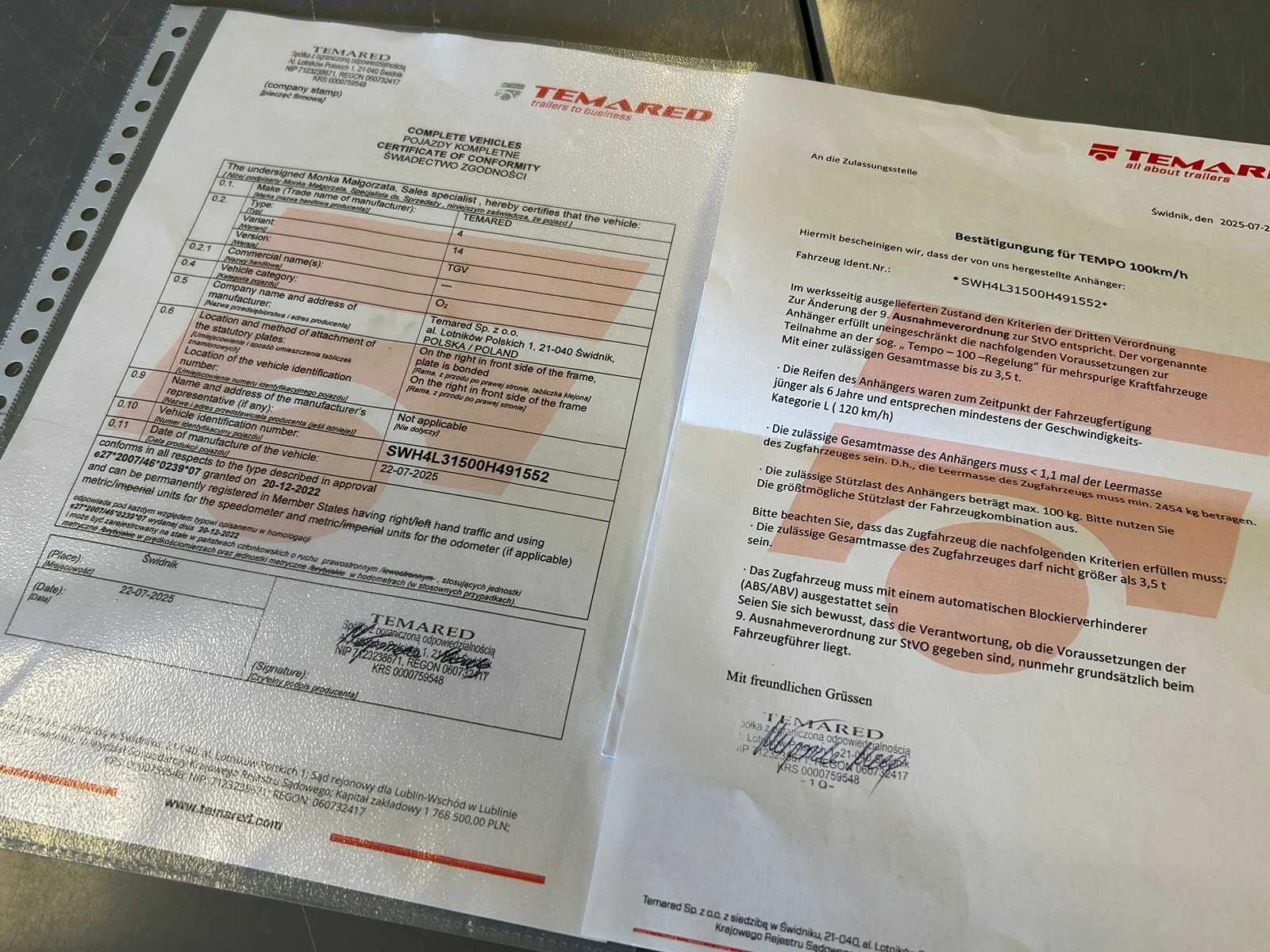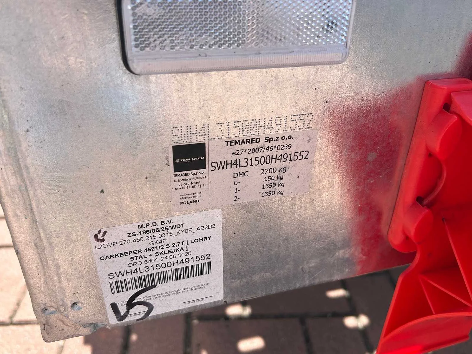 Nieuwe aanhanger, wordt geleverd met COC Maak een afspraak voor de kijkdag via hollandshoeve@solcon.nl do 21 Okt 2025 van 09:00 tot 12:00 Afmetingen (cm): 5550 x 2040 x 800 middenvloer 2 wielblokken 2 spanbanden Reservewiel beugel Reservewiel 250kg neuswiel Knott Handlier Kantelbaar met rijplaten 1.3meter Merk: Temared Type: Machine transporter Model: 2700KG kantelbaar Bouwjaar: 2025 Chassisnummer: SWH4L31500 Aantal assen: 2 Laadbak afmeting l: 405cm Laadbak afmeting b: 205cm Ledig gewicht: 704kg Laadvermogen: 1996kg Datum eerste toelating: 2025-08-30 Datum eerste toelating (NL): 2025-08-30 Hoogte: 58cm Lengte: 555cm Breedte: 205cm