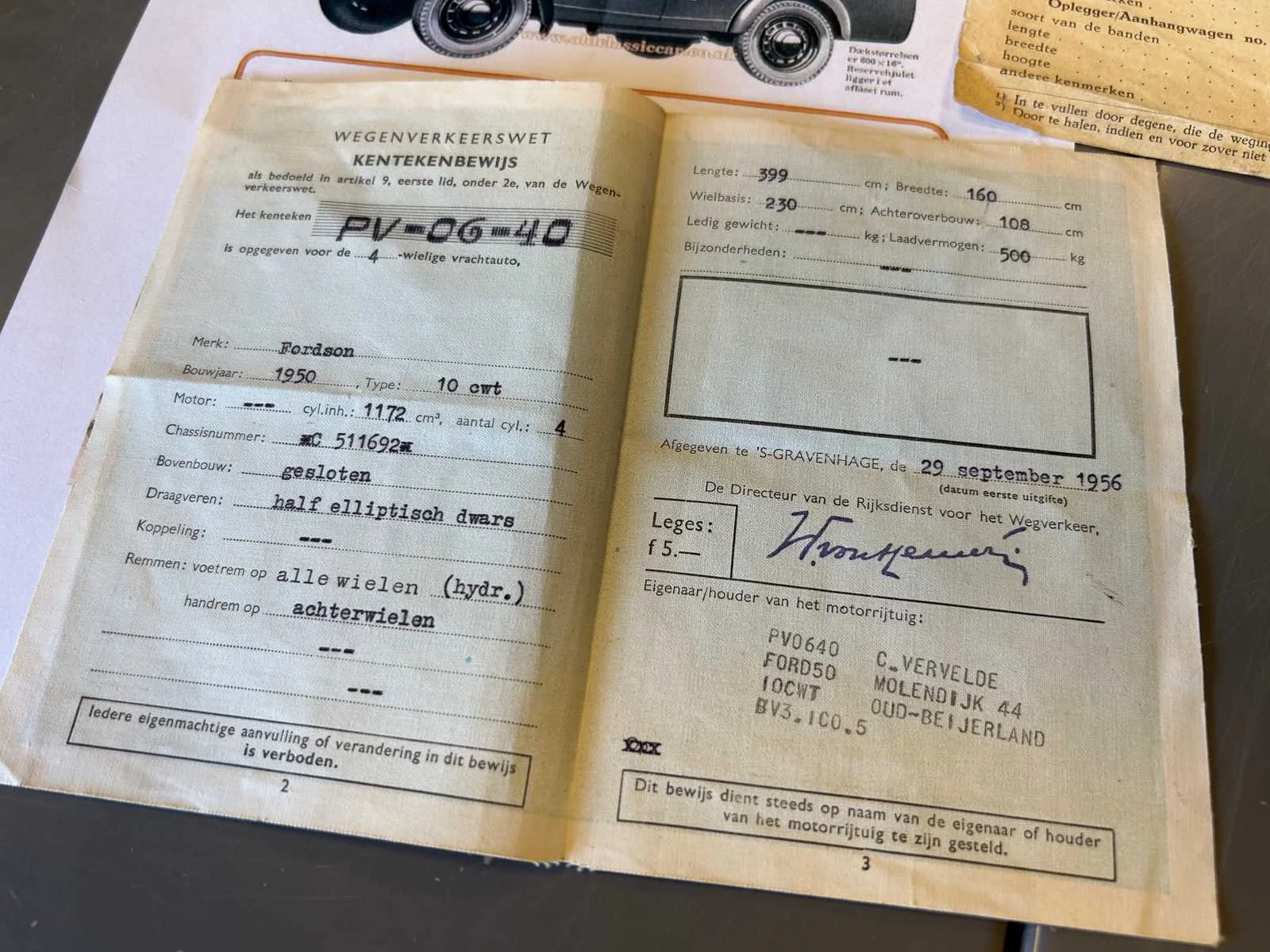 Schuurvonst voertuig heeft geruime tijd stil gestaan, voertuig is compleet, en ingeschreven geweest bij RDW NL Maak een afspraak voor de kijkdag via hollandshoeve@solcon.nl do 21 Okt 2025 van 09:00 tot 12:00 Kenteken: PV-06-40 Merk: Fordson van Type: E83W 10CWT Bouwjaar: 1950 Chassisnummer: 0511692 Afgelezen kilometerstand: 38706 Brandstof: Benzine Datum eerste toelating (NL): 29-09-1956 Vermogen (pk): 10 Aantal zitplaatsen: 2 Aantal cilinders: 4