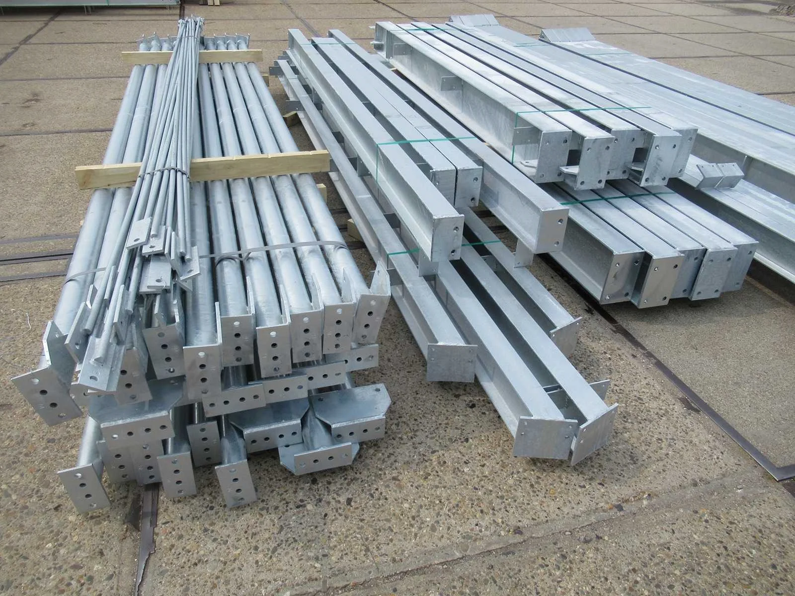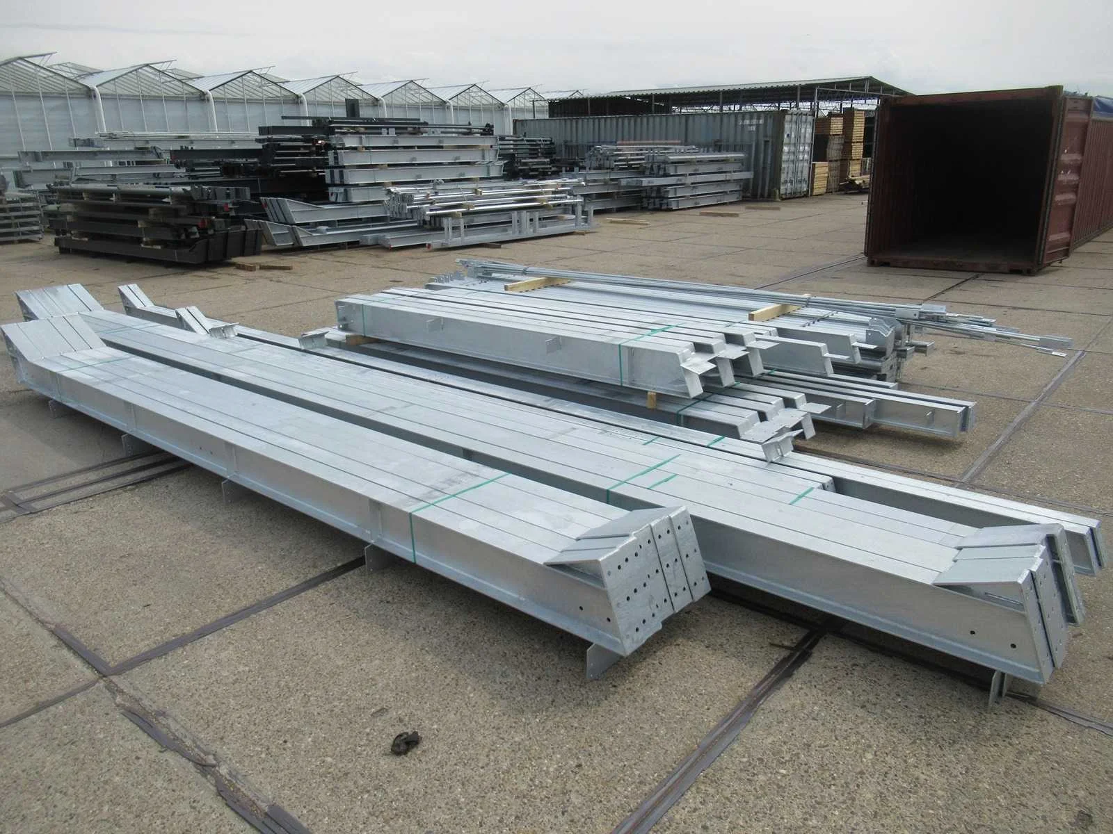 Nederlandse productie; kapschuur model met een vrije overspanning; spanten h.o.h. 5000mm; staalberekeningen; staaltekeningen; montagetekeningen; ankerplan; staal genummerd volgens montageplan; dakhelling 20 graden; 5 sets tussenspanten IPE 270/240; 2 sets eindspanten IPE 200/180 met windstijlen; voorzien van drukkokers; windverbanden; gordinglippen; bouten en moeren; meestort ankers; staalconstructie volgens productnorm EN1090 (Certificaat na aankoop verkrijgbaar); kavel ligt netjes transportklaar en dient met 1 trailer opgehaald te worden; kavel wordt gratis met een heftruck geladen Materiaal: Thermisch verzinkt staal Type: kapschuur Bouwjaar: 2025 Totaal oppervlakte: 450m² Nok hoogte: 6730mm Goot hoogte: 3500 en 4500mm Totale afmeting L: 30000mm Totale afmeting Breedte: 15000mm